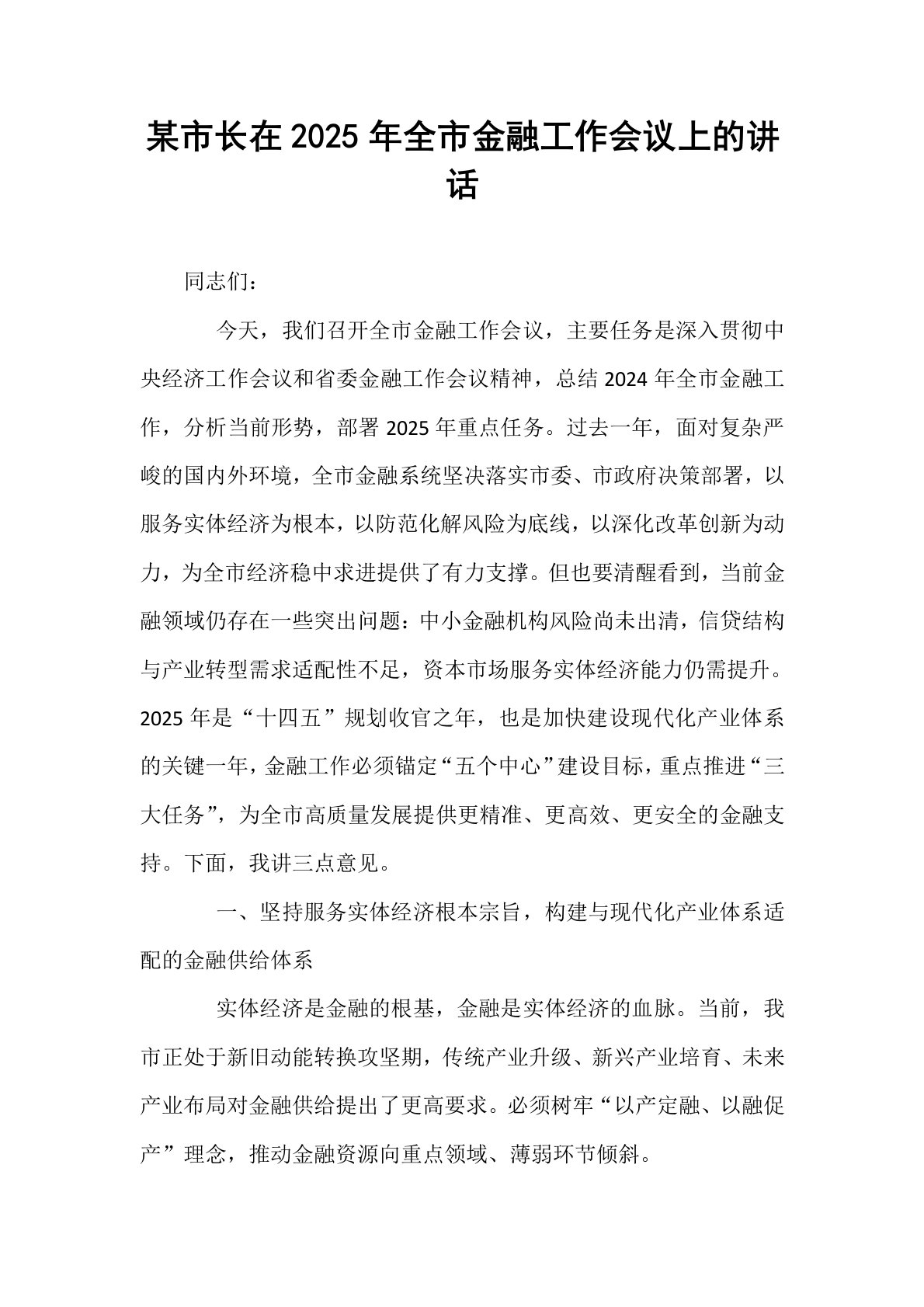 某市长在2025年全市金融工作会议上的讲话同志们:今天,我们召开全市金融工作会议,主要任务是深入贯彻中央经济工作会议和省委金融工作会议精神,总结2024年全市金融工作,分析当前形势,部署2025年重点任务。过去一年,面对复杂严峻的国内外环境,全市金融系统坚决落实市委、市政府决策部署,以服务实体经济为根本,以防范化解风险为底线,以深化改革创新为动力,为全市经济稳中求进提供了有力支撑。但也要清醒看到,当前金融领域仍存在一些突出问题:中小金融机构风险尚未出清,信贷结构与产业转型需求适配性不足,资本市场服务实体经济能力仍需提升。2025年是“十四五”规划收官之年,也是加快建设现代化产业体系的关键一年,...
