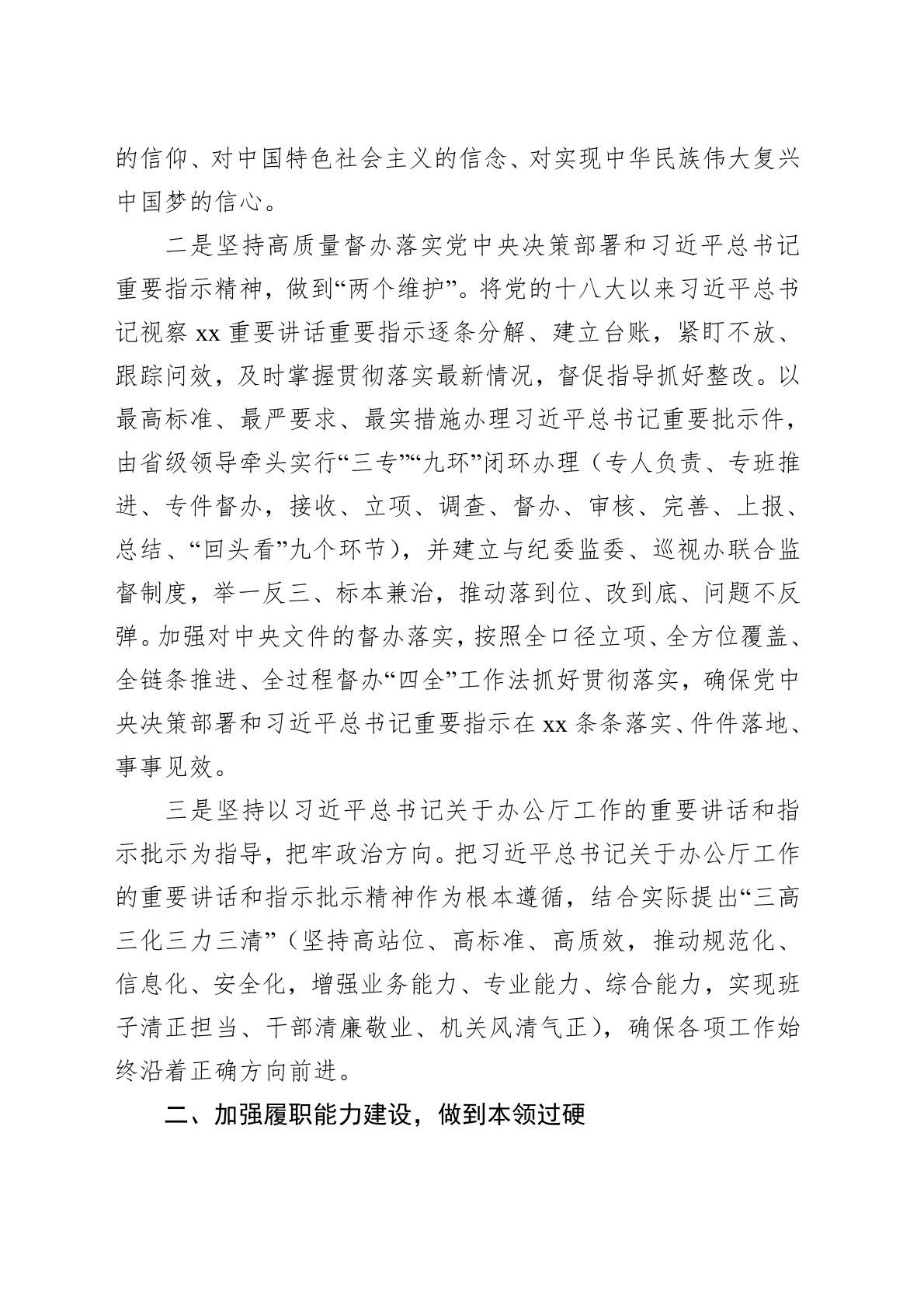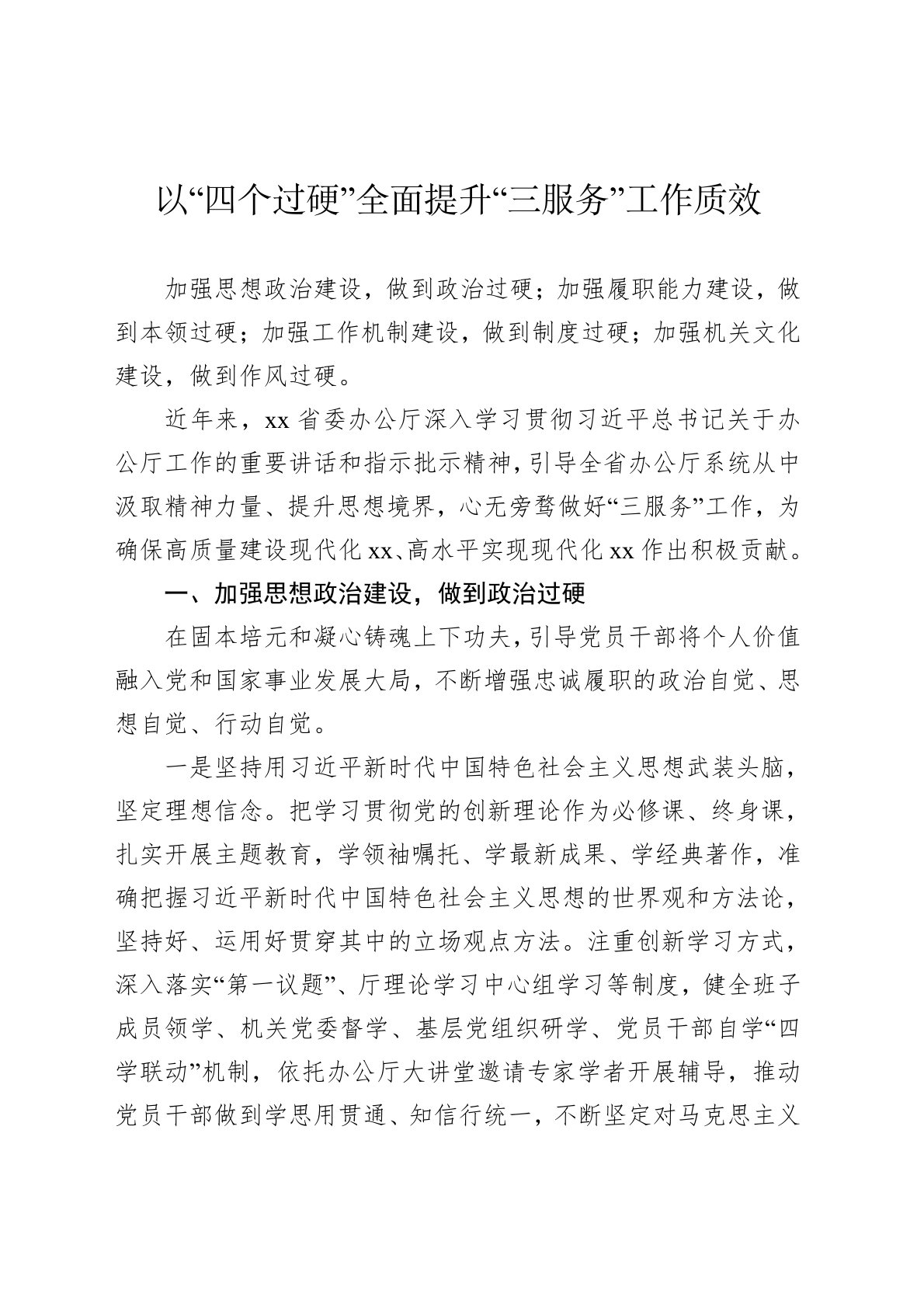 加强思想政治建设,做到政治过硬;加强履职能力建设,做到本领过硬;加强工作机制建设,做到制度过硬;加强机关文化建设,做到作风过硬。近年来,xx省委办公厅深入学习贯彻习近平总书记关于办公厅工作的重要讲话和指示批示精神,引导全省办公厅系统从中汲取精神力量、提升思想境界,心无旁骛做好“三服务”工作,为确保高质量建设现代化xx、高水平实现现代化xx作出积极贡献。一、加强思想政治建设,做到政治过硬在固本培元和凝心铸魂上下功夫,引导党员干部将个人价值融入党和国家事业发展大局,不断增强忠诚履职的政治自觉、思想自觉、行动自觉。一是坚持用习近平新时代中国特色社会主义思想武装头脑,坚定理想信念。把学习贯彻党的创新理...