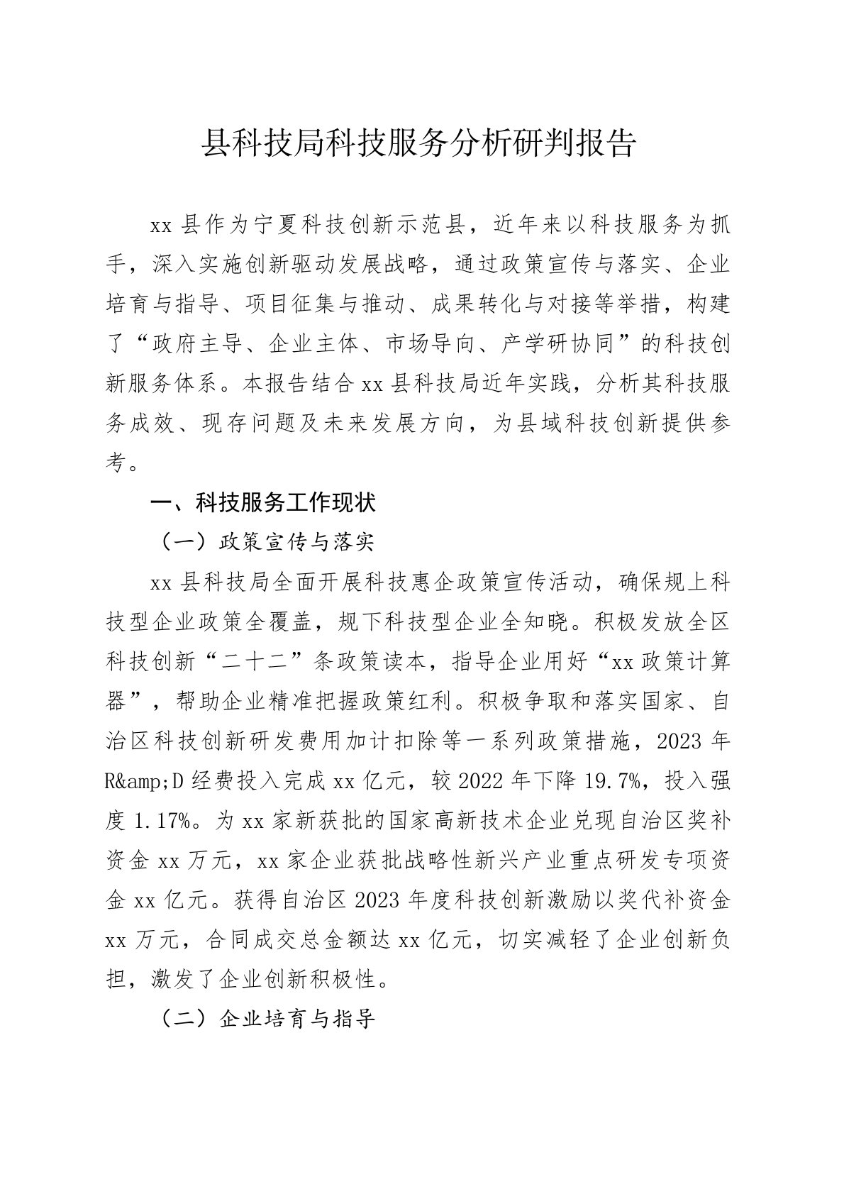 县科技局科技服务分析研判报告xx县作为宁夏科技创新示范县,近年来以科技服务为抓手,深入实施创新驱动发展战略,通过政策宣传与落实、企业培育与指导、项目征集与推动、成果转化与对接等举措,构建了“政府主导、企业主体、市场导向、产学研协同”的科技创新服务体系。本报告结合xx县科技局近年实践,分析其科技服务成效、现存问题及未来发展方向,为县域科技创新提供参考。一、科技服务工作现状(一)政策宣传与落实xx县科技局全面开展科技惠企政策宣传活动,确保规上科技型企业政策全覆盖,规下科技型企业全知晓。积极发放全区科技创新“二十二”条政策读本,指导企业用好“xx政策计算器”,帮助企业精准把握政策红利。积极争取和落实...