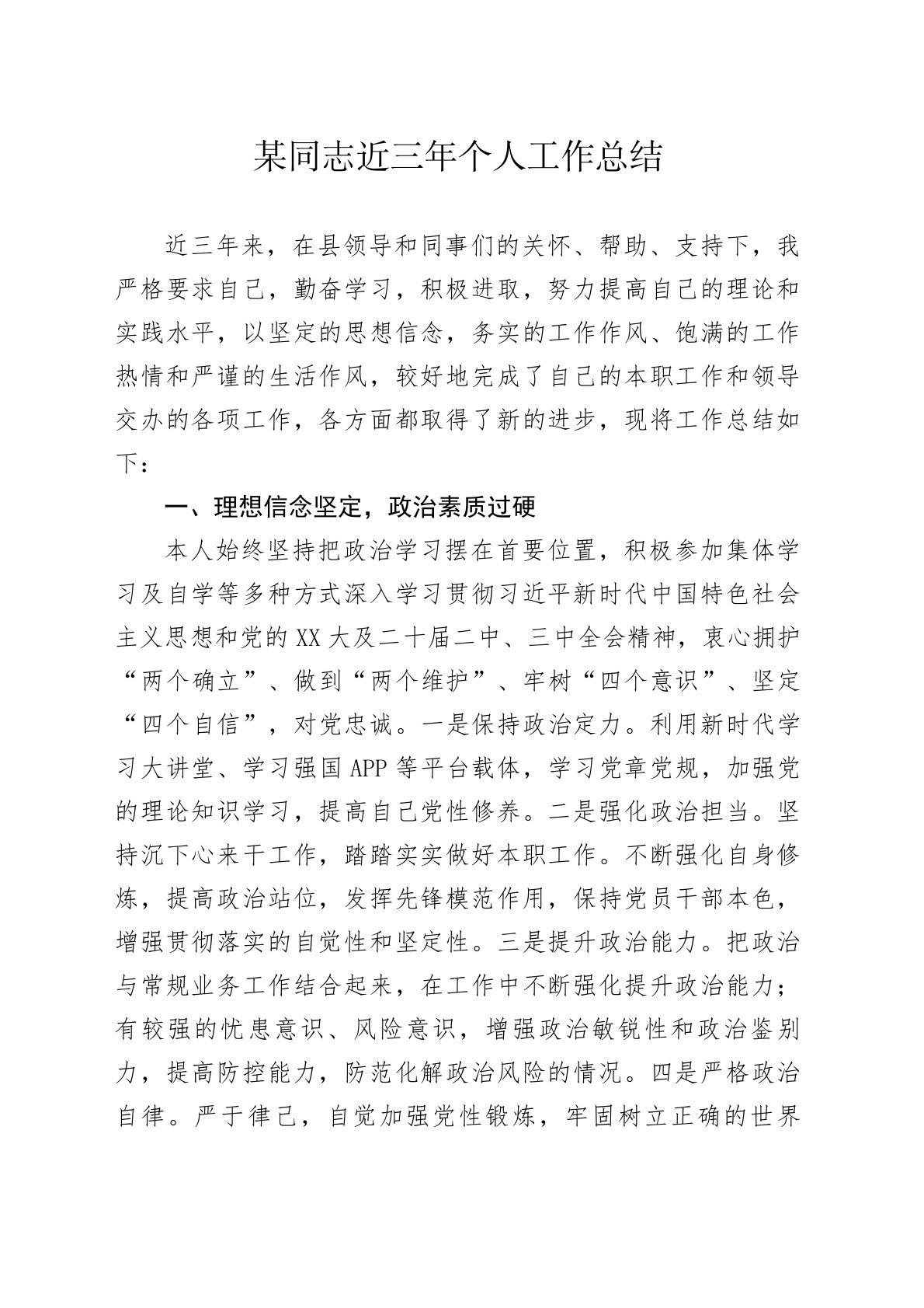 某同志近三年个人工作总结近三年来,在县领导和同事们的关怀、帮助、支持下,我严格要求自己,勤奋学习,积极进取,努力提高自己的理论和实践水平,以坚定的思想信念,务实的工作作风、饱满的工作热情和严谨的生活作风,较好地完成了自己的本职工作和领导交办的各项工作,各方面都取得了新的进步,现将工作总结如下:一、理想信念坚定,政治素质过硬本人始终坚持把政治学习摆在首要位置,积极参加集体学习及自学等多种方式深入学习贯彻习近平新时代中国特色社会主义思想和党的XX大及二十届二中、三中全会精神,衷心拥护“两个确立”、做到“两个维护”、牢树“四个意识”、坚定“四个自信”,对党忠诚。一是保持政治定力。利用新时代学习大讲堂...