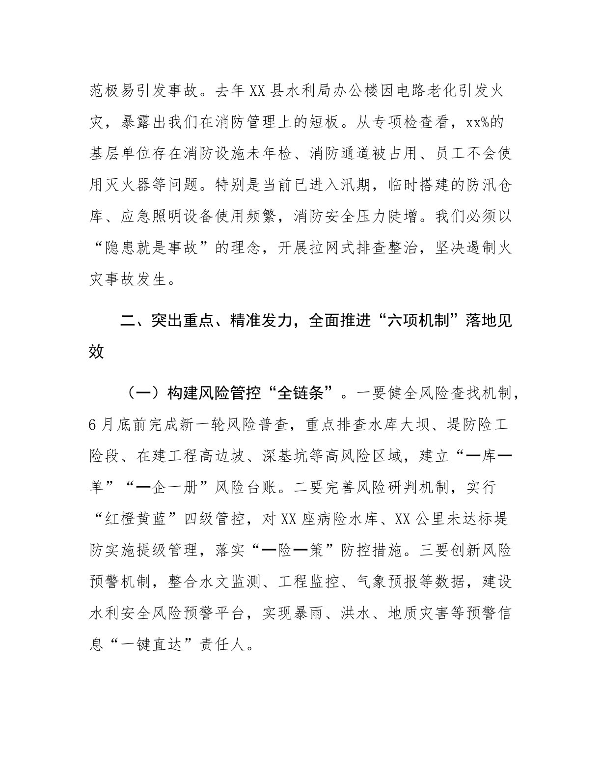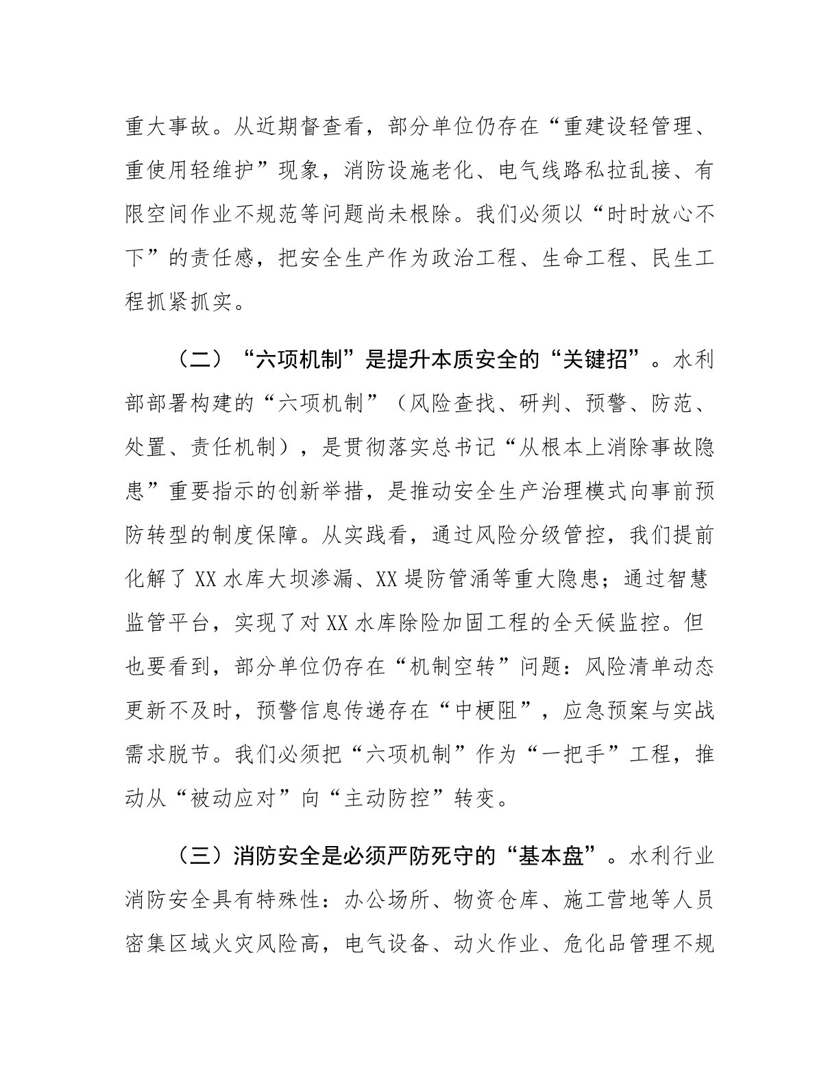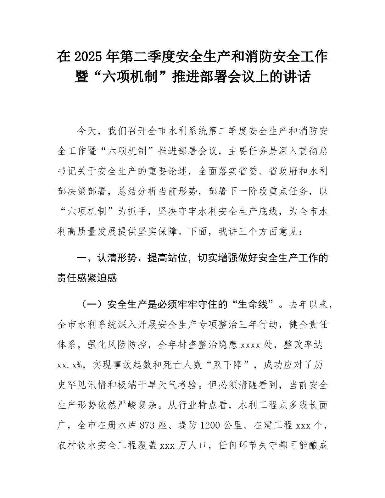 在2025年第二季度安全生产和消防安全工作暨“六项机制”推进部署会议上的讲话今天,我们召开全市水利系统第二季度安全生产和消防安全工作暨“六项机制”推进部署会议,主要任务是深入贯彻总书记关于安全生产的重要论述,全面落实省委、省政府和水利部决策部署,总结分析当前形势,部署下一阶段重点任务,以“六项机制”为抓手,坚决守牢水利安全生产底线,为全市水利高质量发展提供坚实保障。下面,我讲三个方面意见:一、认清形势、提高站位,切实增强做好安全生产工作的责任感紧迫感(一)安全生产是必须牢牢守住的“生命线”。去年以来,全市水利系统深入开展安全生产专项整治三年行动,健全责任体系,强化风险防控,全年排查整治隐患xx...