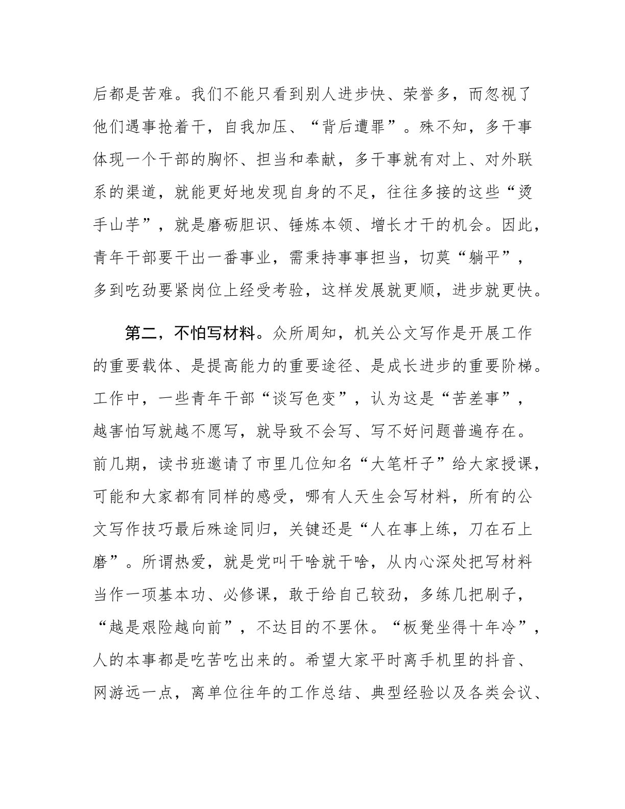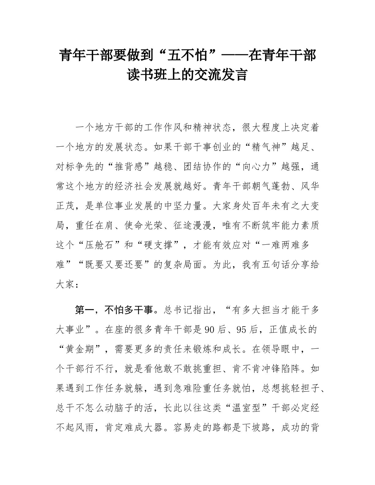 青年干部要做到“五不怕”——在青年干部读书班上的交流发言一个地方干部的工作作风和精神状态,很大程度上决定着一个地方的发展状态。如果干部干事创业的“精气神”越足、对标争先的“推背感”越稳、团结协作的“向心力”越强,通常这个地方的经济社会发展就越好。青年干部朝气蓬勃、风华正茂,是单位事业发展的中坚力量。大家身处百年未有之大变局,重任在肩、使命光荣、征途漫漫,唯有不断筑牢能力素质这个“压舱石”和“硬支撑”,才能有效应对“一难两难多难”“既要又要还要”的复杂局面。为此,我有五句话分享给大家:第一,不怕多干事。总书记指出,“有多大担当才能干多大事业”。在座的很多青年干部是90后、95后,正值成长的“黄金...