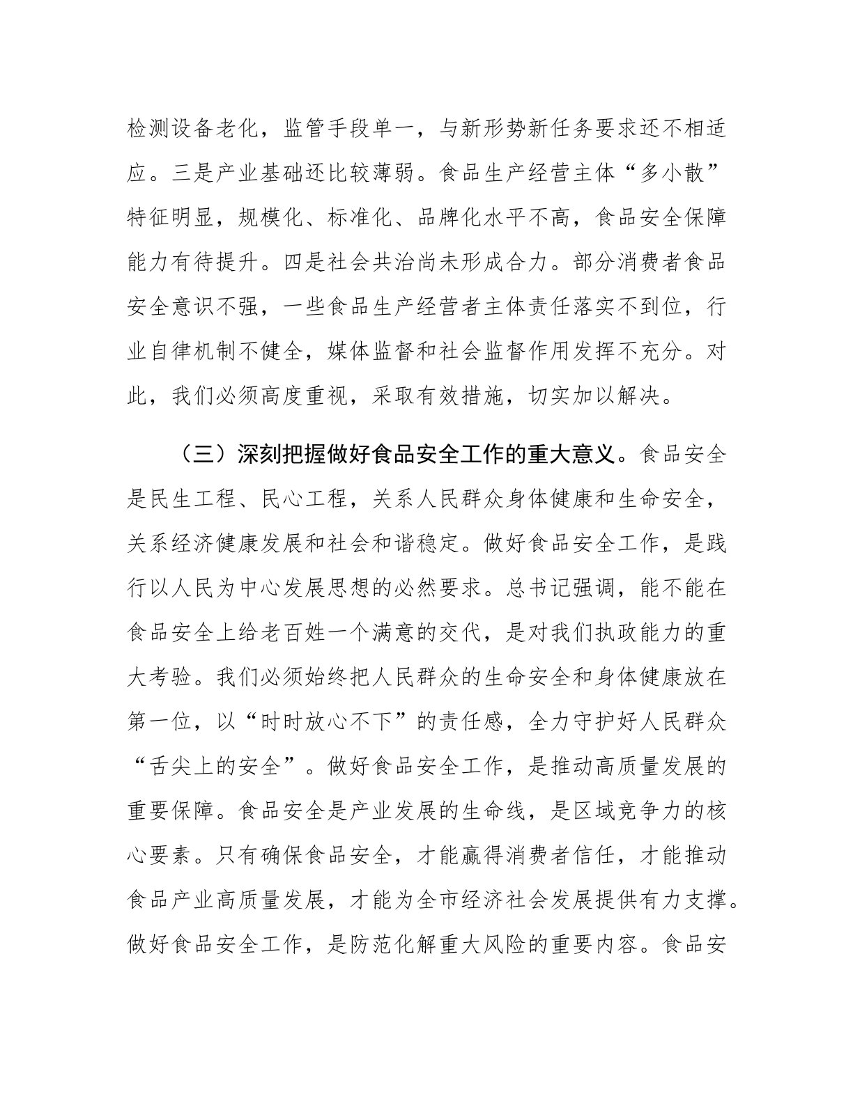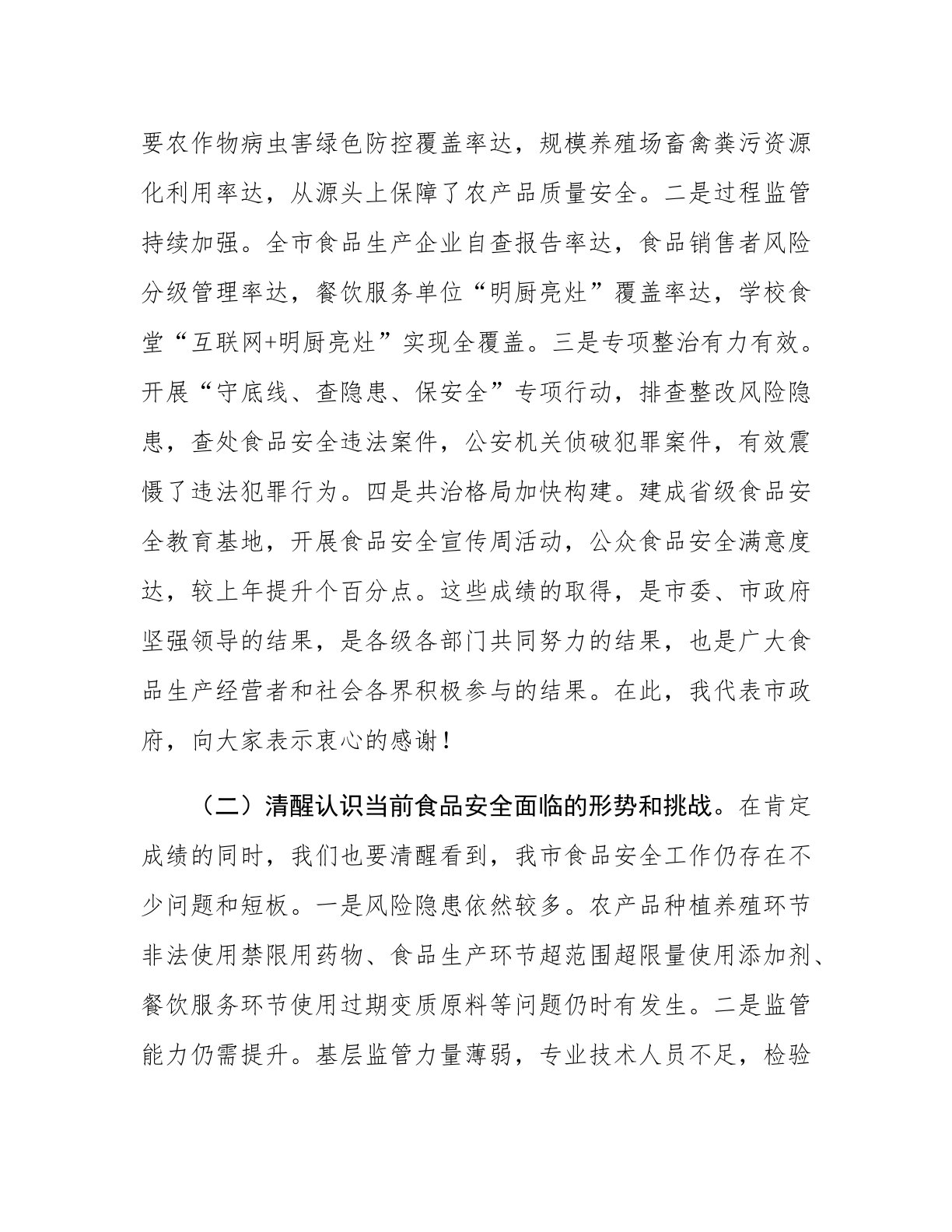 副市长在食品安全委员会全体(扩大)会议暨全市食品安全工作会议上的讲话同志们:今天,我们召开食品安全委员会全体(扩大)会议暨全市食品安全工作会议,主要任务是深入贯彻总书记关于食品安全“四个最严”重要指示精神,全面落实党中央、国务院和省委、省政府决策部署,总结2024年全市食品安全工作,分析当前形势,部署2025年重点任务。刚才,市食安办通报了2024年食品安全工作情况,市农业农村局、市市场监管局、市公安局分别作了交流发言,讲得都很好,希望大家认真抓好落实。下面,我讲三点意见。一、认清形势,提高站位,切实增强做好食品安全工作的责任感和使命感(一)充分肯定2024年全市食品安全工作成效。过去一年,面...