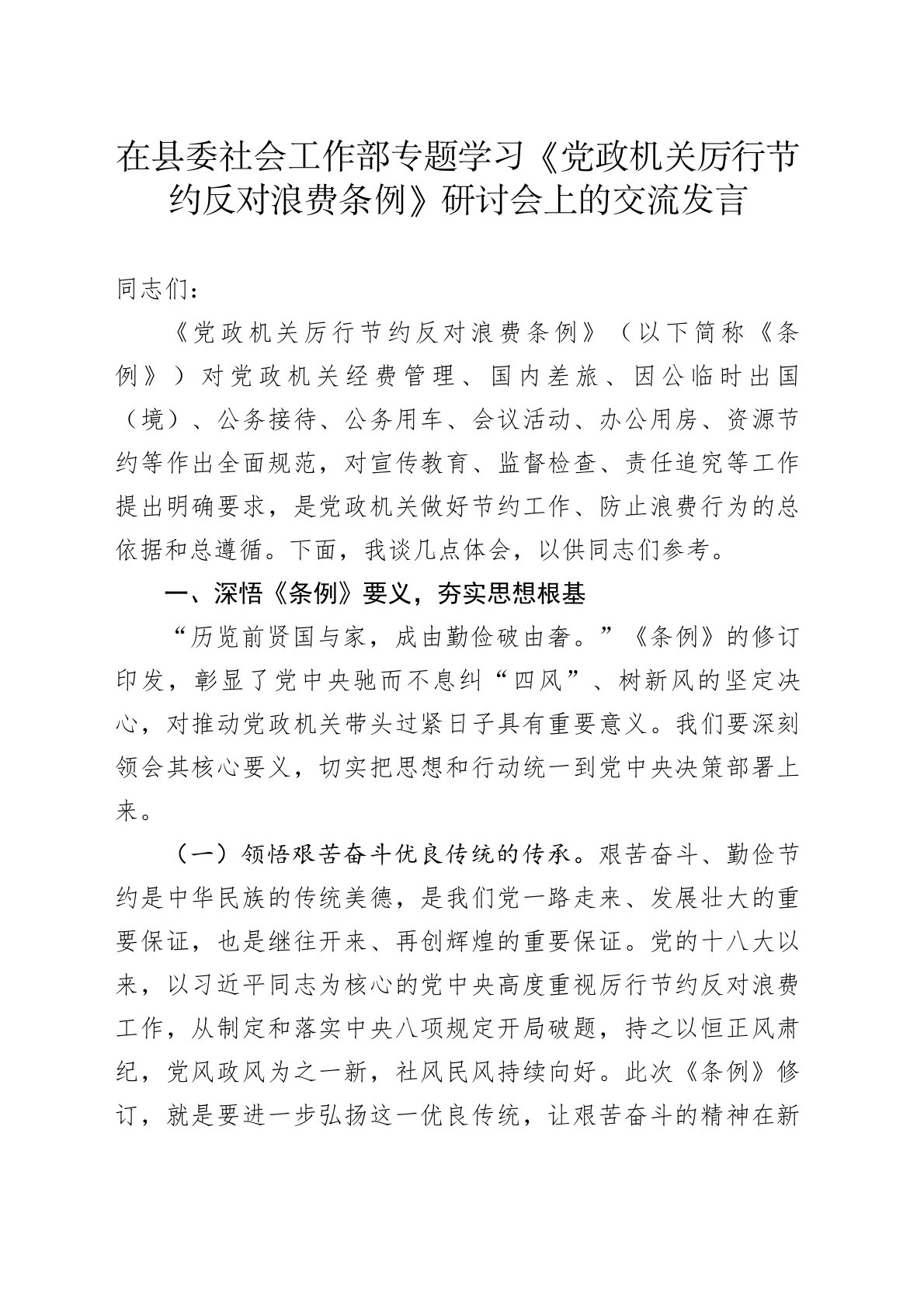在县委社会工作部专题学习《党政机关厉行节约反对浪费条例》研讨会上的交流发言同志们:《党政机关厉行节约反对浪费条例》(以下简称《条例》)对党政机关经费管理、国内差旅、因公临时出国(境)、公务接待、公务用车、会议活动、办公用房、资源节约等作出全面规范,对宣传教育、监督检查、责任追究等工作提出明确要求,是党政机关做好节约工作、防止浪费行为的总依据和总遵循。下面,我谈几点体会,以供同志们参考。一、深悟《条例》要义,夯实思想根基“历览前贤国与家,成由勤俭破由奢。”《条例》的修订印发,彰显了党中央驰而不息纠“四风”、树新风的坚定决心,对推动党政机关带头过紧日子具有重要意义。我们要深刻领会其核心要义,切实把...