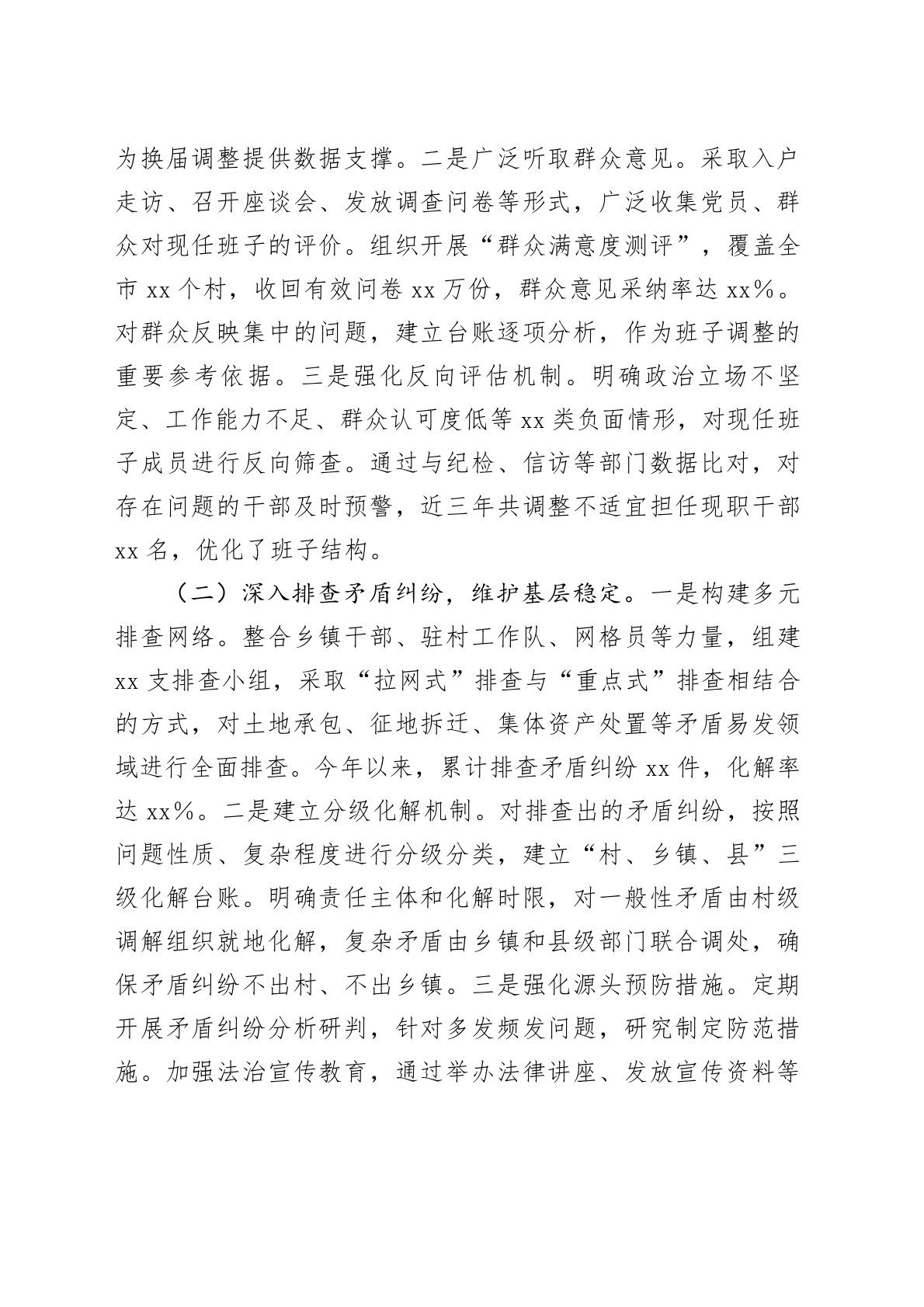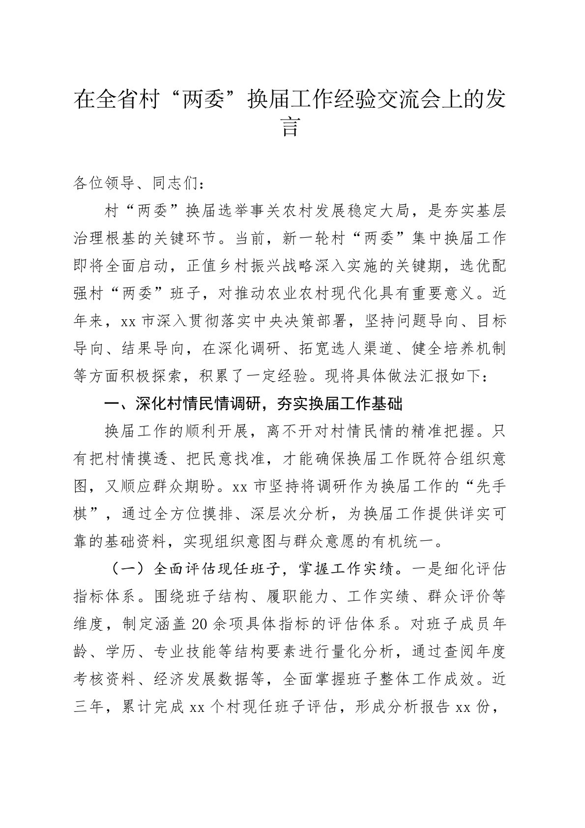 在全省村“两委”换届工作经验交流会上的发言各位领导、同志们:村“两委”换届选举事关农村发展稳定大局,是夯实基层治理根基的关键环节。当前,新一轮村“两委”集中换届工作即将全面启动,正值乡村振兴战略深入实施的关键期,选优配强村“两委”班子,对推动农业农村现代化具有重要意义。近年来,xx市深入贯彻落实中央决策部署,坚持问题导向、目标导向、结果导向,在深化调研、拓宽选人渠道、健全培养机制等方面积极探索,积累了一定经验。现将具体做法汇报如下:一、深化村情民情调研,夯实换届工作基础换届工作的顺利开展,离不开对村情民情的精准把握。只有把村情摸透、把民意找准,才能确保换届工作既符合组织意图,又顺应群众期盼。x...