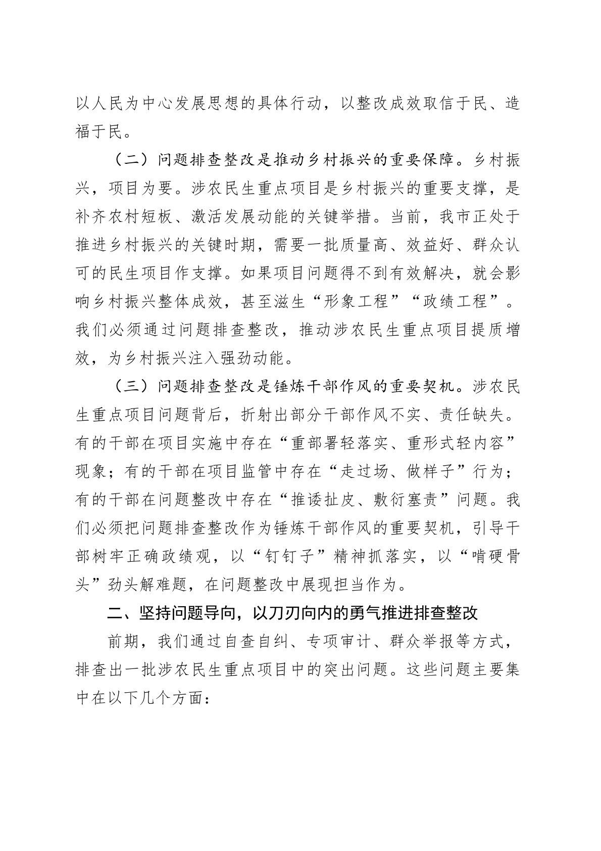 市长在全市涉农民生重点项目突出问题排查整改推进会议上的讲话今天,我们召开全市涉农民生重点项目突出问题排查整改推进会议,主要任务是深入贯彻落实习近平总书记关于民生工作的重要论述,按照省委、省政府部署要求,动员全市上下以刀刃向内的勇气、刮骨疗毒的决心,全面排查整治涉农民生重点项目中的突出问题,坚决打赢这场问题整改攻坚战,向全市人民交上一份满意的民生答卷。下面,我讲三点意见。一、提高政治站位,深刻认识涉农民生重点项目问题排查整改的极端重要性涉农民生重点项目是推进乡村振兴、实现共同富裕的重要抓手,是党委、政府向群众作出的庄严承诺。我们必须从政治和全局的高度,深刻认识问题排查整改的极端重要性。(一)问题...