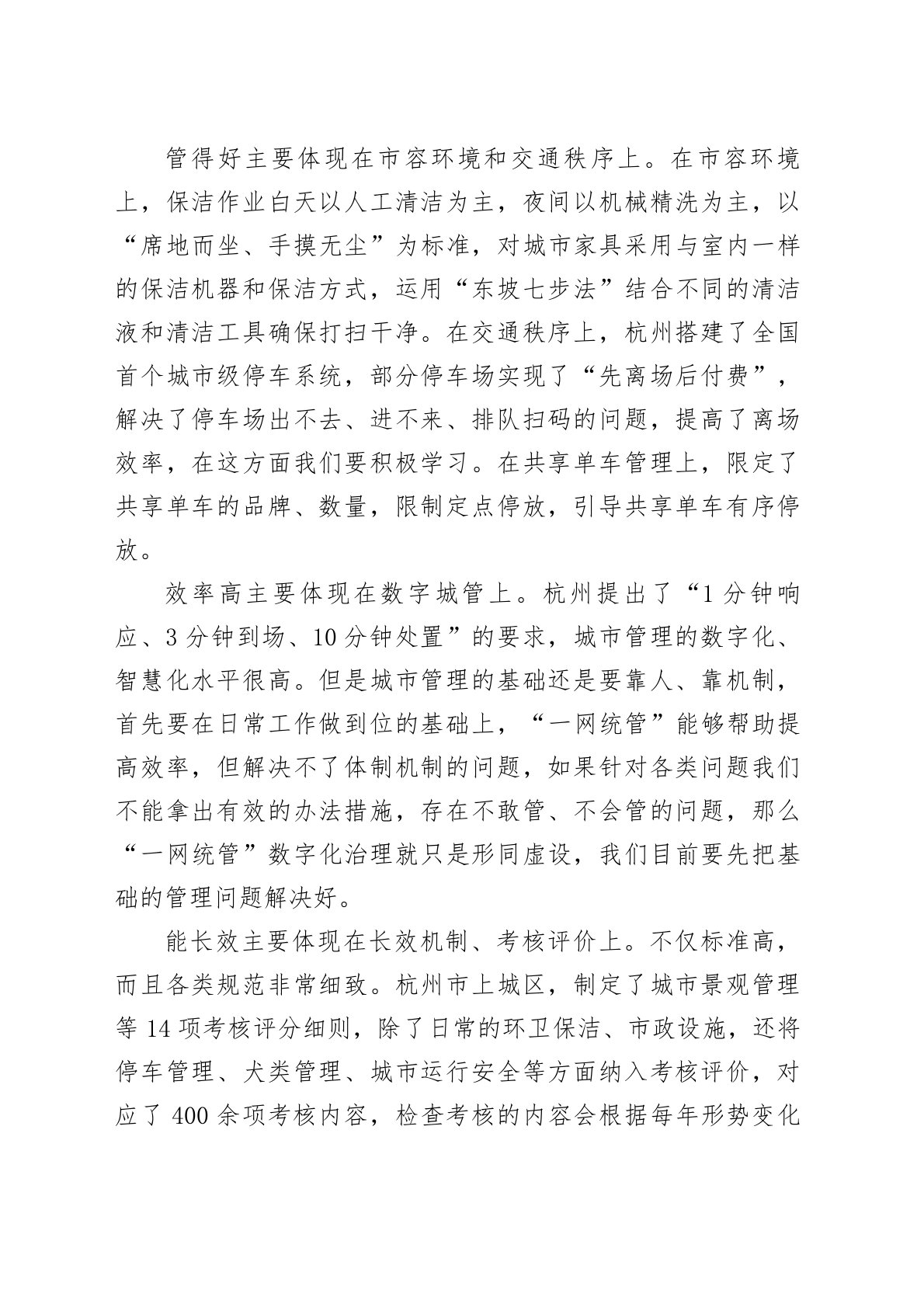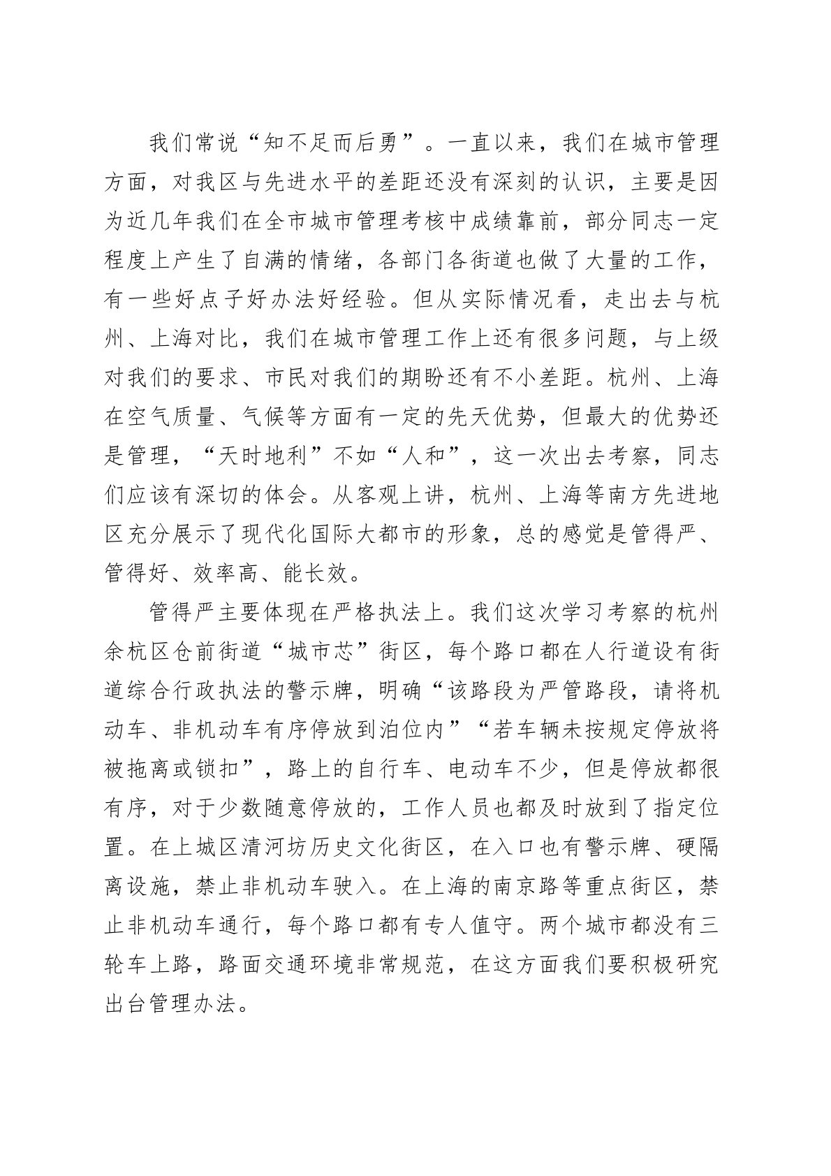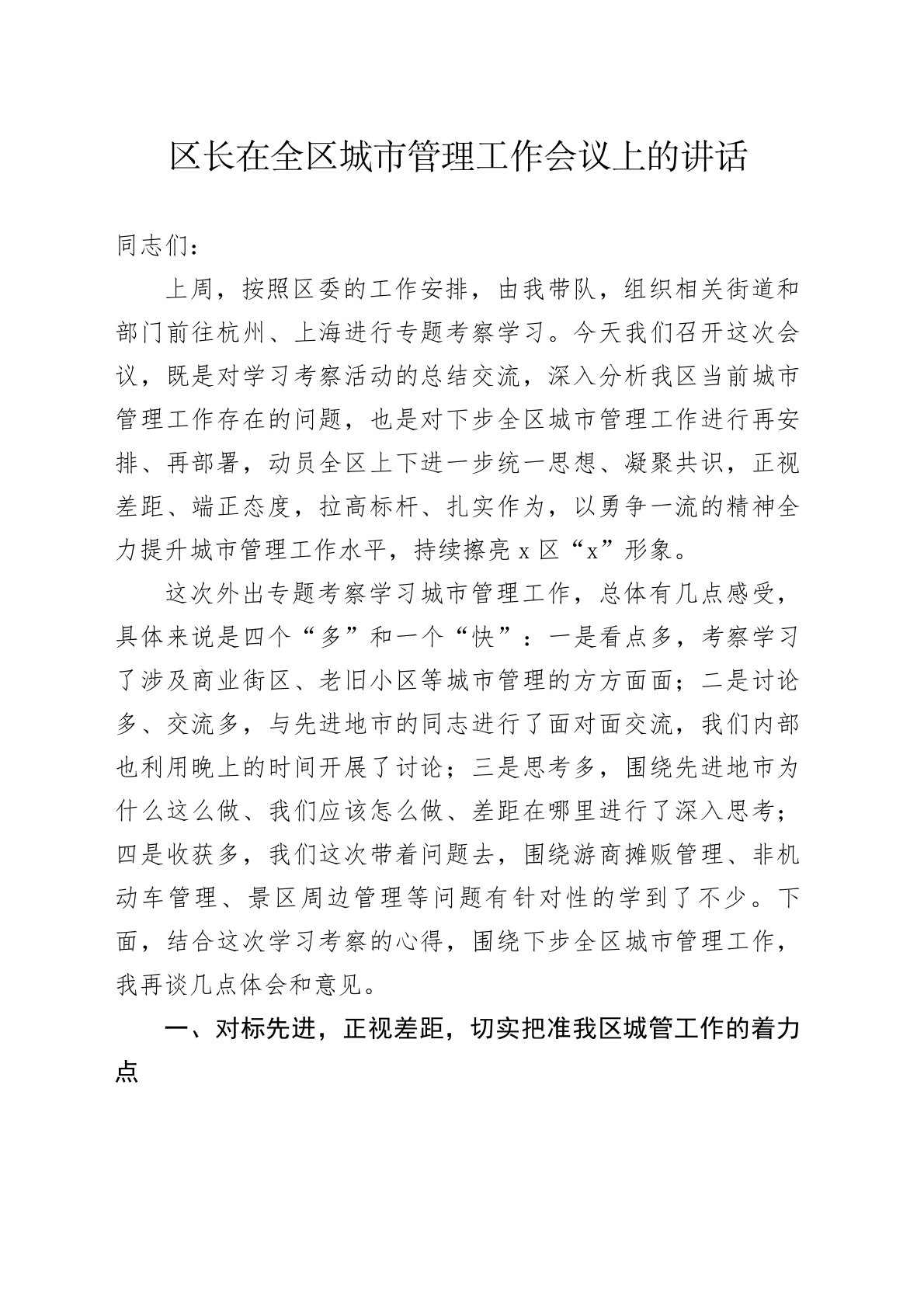 区长在全区城市管理工作会议上的讲话同志们:上周,按照区委的工作安排,由我带队,组织相关街道和部门前往杭州、上海进行专题考察学习。今天我们召开这次会议,既是对学习考察活动的总结交流,深入分析我区当前城市管理工作存在的问题,也是对下步全区城市管理工作进行再安排、再部署,动员全区上下进一步统一思想、凝聚共识,正视差距、端正态度,拉高标杆、扎实作为,以勇争一流的精神全力提升城市管理工作水平,持续擦亮x区“x”形象。这次外出专题考察学习城市管理工作,总体有几点感受,具体来说是四个“多”和一个“快”:一是看点多,考察学习了涉及商业街区、老旧小区等城市管理的方方面面;二是讨论多、交流多,与先进地市的同志进行...