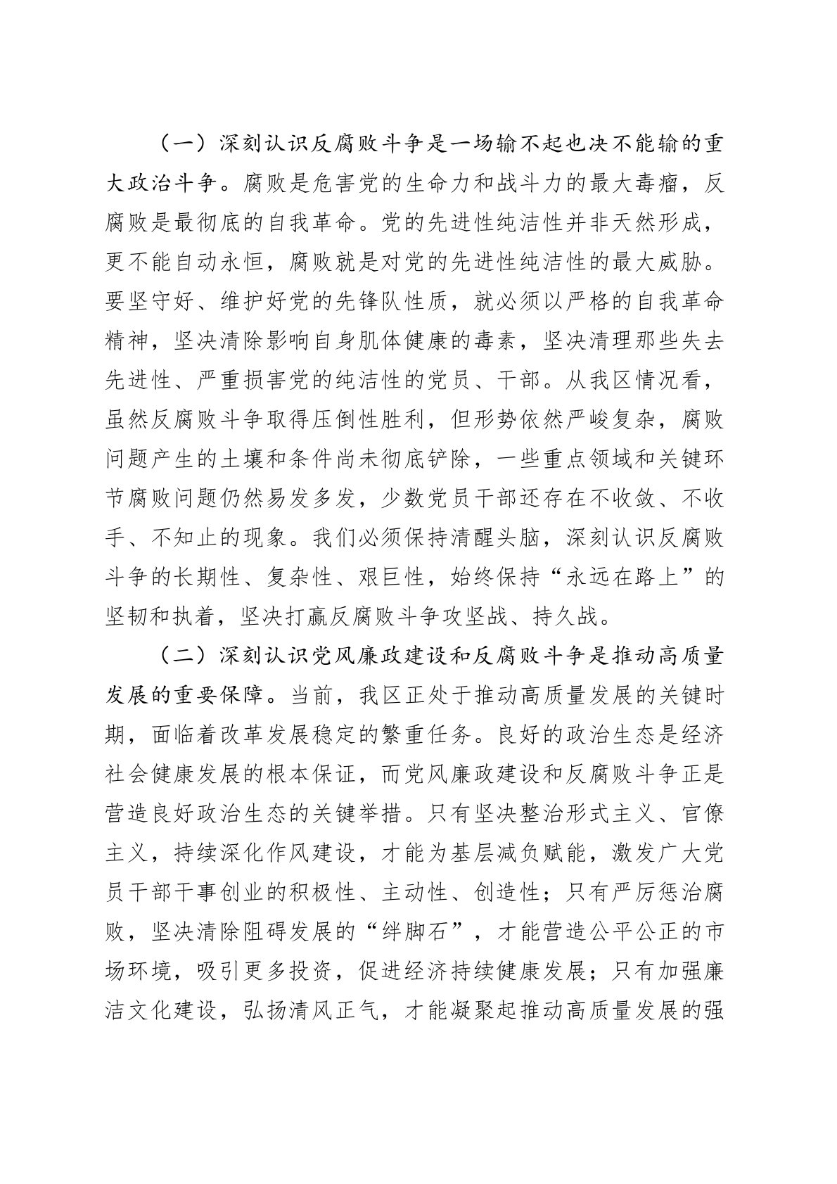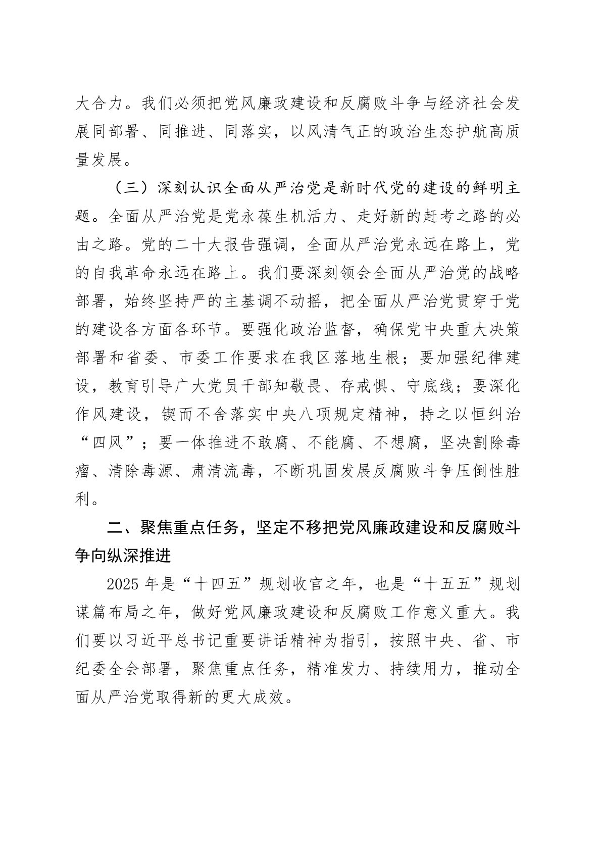 区委书记在2025年上半年召开党风廉政建设和反腐败工作会议上的讲话今天,我们召开全区党风廉政建设和反腐败工作会议,主要任务是深入学习贯彻习近平总书记关于党的自我革命的重要思想,全面贯彻落实党的二十届三中全会和中央、省、市纪委全会精神,总结2024年工作,部署2025年任务,坚定不移推进全面从严治党,为我区高质量发展提供坚强保障。刚才,XX同志代表区纪委作了工作报告,总结工作全面客观,分析问题深刻到位,部署任务重点突出,我完全赞同,请大家认真抓好落实。下面,我再讲几点意见。一、提高政治站位,深刻认识党风廉政建设和反腐败斗争的极端重要性党的十八大以来,以习近平同志为核心的党中央把全面从严治党纳入“...