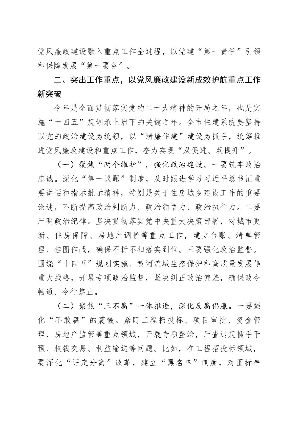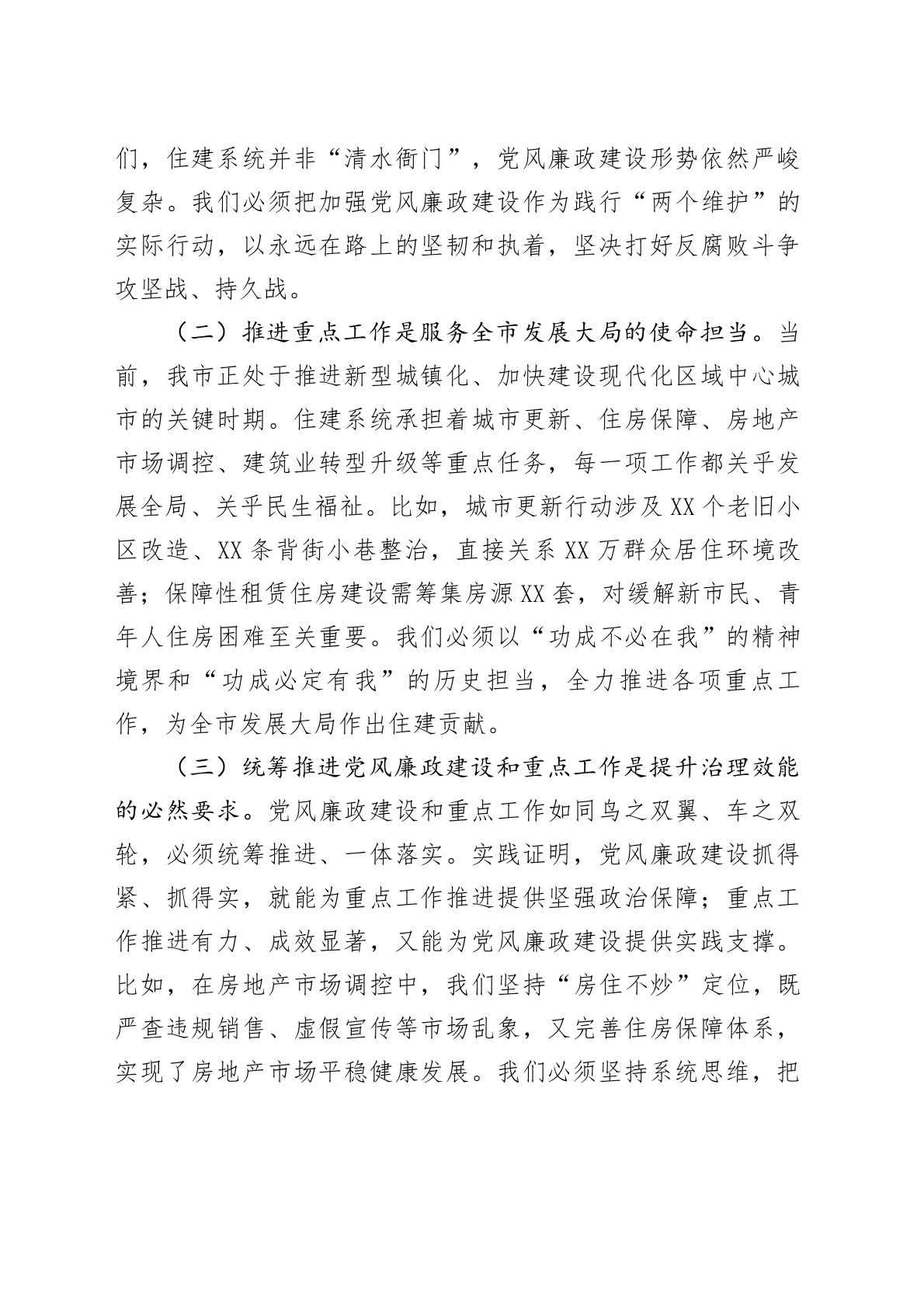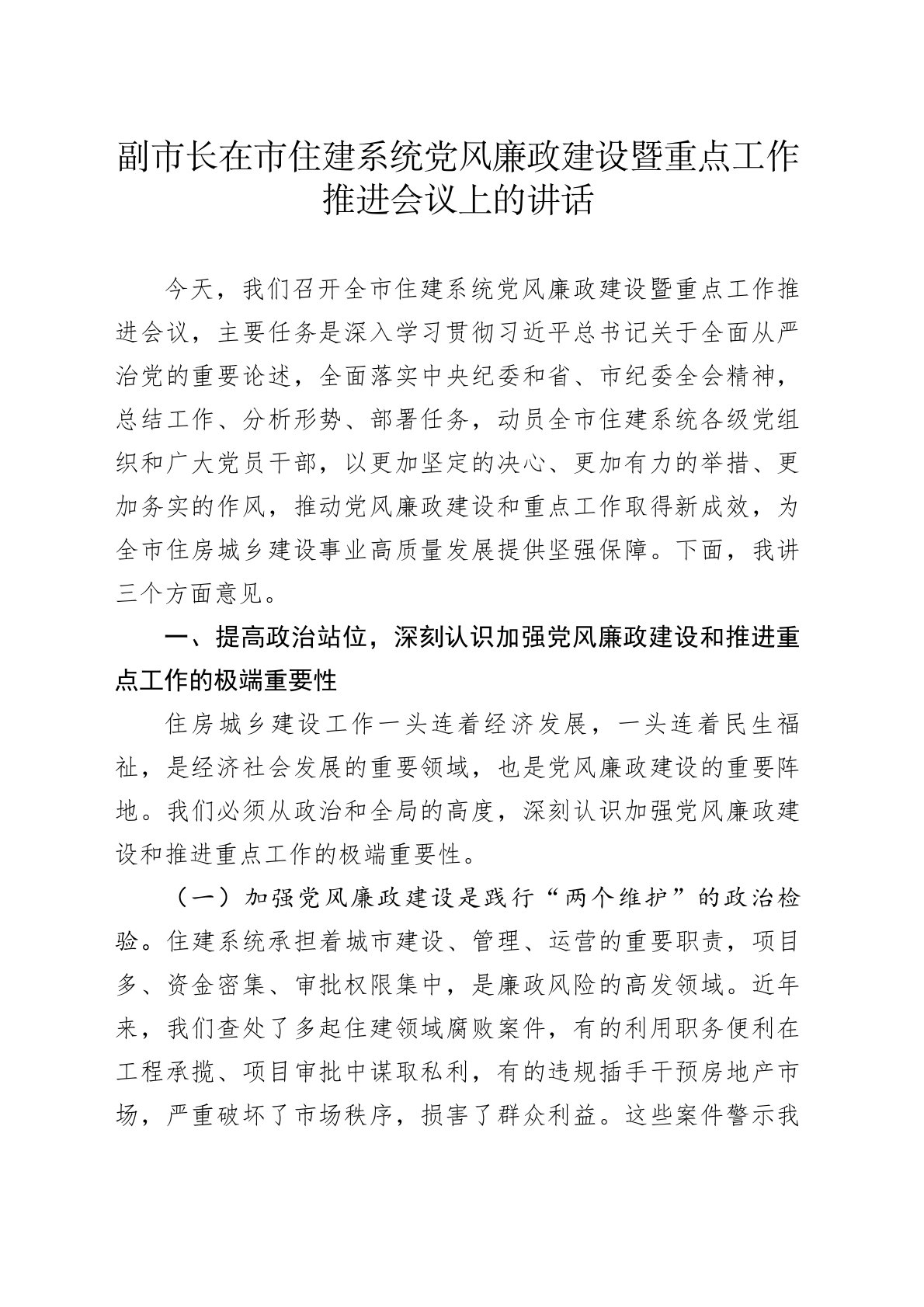 副市长在市住建系统党风廉政建设暨重点工作推进会议上的讲话今天,我们召开全市住建系统党风廉政建设暨重点工作推进会议,主要任务是深入学习贯彻习近平总书记关于全面从严治党的重要论述,全面落实中央纪委和省、市纪委全会精神,总结工作、分析形势、部署任务,动员全市住建系统各级党组织和广大党员干部,以更加坚定的决心、更加有力的举措、更加务实的作风,推动党风廉政建设和重点工作取得新成效,为全市住房城乡建设事业高质量发展提供坚强保障。下面,我讲三个方面意见。一、提高政治站位,深刻认识加强党风廉政建设和推进重点工作的极端重要性住房城乡建设工作一头连着经济发展,一头连着民生福祉,是经济社会发展的重要领域,也是党风廉...