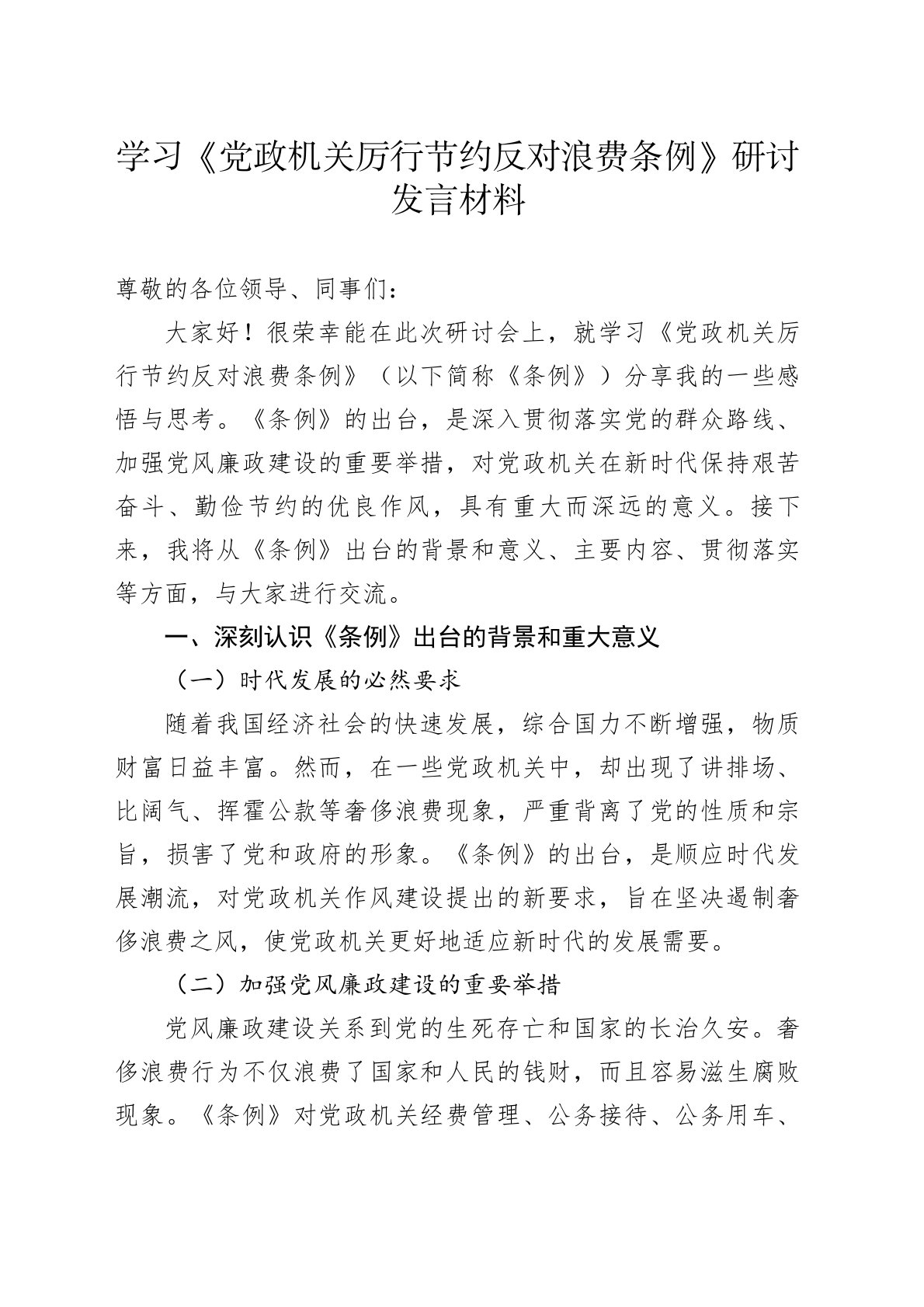 学习《党政机关厉行节约反对浪费条例》研讨发言材料尊敬的各位领导、同事们:大家好!很荣幸能在此次研讨会上,就学习《党政机关厉行节约反对浪费条例》(以下简称《条例》)分享我的一些感悟与思考。《条例》的出台,是深入贯彻落实党的群众路线、加强党风廉政建设的重要举措,对党政机关在新时代保持艰苦奋斗、勤俭节约的优良作风,具有重大而深远的意义。接下来,我将从《条例》出台的背景和意义、主要内容、贯彻落实等方面,与大家进行交流。一、深刻认识《条例》出台的背景和重大意义(一)时代发展的必然要求随着我国经济社会的快速发展,综合国力不断增强,物质财富日益丰富。然而,在一些党政机关中,却出现了讲排场、比阔气、挥霍公款等...