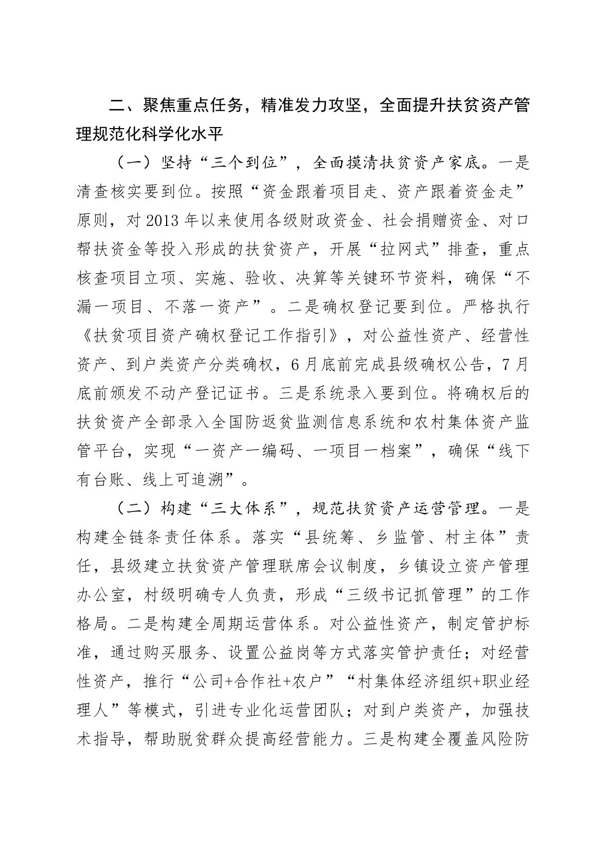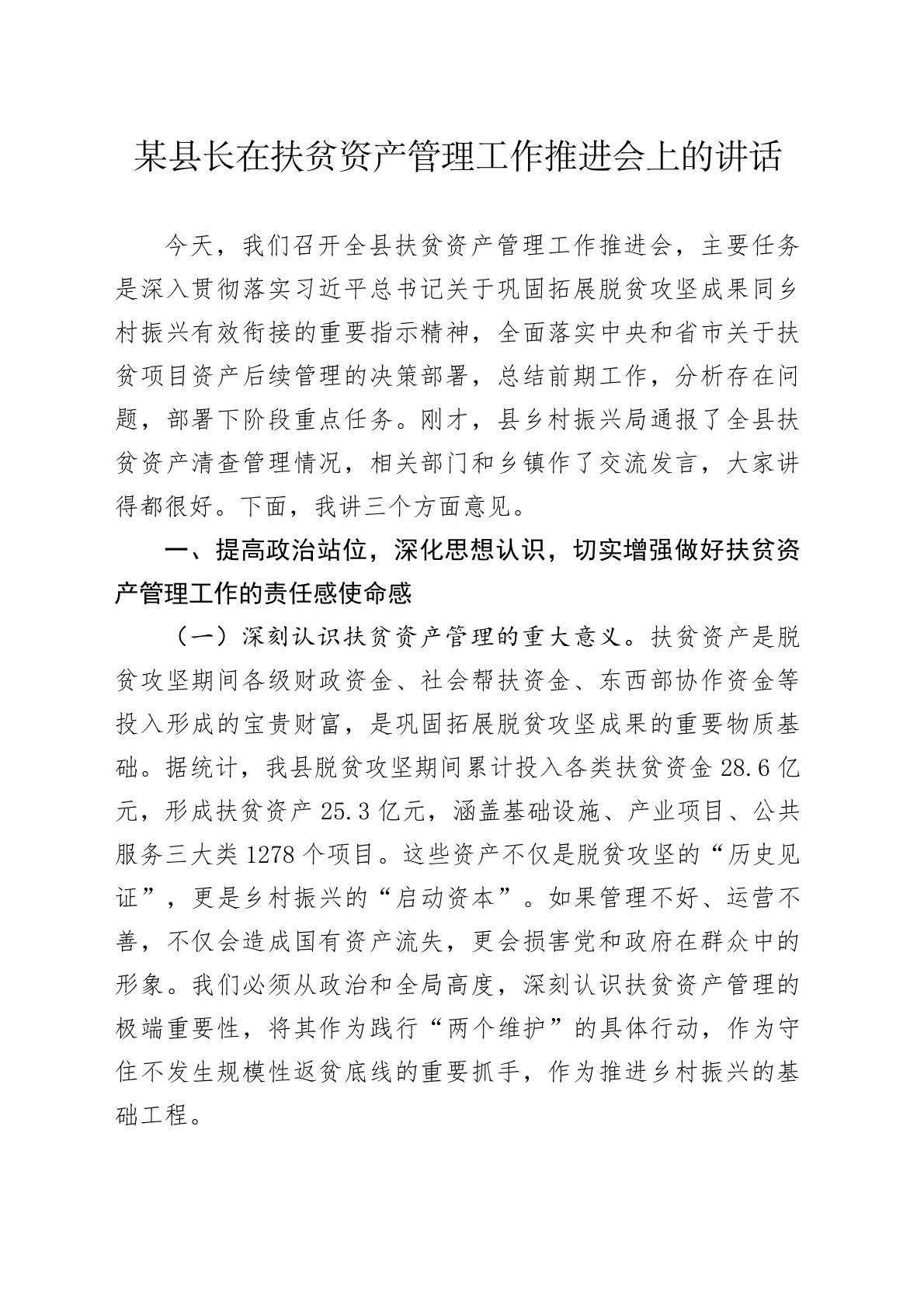 某县长在扶贫资产管理工作推进会上的讲话今天,我们召开全县扶贫资产管理工作推进会,主要任务是深入贯彻落实习近平总书记关于巩固拓展脱贫攻坚成果同乡村振兴有效衔接的重要指示精神,全面落实中央和省市关于扶贫项目资产后续管理的决策部署,总结前期工作,分析存在问题,部署下阶段重点任务。刚才,县乡村振兴局通报了全县扶贫资产清查管理情况,相关部门和乡镇作了交流发言,大家讲得都很好。下面,我讲三个方面意见。一、提高政治站位,深化思想认识,切实增强做好扶贫资产管理工作的责任感使命感(一)深刻认识扶贫资产管理的重大意义。扶贫资产是脱贫攻坚期间各级财政资金、社会帮扶资金、东西部协作资金等投入形成的宝贵财富,是巩固拓展...