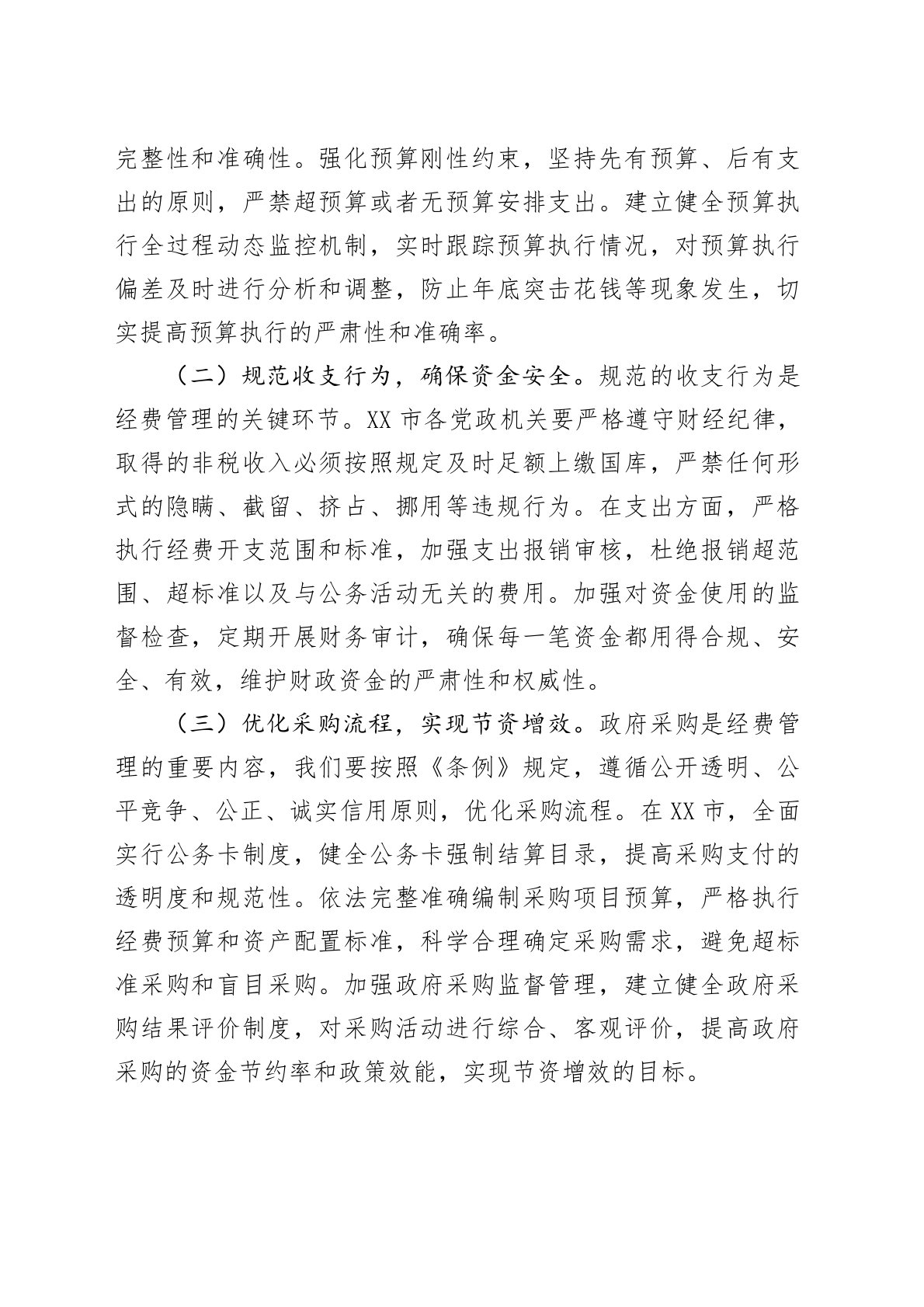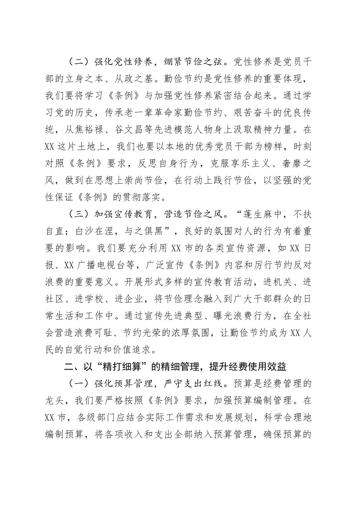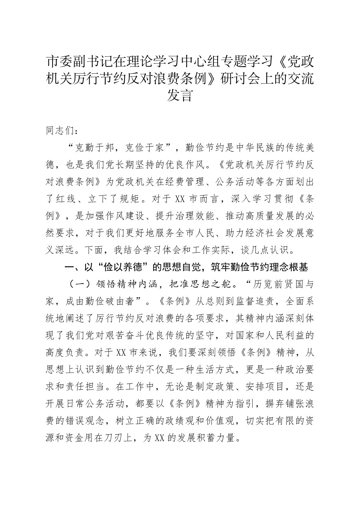 市委副书记在理论学习中心组专题学习《党政机关厉行节约反对浪费条例》研讨会上的交流发言同志们:“克勤于邦,克俭于家”,勤俭节约是中华民族的传统美德,也是我们党长期坚持的优良作风。《党政机关厉行节约反对浪费条例》为党政机关在经费管理、公务活动等各方面划出了红线、立下了规矩。对于XX市而言,深入学习贯彻《条例》,是加强作风建设、提升治理效能、推动高质量发展的必然要求,对于我们更好地服务全市人民、助力经济社会发展意义深远。下面,我结合学习体会和工作实际,谈几点认识。一、以“俭以养德”的思想自觉,筑牢勤俭节约理念根基(一)领悟精神内涵,把准思想之舵。“历览前贤国与家,成由勤俭破由奢”。《条例》从总则到监...