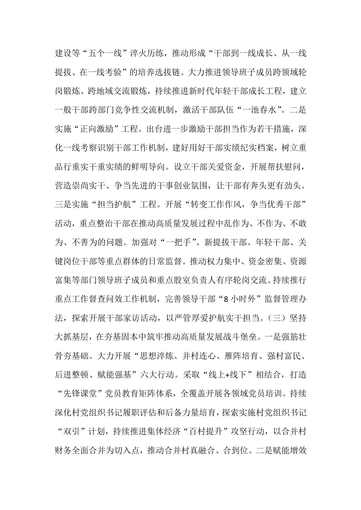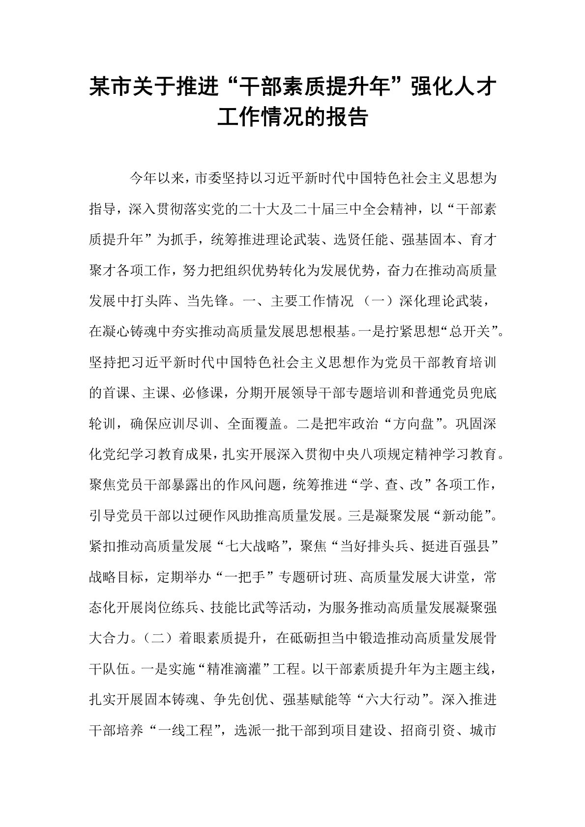 某市关于推进“干部素质提升年”强化人才工作情况的报告 今年以来,市委坚持以习近平新时代中国特色社会主义思想为指导,深入贯彻落实党的二十大及二十届三中全会精神,以“干部素质提升年”为抓手,统筹推进理论武装、选贤任能、强基固本、育才聚才各项工作,努力把组织优势转化为发展优势,奋力在推动高质量发展中打头阵、当先锋。一、主要工作情况 (一)深化理论武装,在凝心铸魂中夯实推动高质量发展思想根基。一是拧紧思想“总开关”。坚持把习近平新时代中国特色社会主义思想作为党员干部教育培训的首课、主课、必修课,分期开展领导干部专题培训和普通党员兜底轮训,确保应训尽训、全面覆盖。二是把牢政治“方向盘”。巩固深化党纪学...
