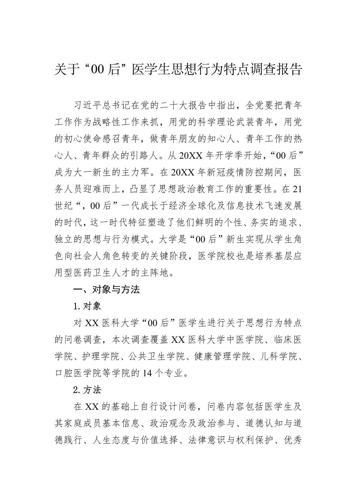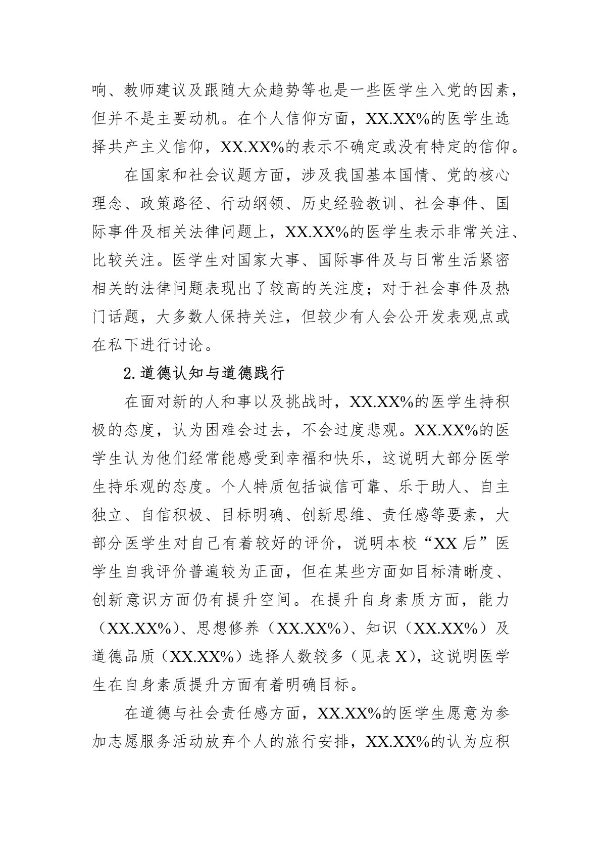 习近平总书记在党的二十大报告中指出,全党要把青年工作作为战略性工作来抓,用党的科学理论武装青年,用党的初心使命感召青年,做青年朋友的知心人、青年工作的热心人、青年群众的引路人。从20XX年开学季开始,“00后”成为大一新生的主力军。在20XX年新冠疫情防控期间,医务人员迎难而上,凸显了思想政治教育工作的重要性。在21世纪“,00后”一代成长于经济全球化及信息技术飞速发展的时代,这一时代特征塑造了他们鲜明的个性、务实的追求、独立的思想与行为模式。大学是“00后”新生实现从学生角色向社会人角色转变的关键阶段,医学院校也是培养基层应用型医药卫生人才的主阵地。一、对象与方法1.对象对XX医科大学“00...