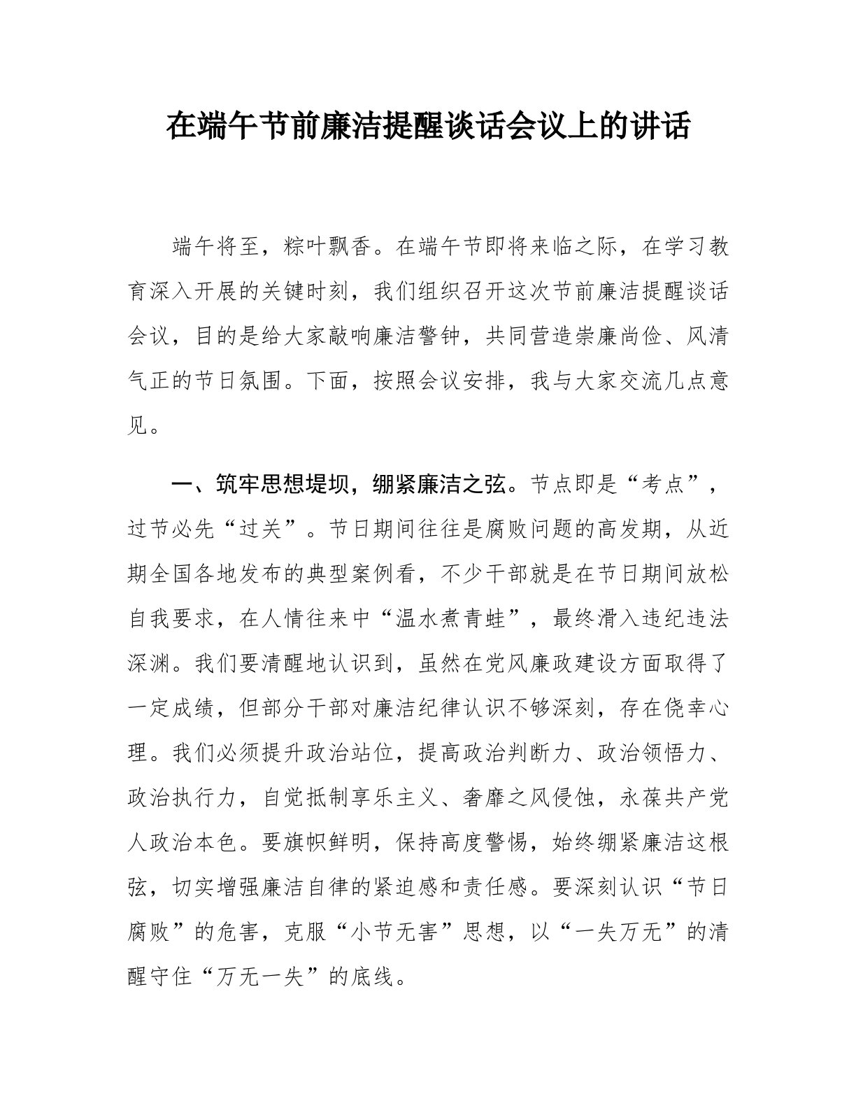 在端午节前廉洁提醒谈话会议上的讲话端午将至,粽叶飘香。在端午节即将来临之际,在学习教育深入开展的关键时刻,我们组织召开这次节前廉洁提醒谈话会议,目的是给大家敲响廉洁警钟,共同营造崇廉尚俭、风清气正的节日氛围。下面,按照会议安排,我与大家交流几点意见。一、筑牢思想堤坝,绷紧廉洁之弦。节点即是“考点”,过节必先“过关”。节日期间往往是腐败问题的高发期,从近期全国各地发布的典型案例看,不少干部就是在节日期间放松自我要求,在人情往来中“温水煮青蛙”,最终滑入违纪违法深渊。我们要清醒地认识到,虽然在党风廉政建设方面取得了一定成绩,但部分干部对廉洁纪律认识不够深刻,存在侥幸心理。我们必须提升政治站位,提高...