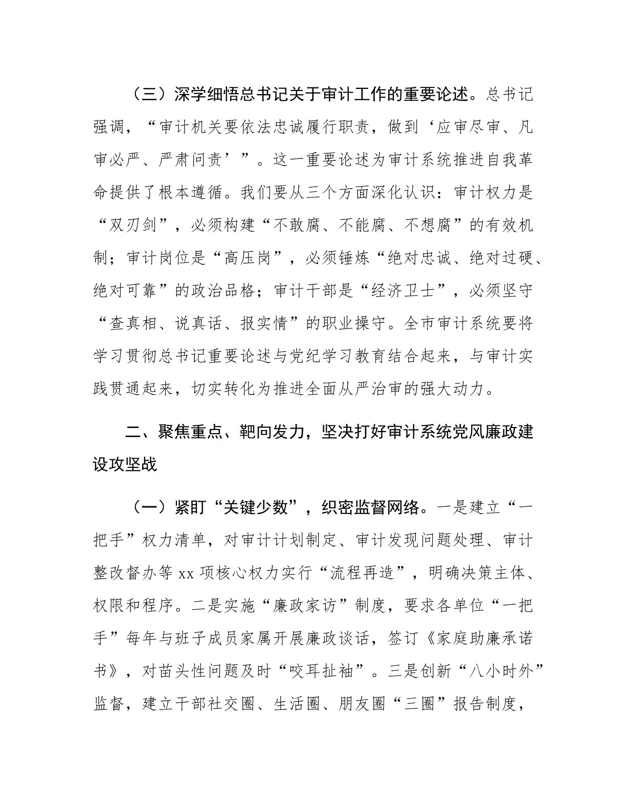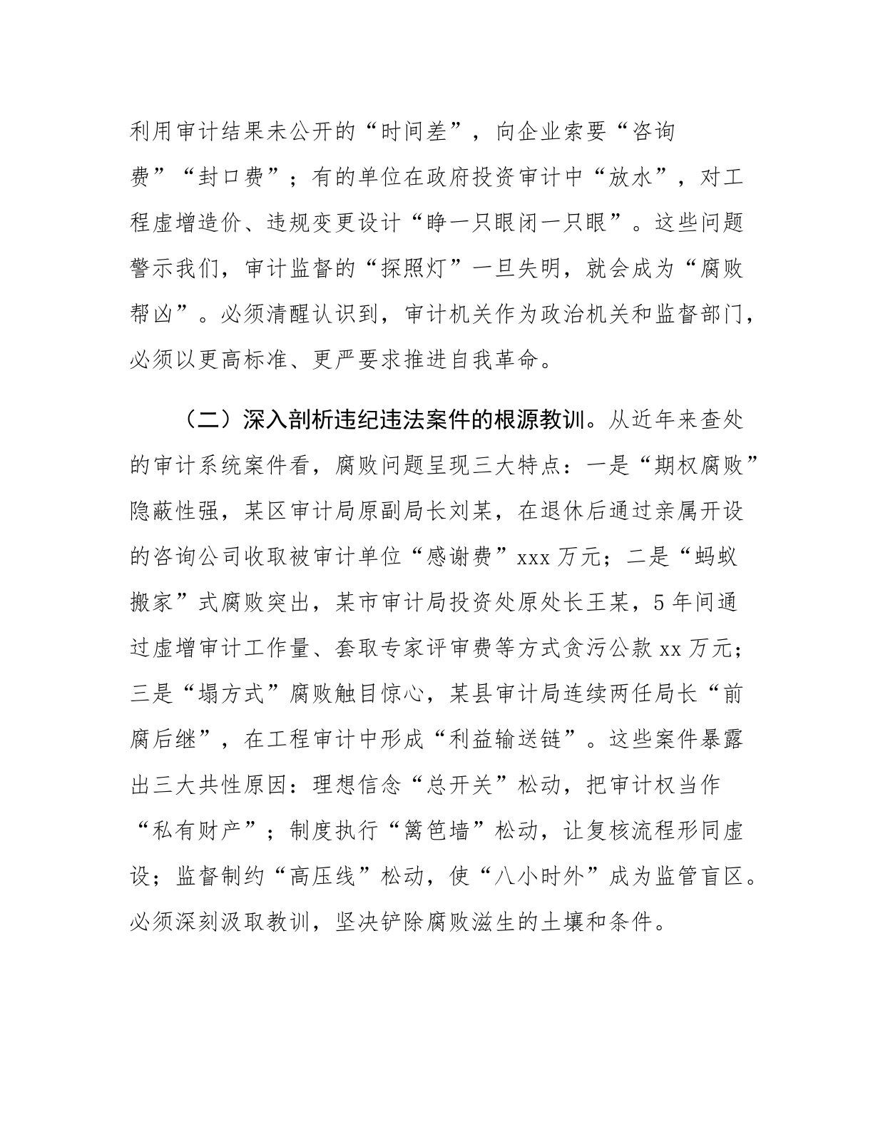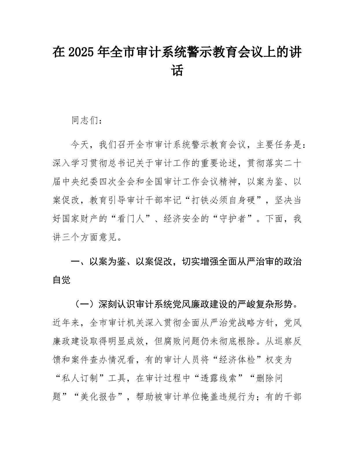 在2025年全市审计系统警示教育会议上的讲话同志们:今天,我们召开全市审计系统警示教育会议,主要任务是:深入学习贯彻总书记关于审计工作的重要论述,贯彻落实二十届中央纪委四次全会和全国审计工作会议精神,以案为鉴、以案促改,教育引导审计干部牢记“打铁必须自身硬”,坚决当好国家财产的“看门人”、经济安全的“守护者”。下面,我讲三个方面意见。一、以案为鉴、以案促改,切实增强全面从严治审的政治自觉(一)深刻认识审计系统党风廉政建设的严峻复杂形势。近年来,全市审计机关深入贯彻全面从严治党战略方针,党风廉政建设取得明显成效,但腐败问题仍未彻底根除。从巡察反馈和案件查办情况看,有的审计人员将“经济体检”权变为...