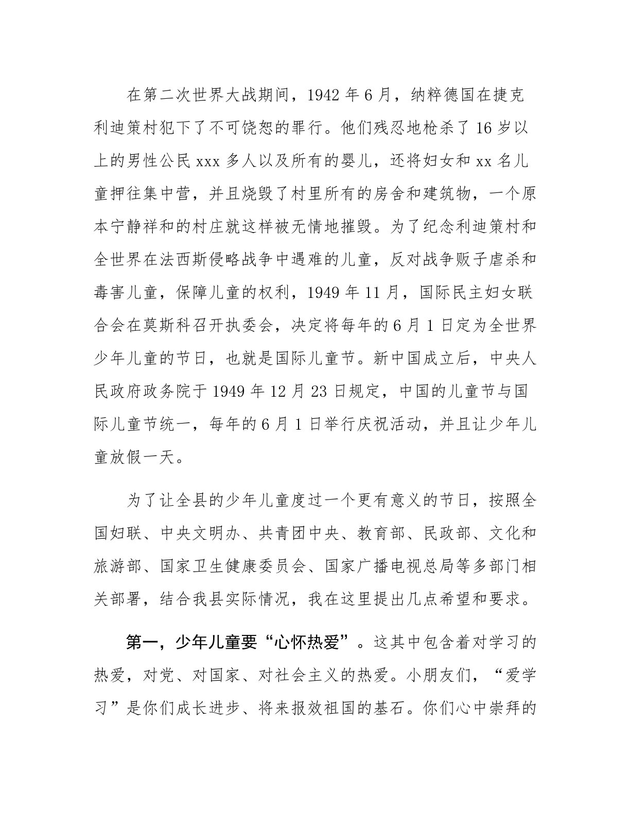 县委书记在2025年“六一”儿童节活动上的讲话亲爱的各位来宾、家长们、老师们、小朋友们:大家好!在这个充满生机与希望的美好时节,我们欢聚一堂,共同庆祝“六一”国际儿童节。刚刚,我们宣读了表扬决定,对那些在少年儿童事业中表现突出的先进集体和个人进行了表彰,来自老师、家长、小朋友这三个群体的先进代表也做了精彩的典型发言。希望大家能够以他们为榜样,在新的发展时期,积极进取,创造新的辉煌。在此,我谨代表县委、县政府向全县的少年儿童送上最诚挚的节日祝福,祝小朋友们节日快乐!同时,向辛勤耕耘的老师们、默默付出的家长们以及所有关心少年儿童健康成长的社会各界人士,表示崇高的敬意!小朋友们都知道,“六一”儿童节...