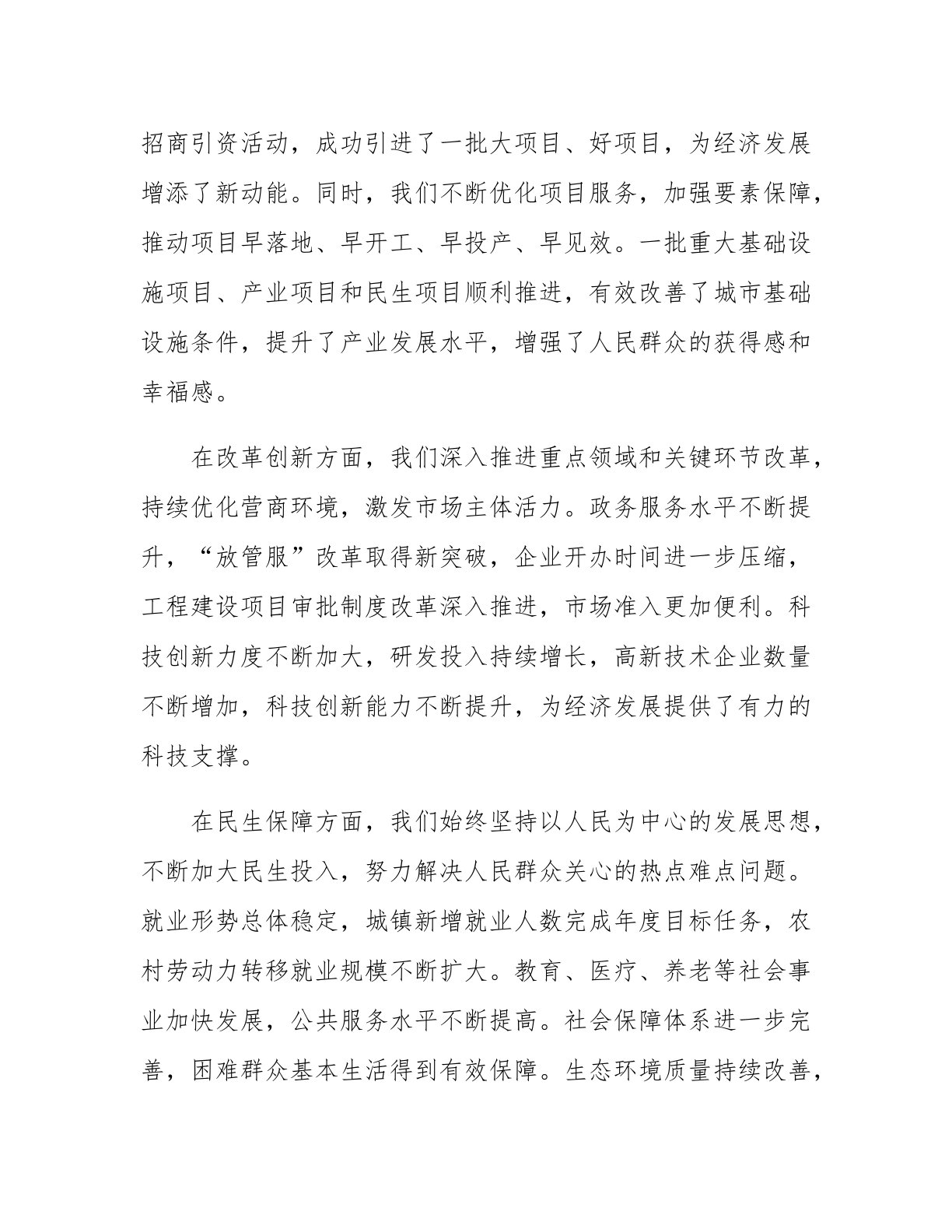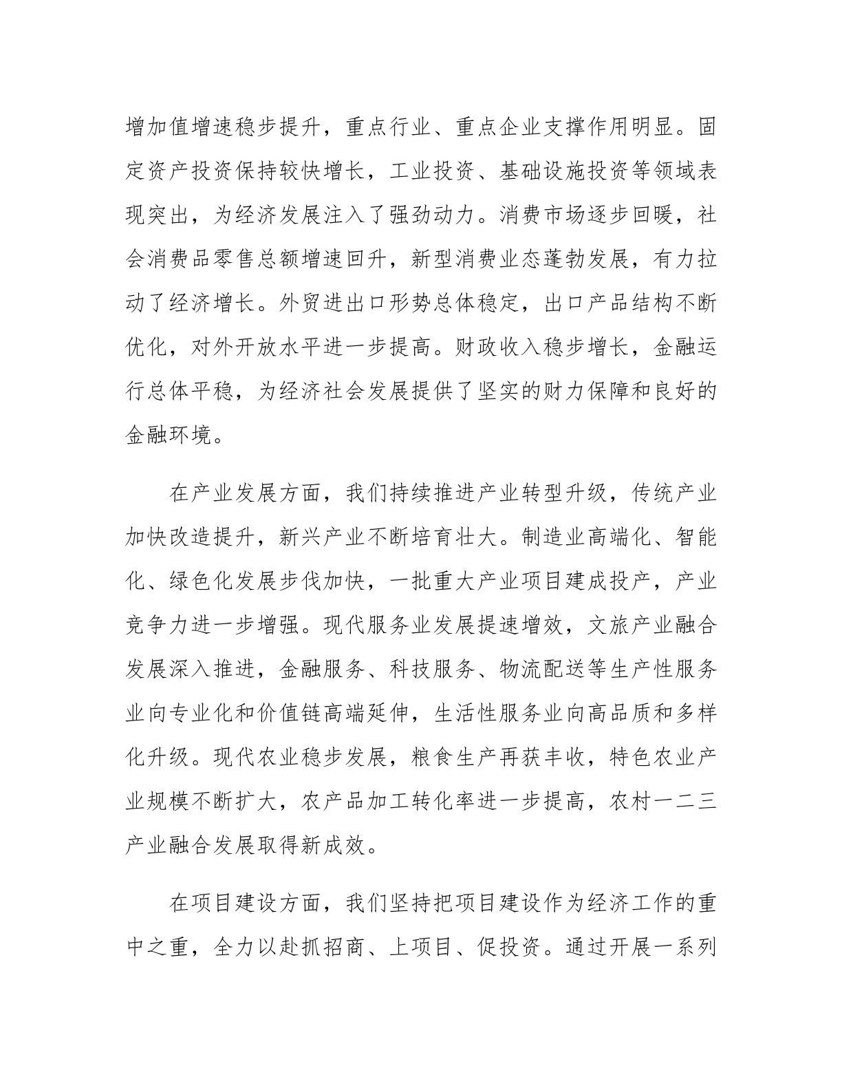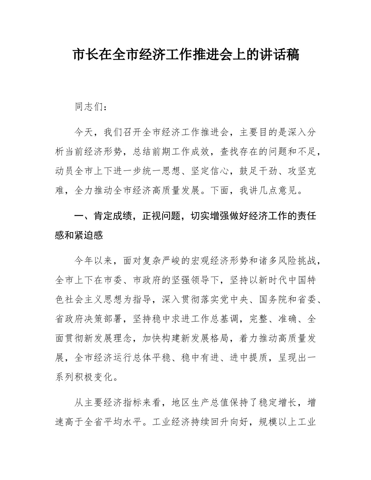 市长在全市经济工作推进会上的讲话稿同志们:今天,我们召开全市经济工作推进会,主要目的是深入分析当前经济形势,总结前期工作成效,查找存在的问题和不足,动员全市上下进一步统一思想、坚定信心,鼓足干劲、攻坚克难,全力推动全市经济高质量发展。下面,我讲几点意见。一、肯定成绩,正视问题,切实增强做好经济工作的责任感和紧迫感今年以来,面对复杂严峻的宏观经济形势和诸多风险挑战,全市上下在市委、市政府的坚强领导下,坚持以新时代中国特色社会主义思想为指导,深入贯彻落实党中央、国务院和省委、省政府决策部署,坚持稳中求进工作总基调,完整、准确、全面贯彻新发展理念,加快构建新发展格局,着力推动高质量发展,全市经济运行...