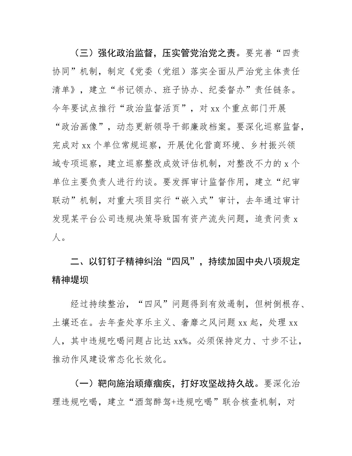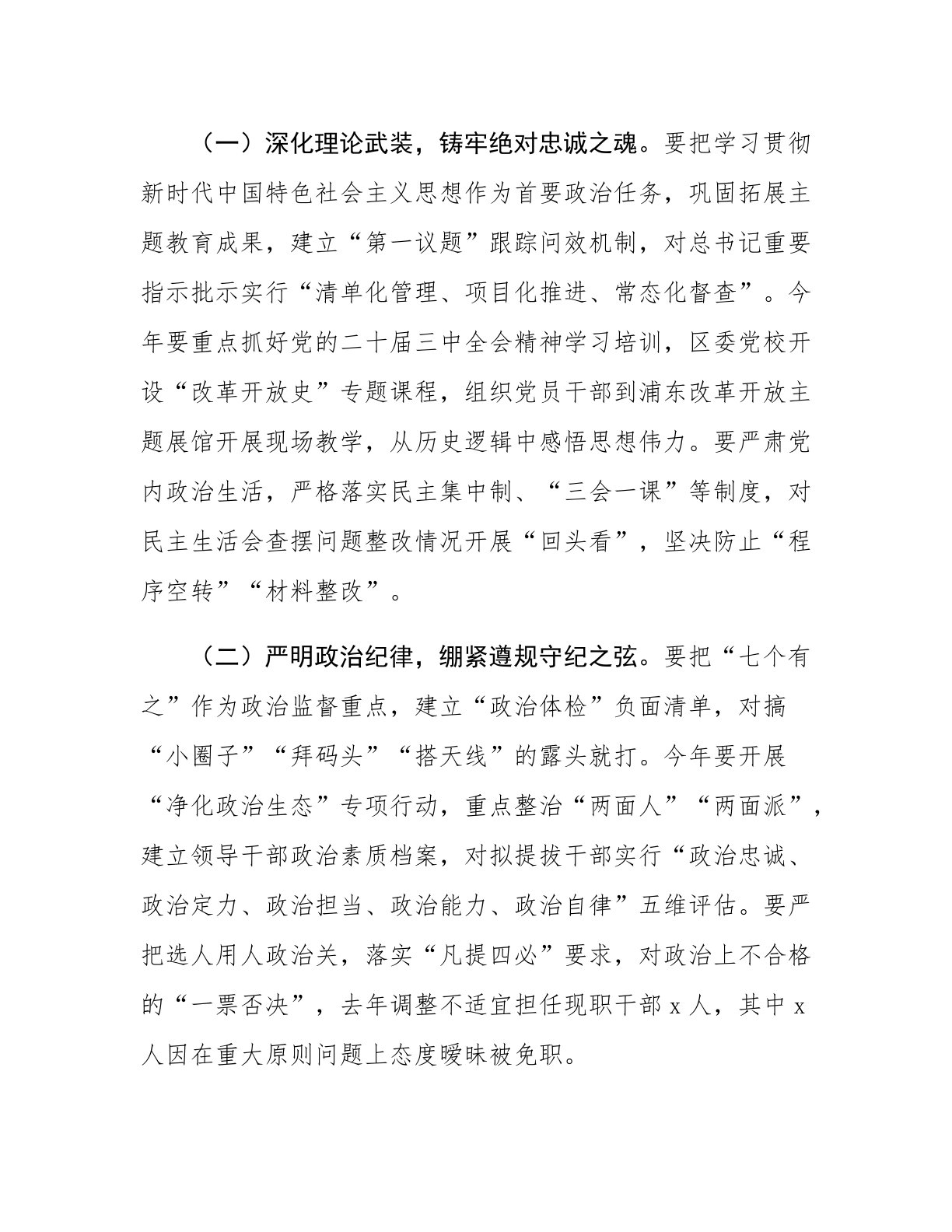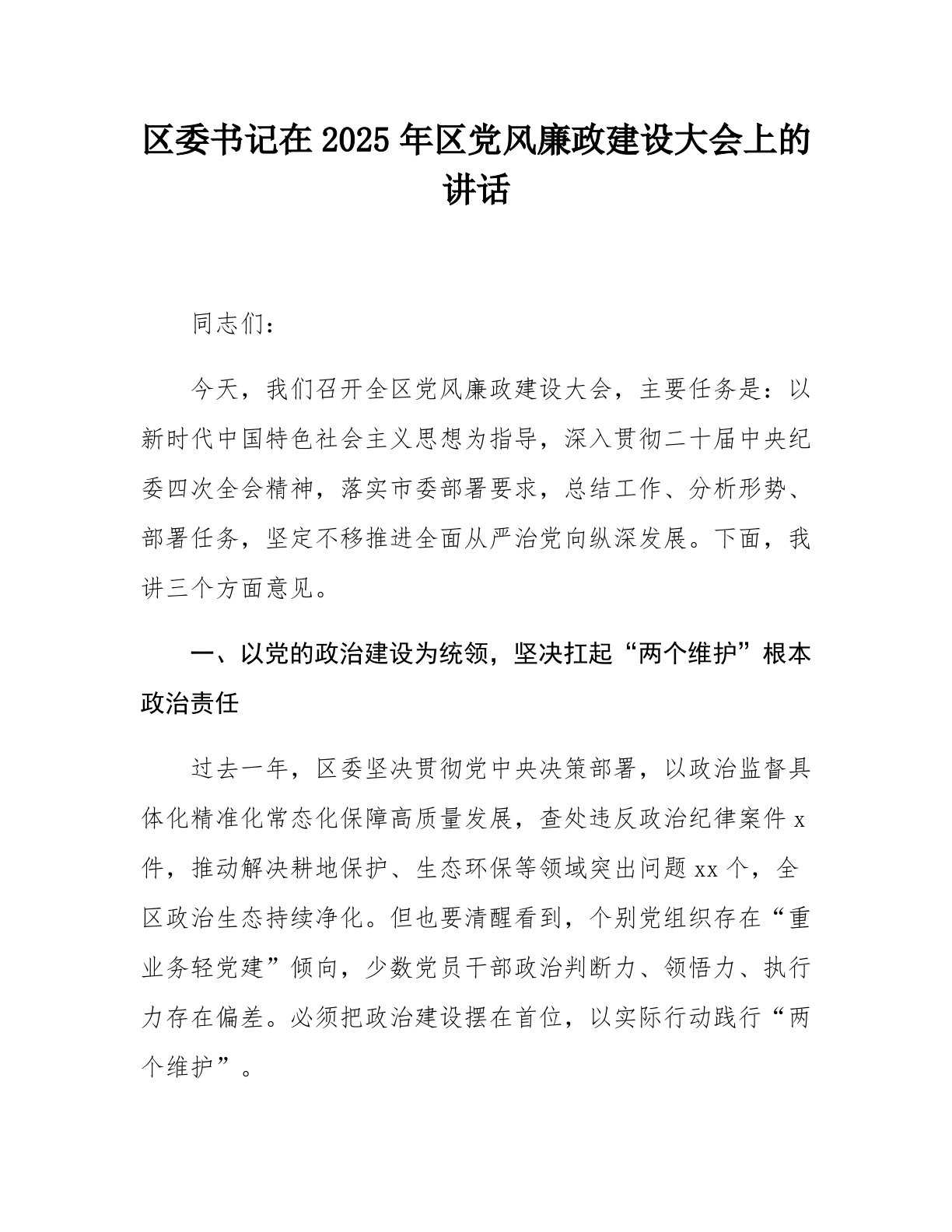区委书记在2025年区党风廉政建设大会上的讲话同志们:今天,我们召开全区党风廉政建设大会,主要任务是:以新时代中国特色社会主义思想为指导,深入贯彻二十届中央纪委四次全会精神,落实市委部署要求,总结工作、分析形势、部署任务,坚定不移推进全面从严治党向纵深发展。下面,我讲三个方面意见。一、以党的政治建设为统领,坚决扛起“两个维护”根本政治责任过去一年,区委坚决贯彻党中央决策部署,以政治监督具体化精准化常态化保障高质量发展,查处违反政治纪律案件x件,推动解决耕地保护、生态环保等领域突出问题xx个,全区政治生态持续净化。但也要清醒看到,个别党组织存在“重业务轻党建”倾向,少数党员干部政治判断力、领悟力...