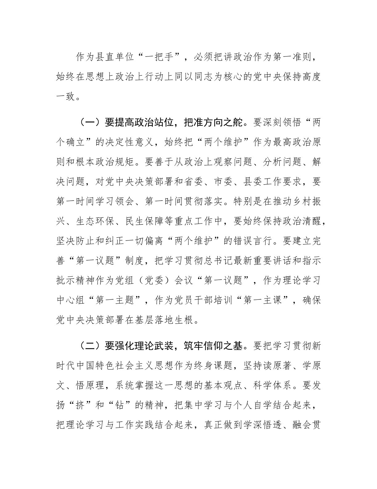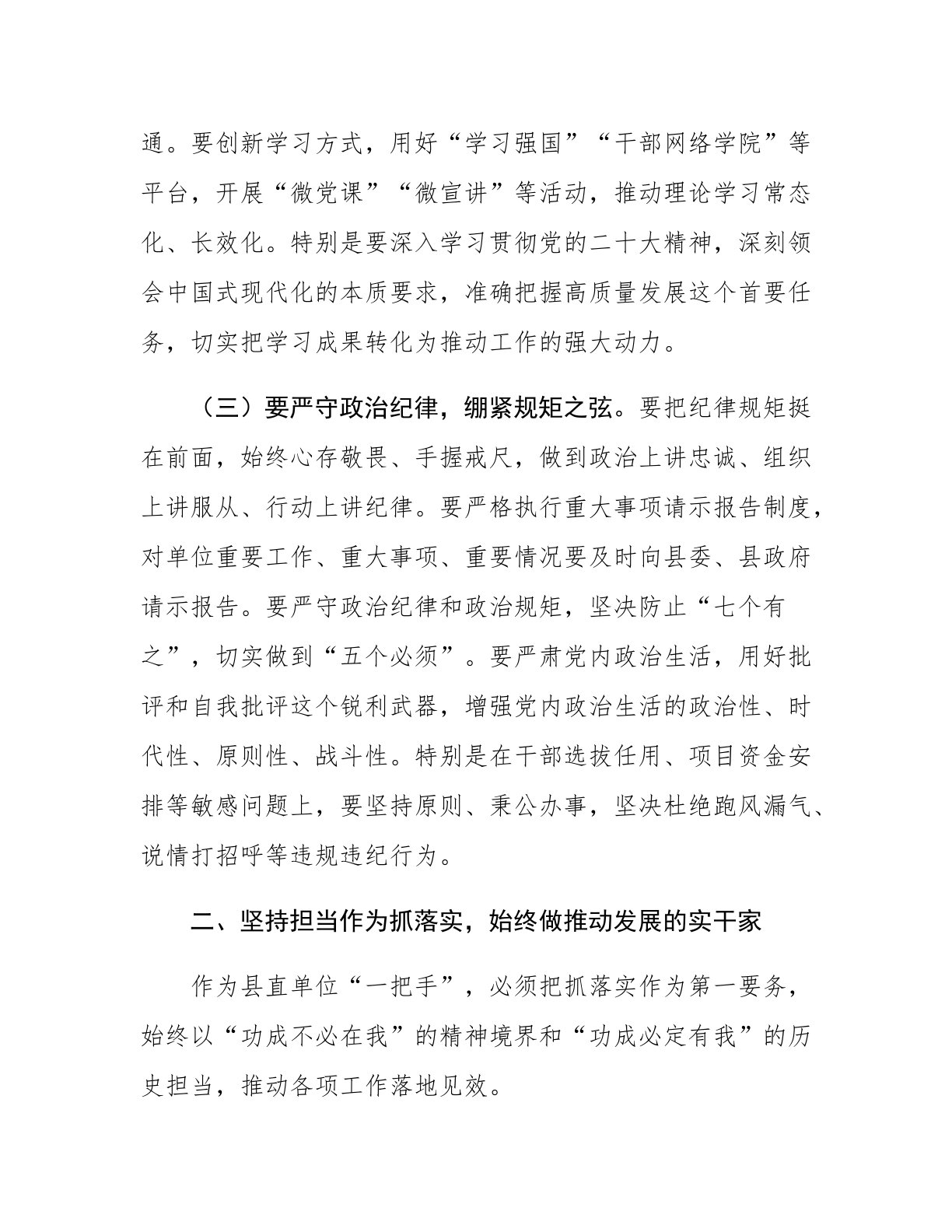 某政府办主任在县区直单位主要负责人党校培训班结束时的发言同志们:为期一个月的县(区)直单位主要负责人党校培训班今天圆满结业。在此,我代表县委、县政府,向顺利完成学业的各位学员表示热烈祝贺!向辛勤付出的党校教职员工致以诚挚问候!这次培训是在全县上下深入学习贯彻党的二十大精神,全面落实省委“三高四新”战略定位和使命任务,奋力推进经济社会高质量发展的关键时期举办的一次重要培训。县委对这次培训高度重视,县委书记亲自审定培训方案,并在开学典礼上作专题辅导。培训期间,大家以饱满的政治热情、良好的精神状态、严谨的学风作风,系统学习了党的创新理论,深入研讨了县域发展重大问题,展现了县直单位主要负责人的良好形象...