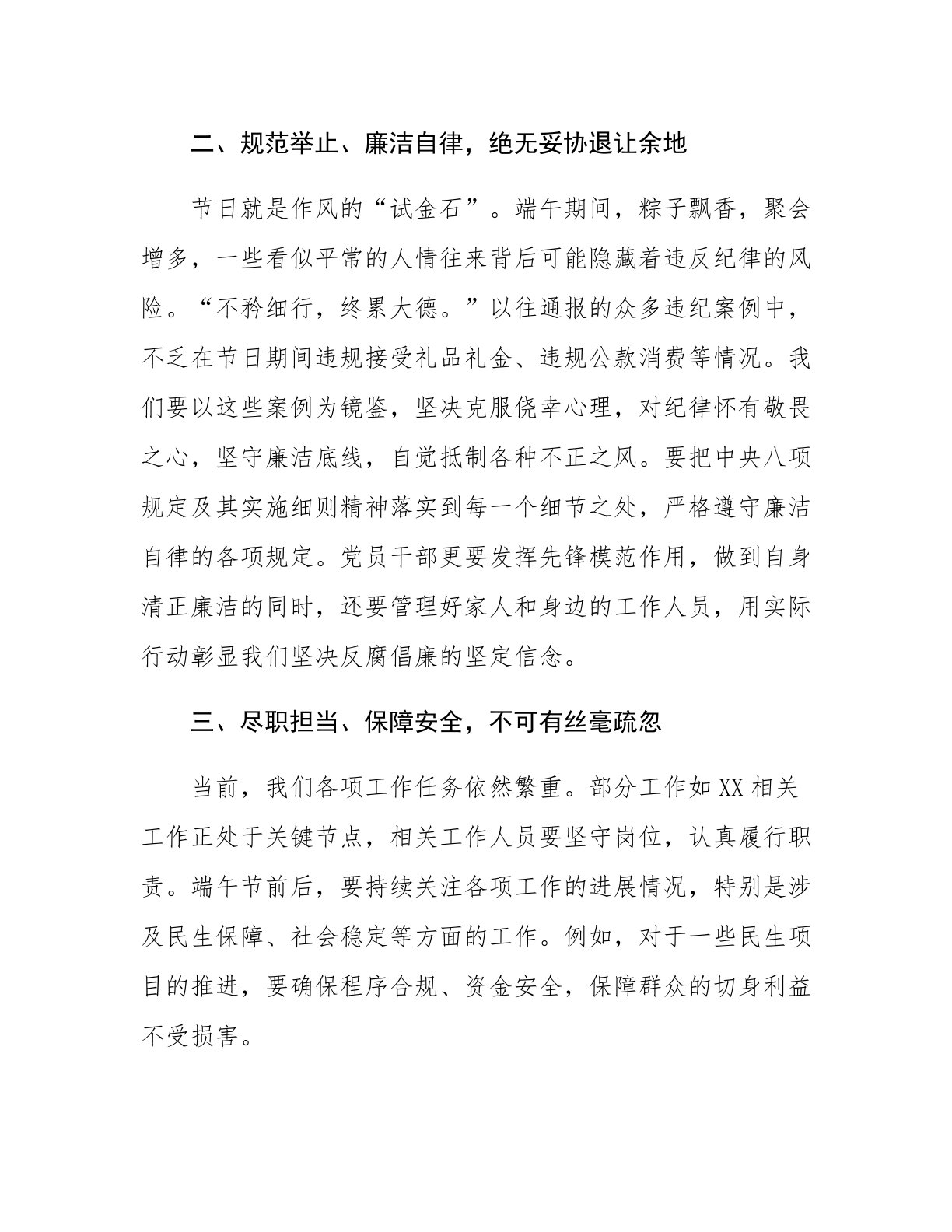 机关单位端午节前集体廉政提醒谈话同志们:在端午节即将来临之际,我们召开这次廉政提醒谈话会议。目的就是在节前给大家提个醒、扯扯袖、敲敲钟,提高大家的廉洁自律意识和安全责任意识,强化节日期间的党风廉政建设,杜绝“节日腐败”,确保我们能度过一个廉洁、祥和的端午节。下面,我着重强调几点内容:一、提高警觉、深刻领悟,丝毫不可麻痹大意“廉者,政之本也。”端午节作为我国的传统节日,是阖家欢乐、亲友团聚的时刻,但我们必须清醒地认识到,这个时候也往往是作风问题的易爆发期。我们要深入学习领会总书记关于党风廉政建设的一系列重要讲话精神,时刻保持政治上的清醒与坚定,不断增强纪律意识和规矩意识,坚守清正廉洁的政治操守。...