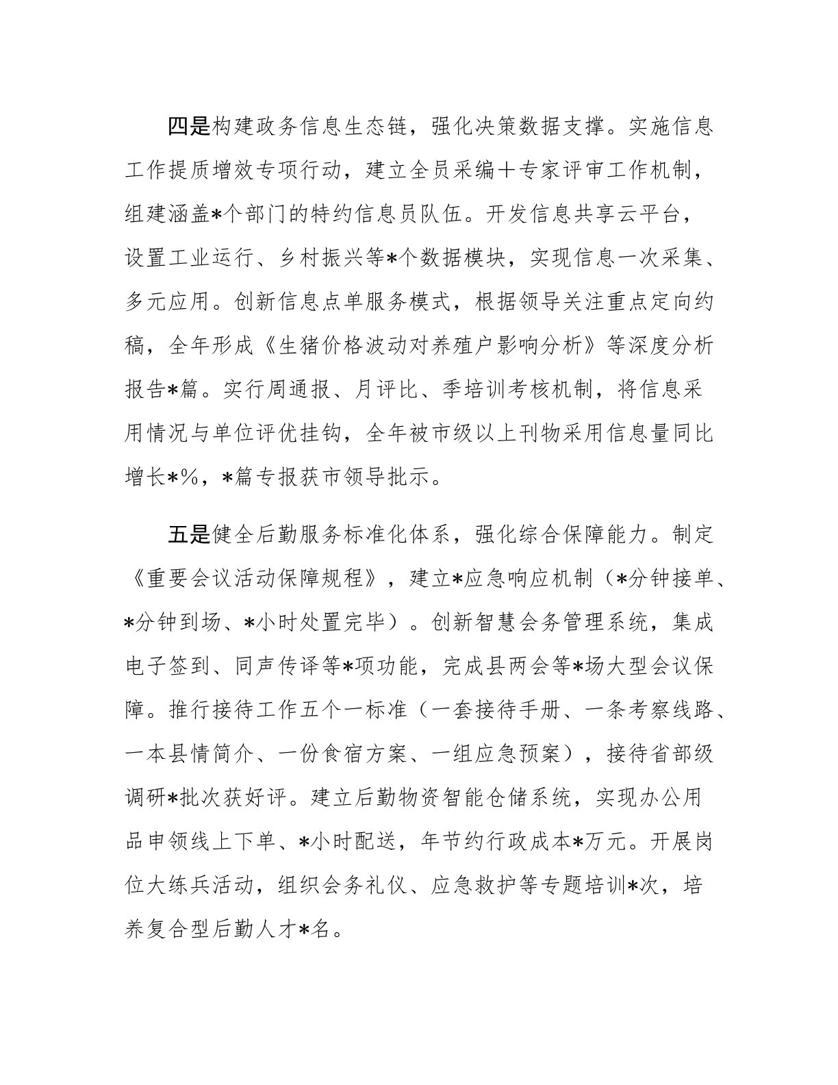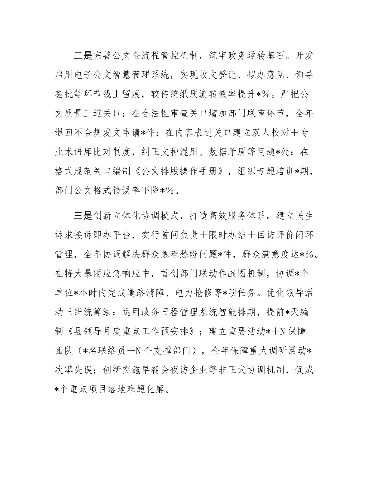 领导干部提交考察组近三年工作总结三年来,本人紧紧围绕县委、县政府各项决策部署,始终保持绝对忠诚、勤勉务实的工作作风,主动适应新岗位、新形势、新要求,不断提升各项工作驾驭能力和水平,扎实做好本职工作。现述职如下:一、以服务大局为目标,全力抓好本职工作一是构建多维调研体系,提升决策参谋能力。立足县域发展核心需求,建立课题领衔+专班推进调研机制,组建工业经济、乡村振兴、生态治理、民生保障*个专项调研组,采取一线蹲点+数据分析+案例解剖工作法,全年开展专题调研*次,形成《关于传统产业智能化转型的路径研究》《高标准农田建设与集体经济融合发展调研报告》等*篇决策参考报告。特别是在编制全县生态文明建设三年规...