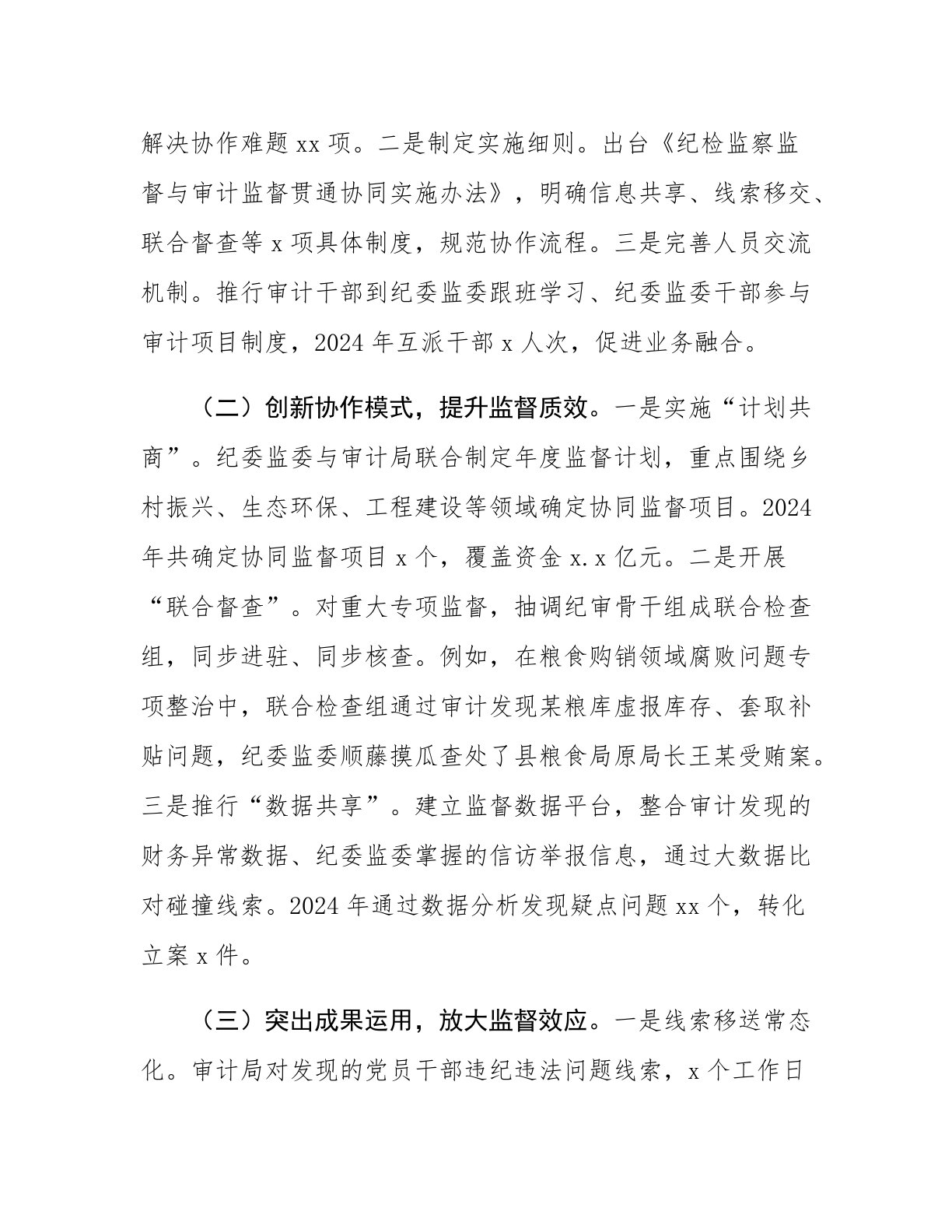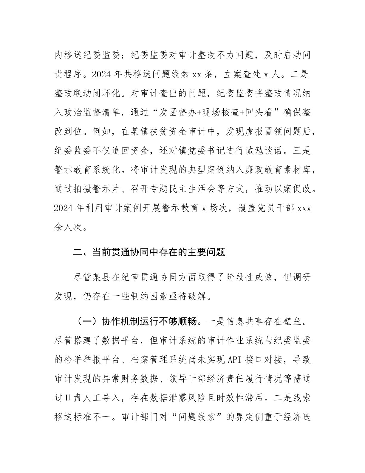 关于某县纪检监察监督与审计监督贯通协同情况的调研报告近年来,随着全面从严治党向纵深推进,纪检监察监督与审计监督的贯通协同成为提升监督效能、防范化解风险的重要抓手。某县作为省级监督贯通协同试点地区,通过机制创新、资源整合、成果共享,初步构建了“纪审联动”的监督格局。为深入总结经验、分析问题、提出对策,调研组通过座谈访谈、案例分析、数据统计等方式,对该县实践情况进行了全面调研。现将调研情况报告如下:一、纪检监察监督与审计监督贯通协同的主要做法与成效某县以“信息互通、力量互借、优势互补”为目标,从制度设计、平台搭建、重点领域突破等方面入手,推动两类监督从“单兵作战”向“攥指成拳”转变。(一)构建制度...