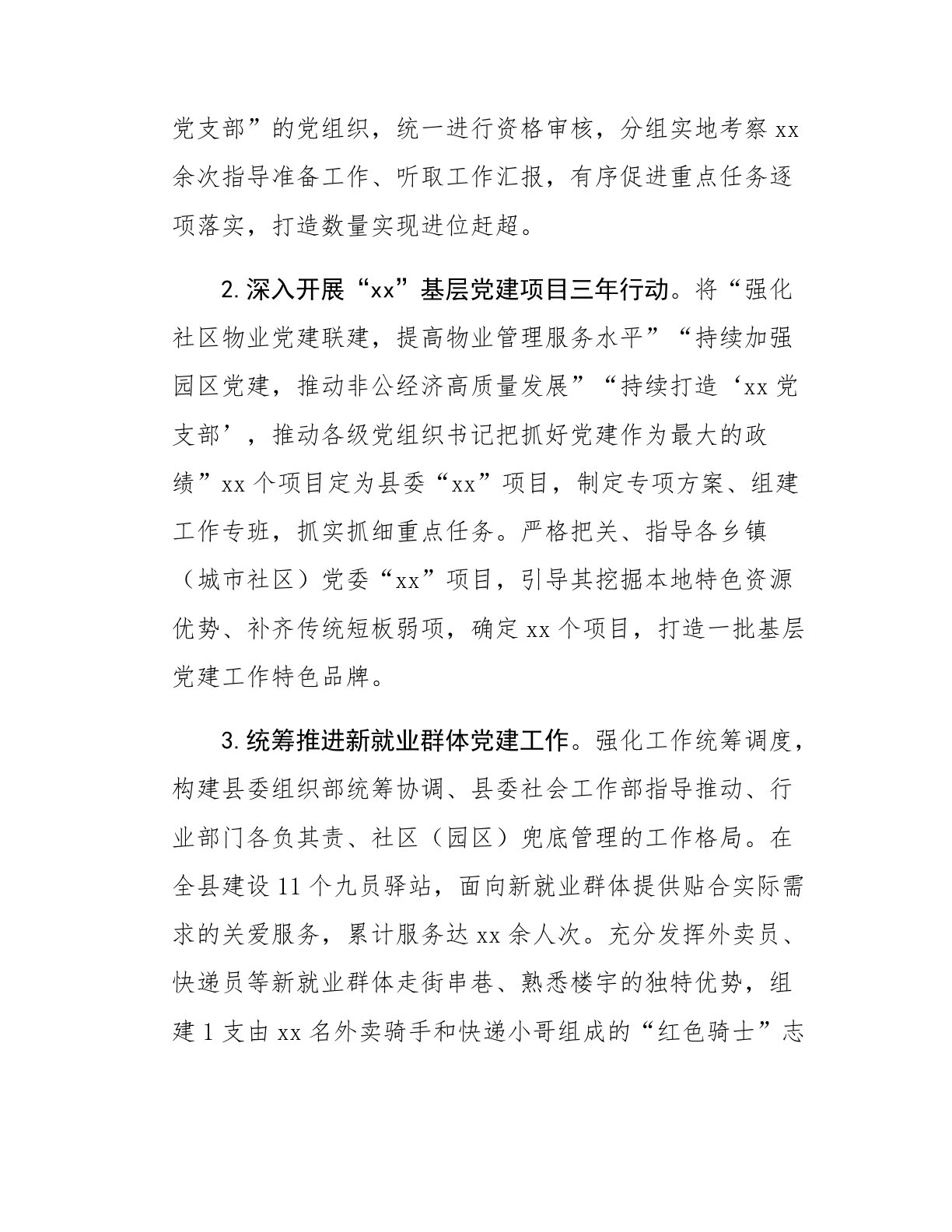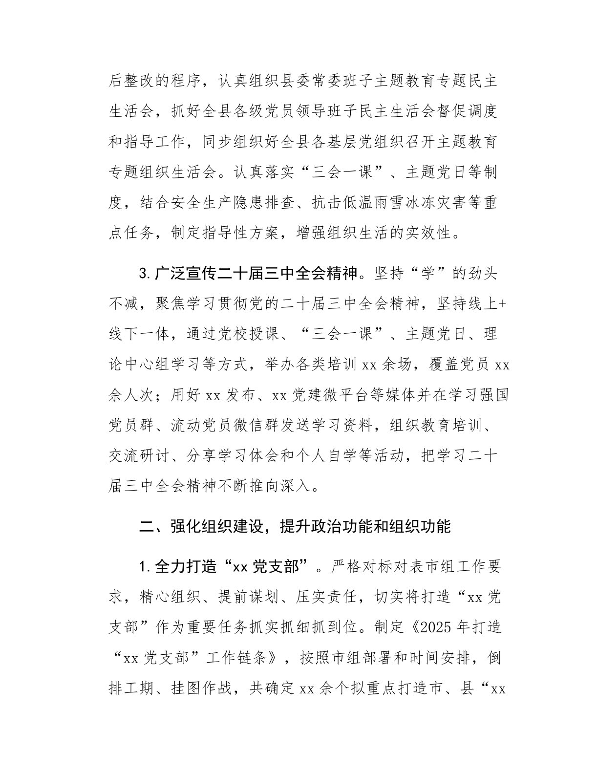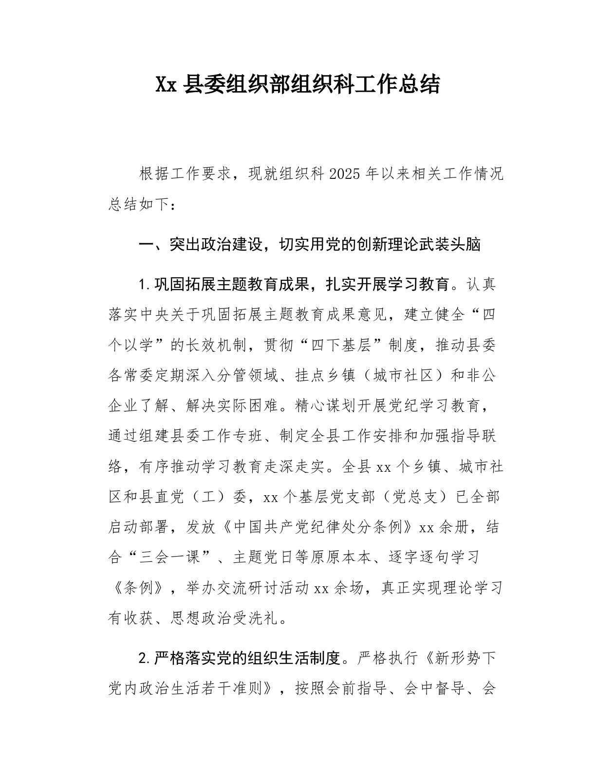 Xx县委组织部组织科工作总结根据工作要求,现就组织科2025年以来相关工作情况总结如下:一、突出政治建设,切实用党的创新理论武装头脑1.巩固拓展主题教育成果,扎实开展学习教育。认真落实中央关于巩固拓展主题教育成果意见,建立健全“四个以学”的长效机制,贯彻“四下基层”制度,推动县委各常委定期深入分管领域、挂点乡镇(城市社区)和非公企业了解、解决实际困难。精心谋划开展党纪学习教育,通过组建县委工作专班、制定全县工作安排和加强指导联络,有序推动学习教育走深走实。全县xx个乡镇、城市社区和县直党(工)委,xx个基层党支部(党总支)已全部启动部署,发放《中国共产党纪律处分条例》xx余册,结合“三会一课”...