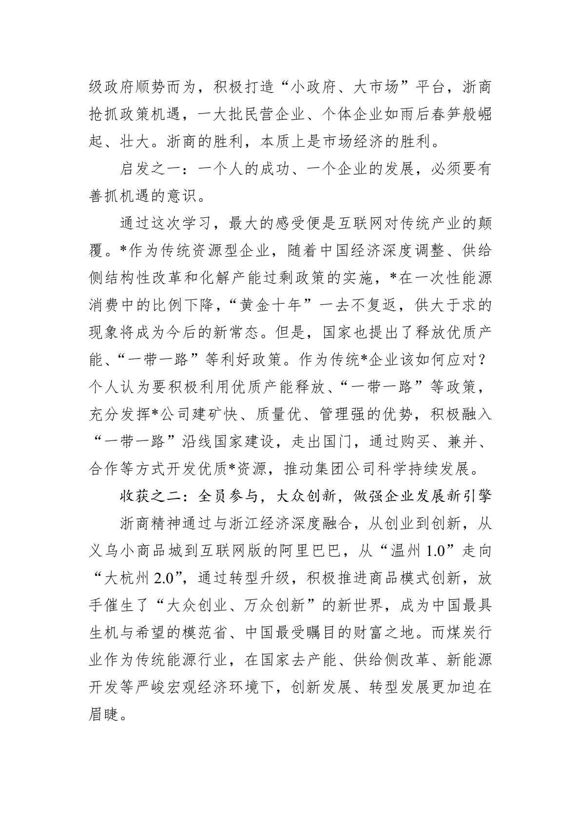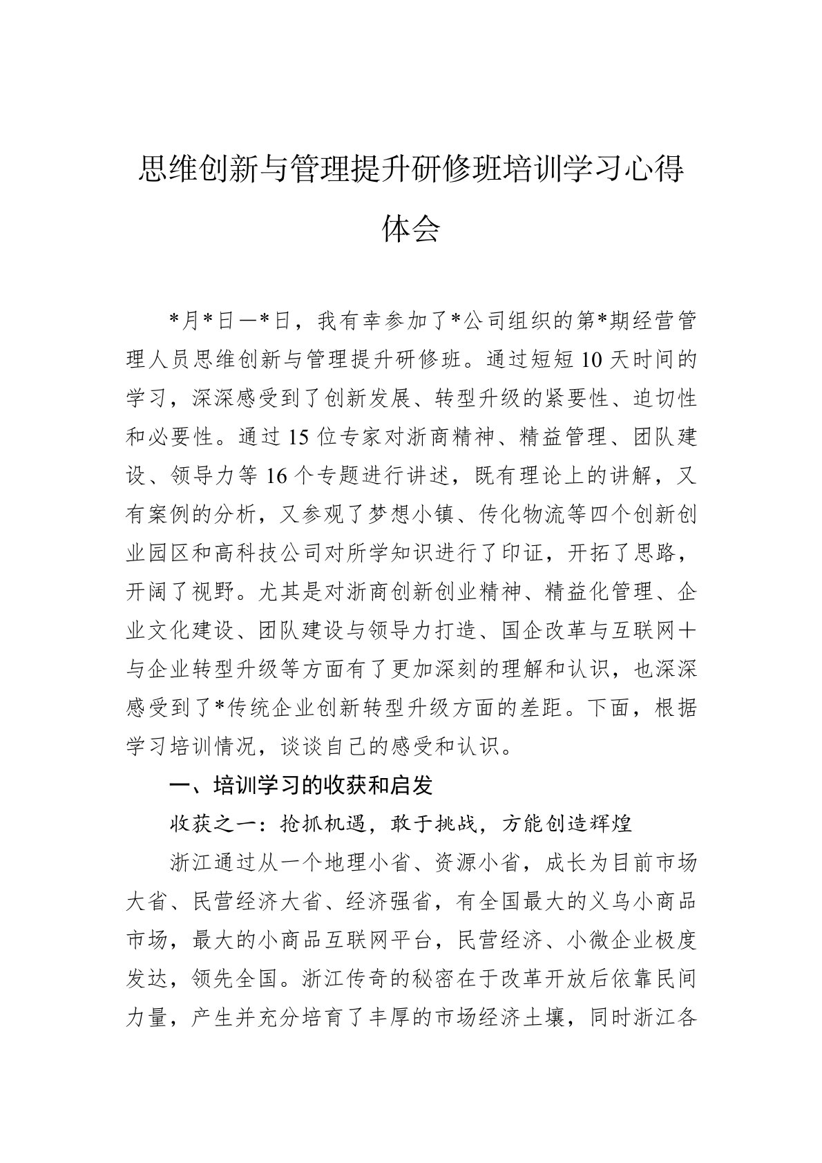 *月*日-*日,我有幸参加了*公司组织的第*期经营管理人员思维创新与管理提升研修班。通过短短10天时间的学习,深深感受到了创新发展、转型升级的紧要性、迫切性和必要性。通过15位专家对浙商精神、精益管理、团队建设、领导力等16个专题进行讲述,既有理论上的讲解,又有案例的分析,又参观了梦想小镇、传化物流等四个创新创业园区和高科技公司对所学知识进行了印证,开拓了思路,开阔了视野。尤其是对浙商创新创业精神、精益化管理、企业文化建设、团队建设与领导力打造、国企改革与互联网+与企业转型升级等方面有了更加深刻的理解和认识,也深深感受到了*传统企业创新转型升级方面的差距。下面,根据学习培训情况,谈谈自己的感受...