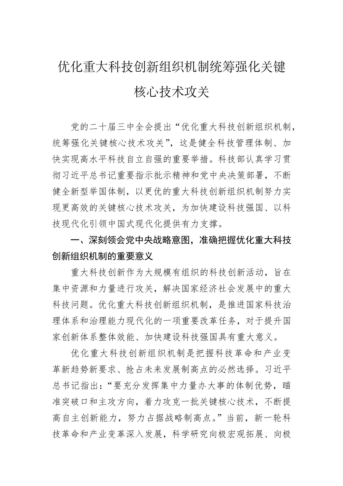 党的二十届三中全会提出“优化重大科技创新组织机制,统筹强化关键核心技术攻关”,这是健全科技管理体制、加快实现高水平科技自立自强的重要举措。科技部认真学习贯彻习近平总书记重要指示批示精神和党中央决策部署,不断健全新型举国体制,以更优的重大科技创新组织机制努力实现更高效的关键核心技术攻关,为加快建设科技强国、以科技现代化引领中国式现代化提供有力支撑。一、深刻领会党中央战略意图,准确把握优化重大科技创新组织机制的重要意义重大科技创新作为大规模有组织的科技创新活动,旨在集中资源和力量进行攻关,解决国家经济社会发展中的重大科技问题。优化重大科技创新组织机制,是推进国家科技治理体系和治理能力现代化的一项重...