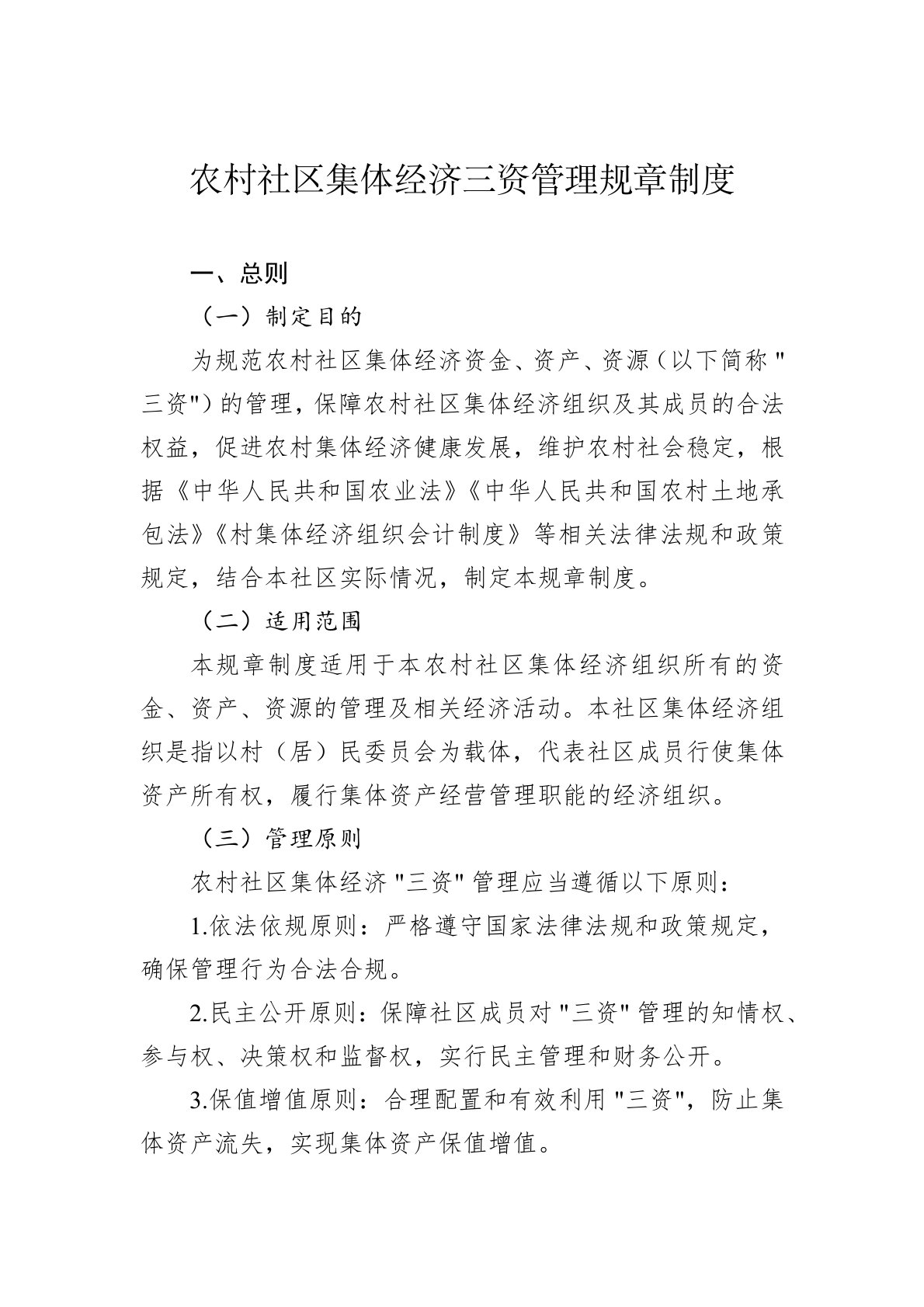 一、总则(一)制定目的为规范农村社区集体经济资金、资产、资源(以下简称 "三资")的管理,保障农村社区集体经济组织及其成员的合法权益,促进农村集体经济健康发展,维护农村社会稳定,根据《中华人民共和国农业法》《中华人民共和国农村土地承包法》《村集体经济组织会计制度》等相关法律法规和政策规定,结合本社区实际情况,制定本规章制度。(二)适用范围本规章制度适用于本农村社区集体经济组织所有的资金、资产、资源的管理及相关经济活动。本社区集体经济组织是指以村(居)民委员会为载体,代表社区成员行使集体资产所有权,履行集体资产经营管理职能的经济组织。(三)管理原则农村社区集体经济 "三资" 管理应当遵循以下原则...