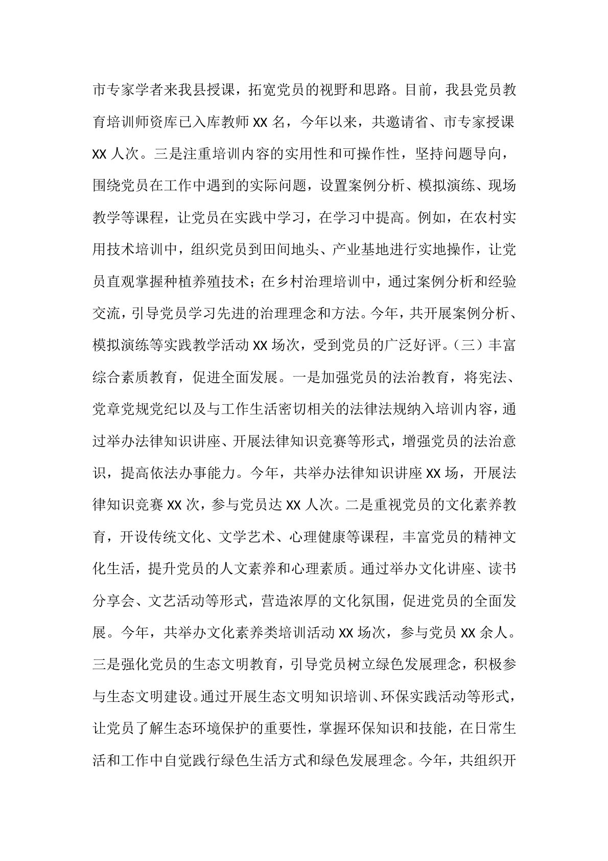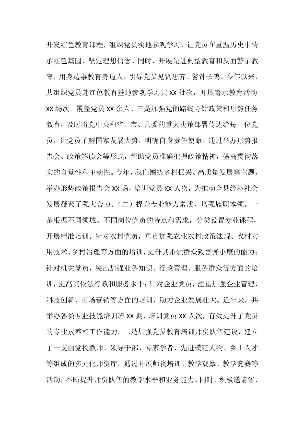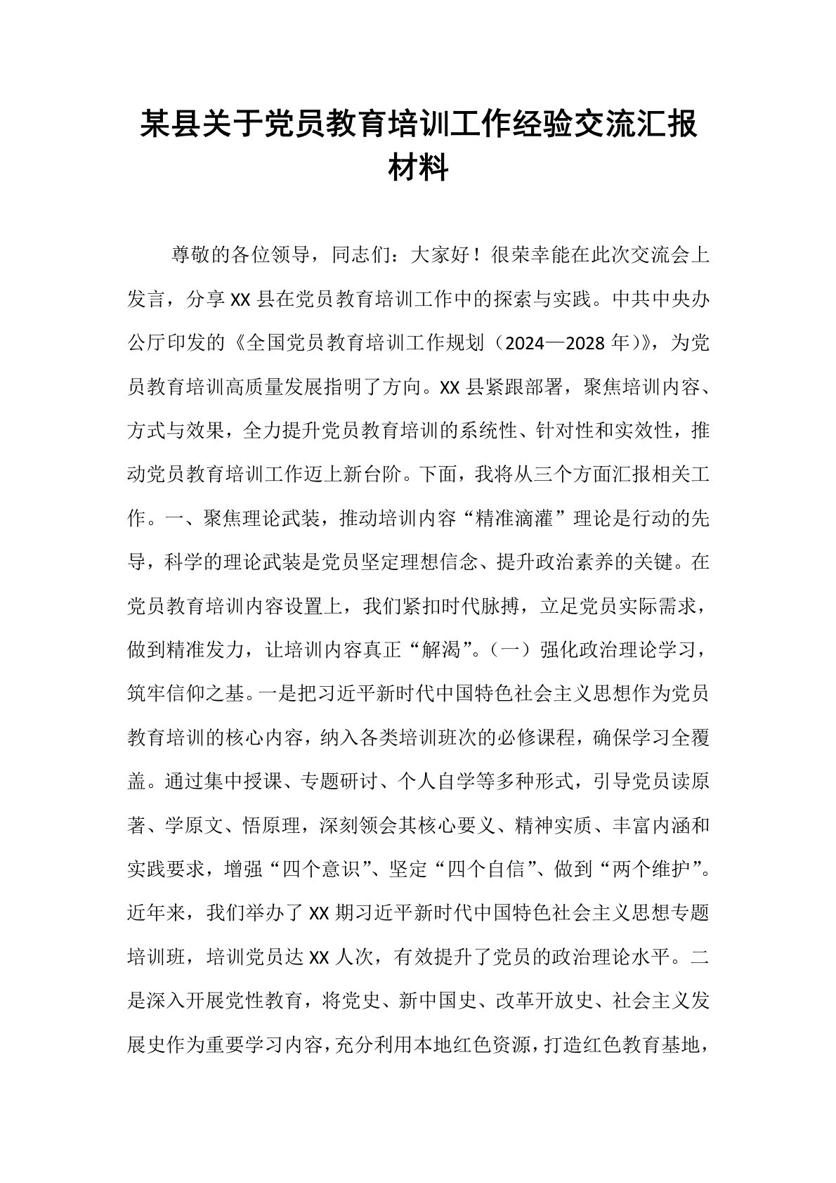 某县关于党员教育培训工作经验交流汇报材料 尊敬的各位领导,同志们:大家好!很荣幸能在此次交流会上发言,分享XX县在党员教育培训工作中的探索与实践。中共中央办公厅印发的《全国党员教育培训工作规划(2024—2028年)》,为党员教育培训高质量发展指明了方向。XX县紧跟部署,聚焦培训内容、方式与效果,全力提升党员教育培训的系统性、针对性和实效性,推动党员教育培训工作迈上新台阶。下面,我将从三个方面汇报相关工作。一、聚焦理论武装,推动培训内容“精准滴灌”理论是行动的先导,科学的理论武装是党员坚定理想信念、提升政治素养的关键。在党员教育培训内容设置上,我们紧扣时代脉搏,立足党员实际需求,做到精准发力,...