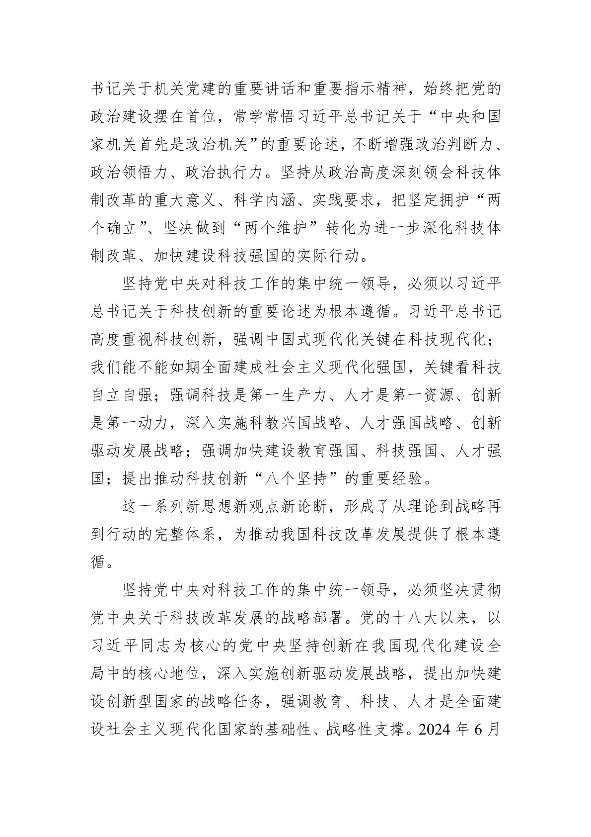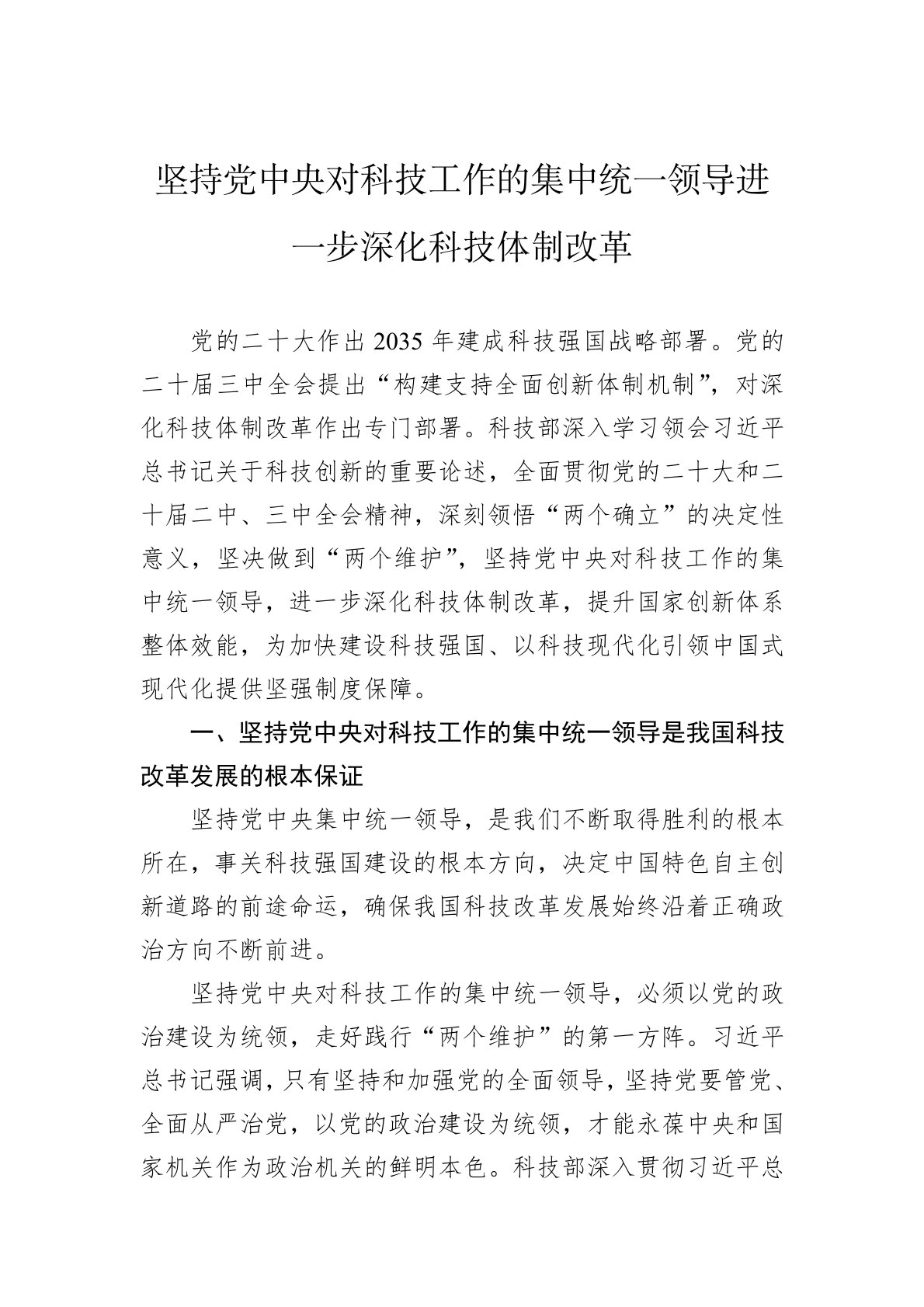 党的二十大作出2035年建成科技强国战略部署。党的二十届三中全会提出“构建支持全面创新体制机制”,对深化科技体制改革作出专门部署。科技部深入学习领会习近平总书记关于科技创新的重要论述,全面贯彻党的二十大和二十届二中、三中全会精神,深刻领悟“两个确立”的决定性意义,坚决做到“两个维护”,坚持党中央对科技工作的集中统一领导,进一步深化科技体制改革,提升国家创新体系整体效能,为加快建设科技强国、以科技现代化引领中国式现代化提供坚强制度保障。一、坚持党中央对科技工作的集中统一领导是我国科技改革发展的根本保证坚持党中央集中统一领导,是我们不断取得胜利的根本所在,事关科技强国建设的根本方向,决定中国特色自...