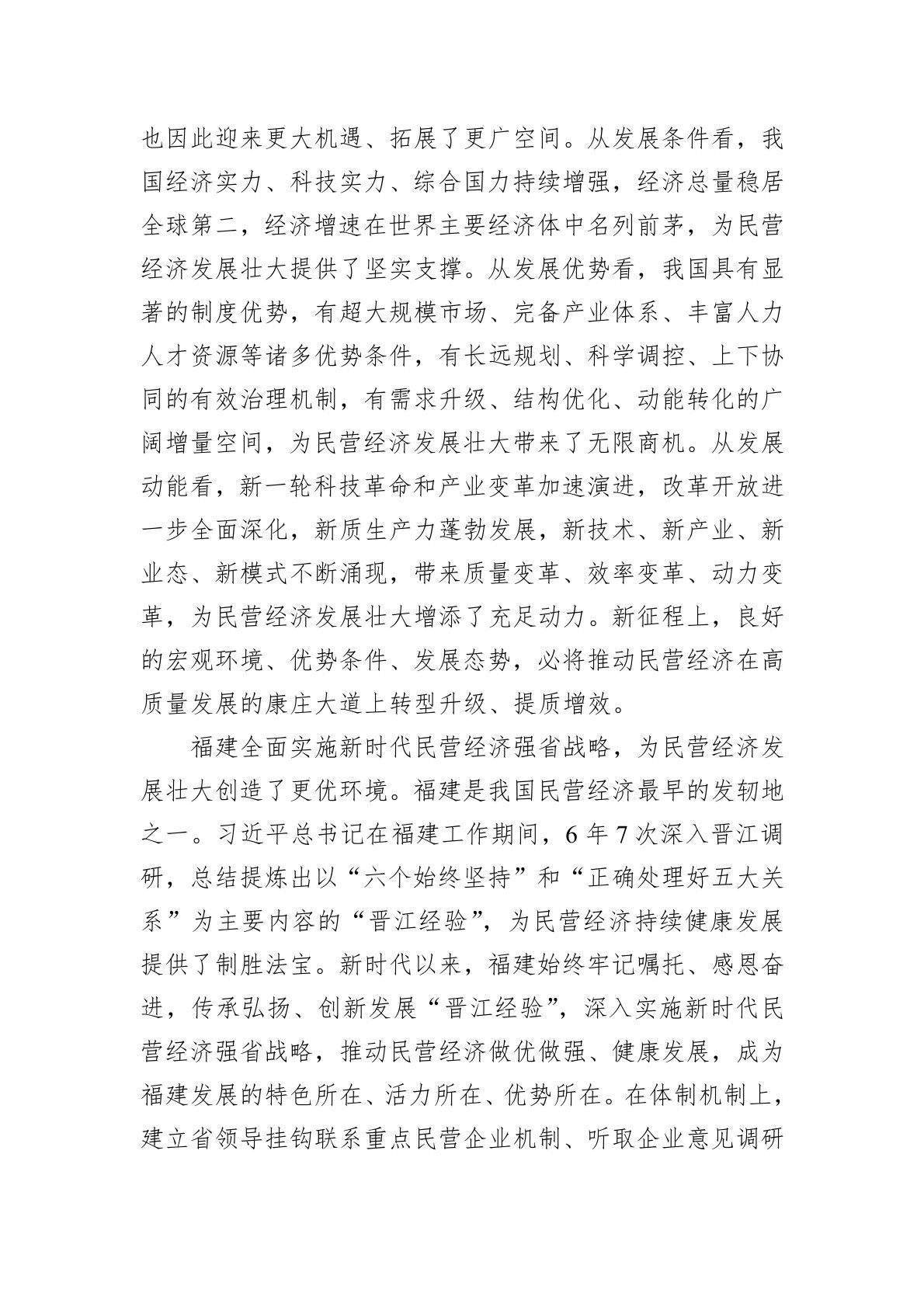 今年2月,习近平总书记出席民营企业座谈会并发表重要讲话,充分肯定民营经济的重要地位和作用,精辟概括并强调一以贯之坚持和落实党和国家对民营经济发展的基本方针政策,深刻阐明扎扎实实落实促进民营经济发展的政策措施是当前工作重点,殷切希望广大民营企业和民营企业家胸怀报国志、一心谋发展、守法善经营、先富促共富。这些重要论述,与党的十八大以来习近平总书记关于民营经济发展的重要论述一以贯之,与习近平总书记在福建工作期间关心重视支持民营经济发展的重要理念和重大实践一脉相承,让广大民营企业和民营企业家再次吃下了安心谋发展的“定心丸”,为新时代新征程民营经济健康发展、高质量发展指明了前进方向、提供了根本遵循。我们...