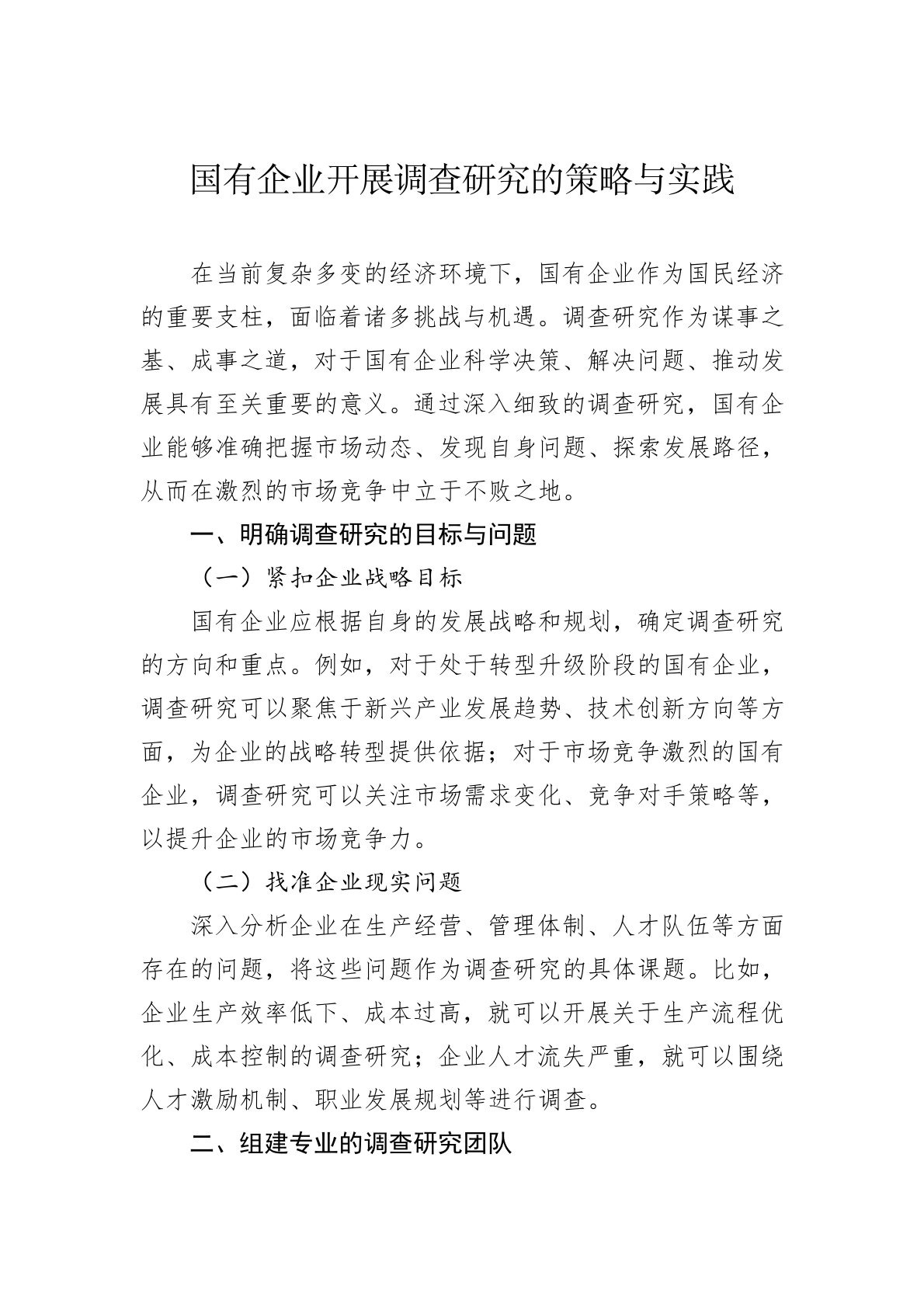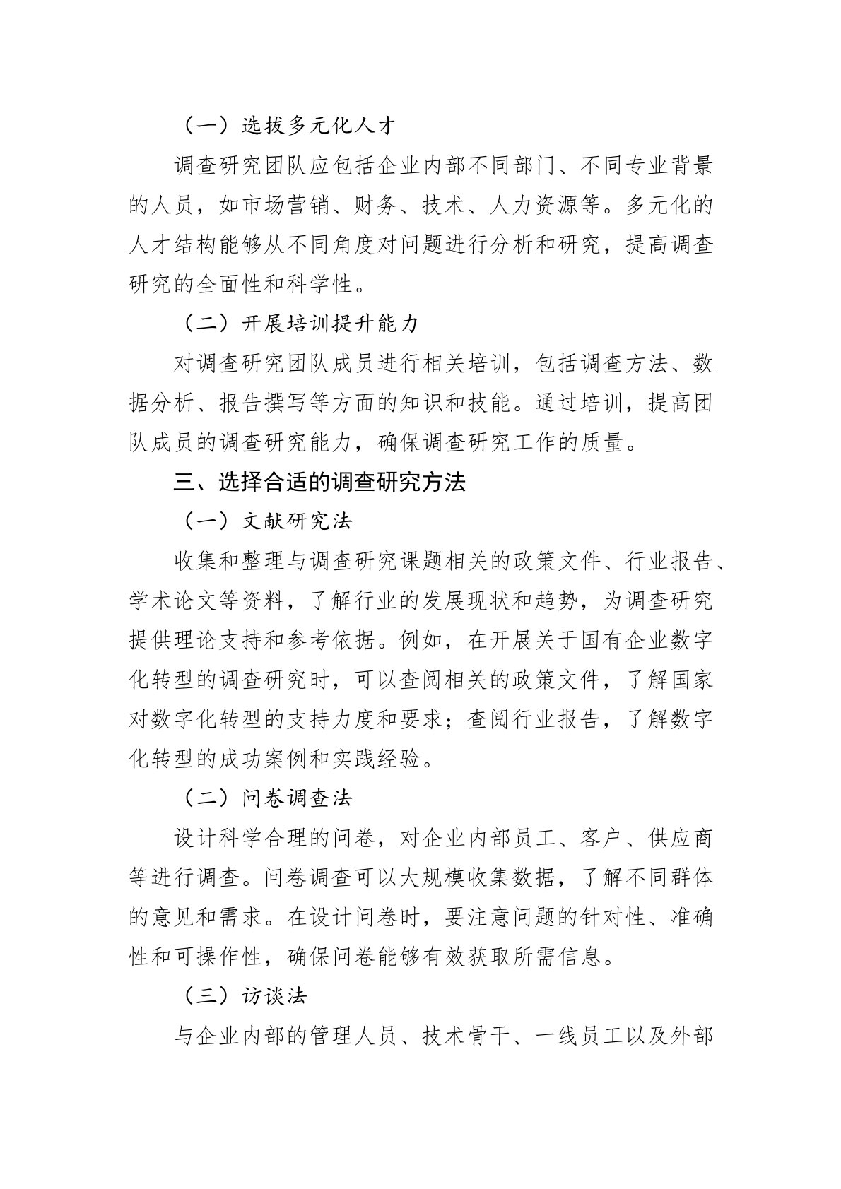 在当前复杂多变的经济环境下,国有企业作为国民经济的重要支柱,面临着诸多挑战与机遇。调查研究作为谋事之基、成事之道,对于国有企业科学决策、解决问题、推动发展具有至关重要的意义。通过深入细致的调查研究,国有企业能够准确把握市场动态、发现自身问题、探索发展路径,从而在激烈的市场竞争中立于不败之地。一、明确调查研究的目标与问题(一)紧扣企业战略目标国有企业应根据自身的发展战略和规划,确定调查研究的方向和重点。例如,对于处于转型升级阶段的国有企业,调查研究可以聚焦于新兴产业发展趋势、技术创新方向等方面,为企业的战略转型提供依据;对于市场竞争激烈的国有企业,调查研究可以关注市场需求变化、竞争对手策略等,以...
