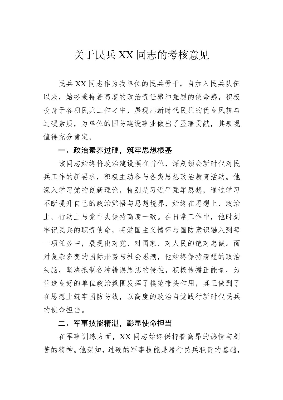关于民兵XX同志的考核意见