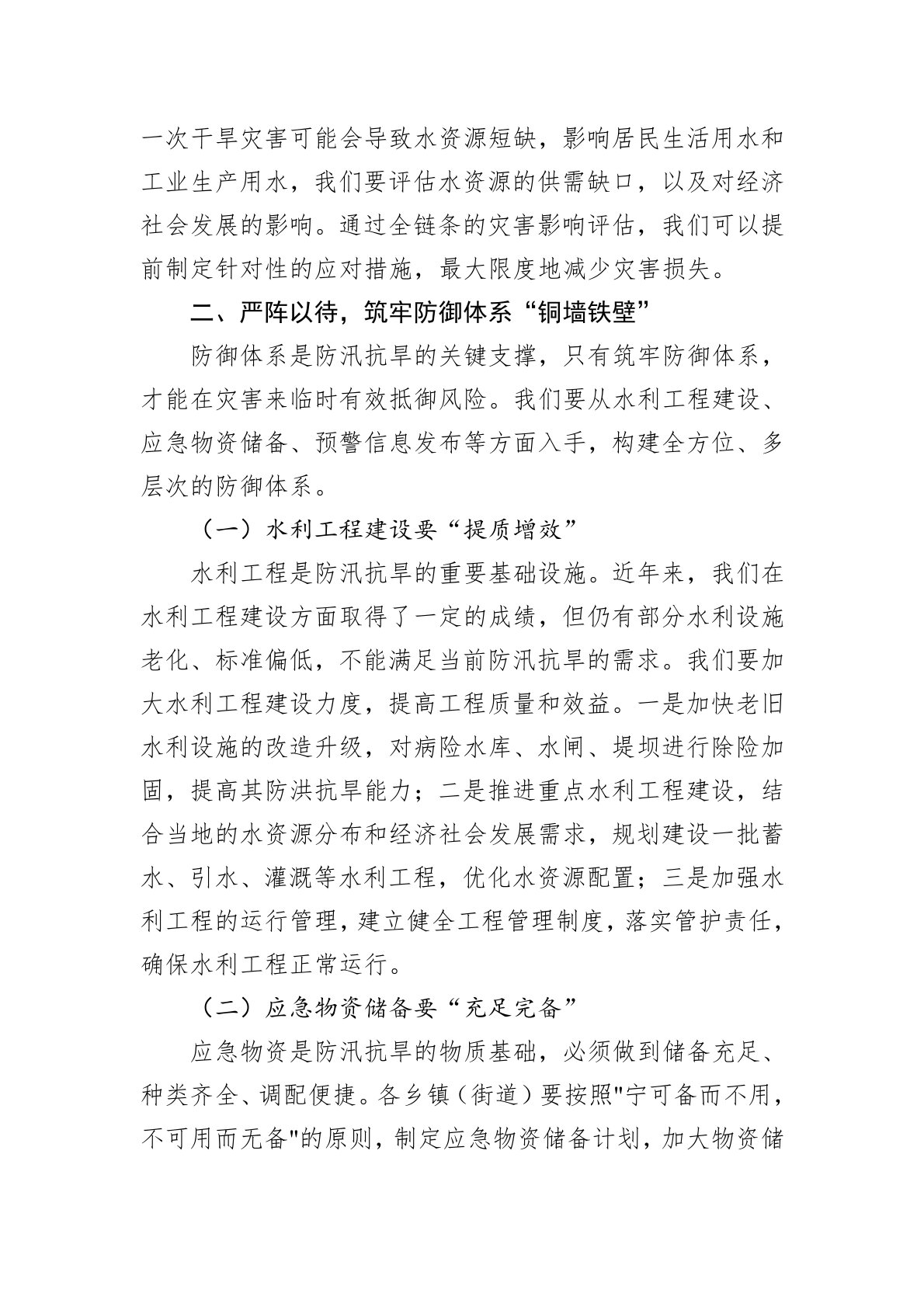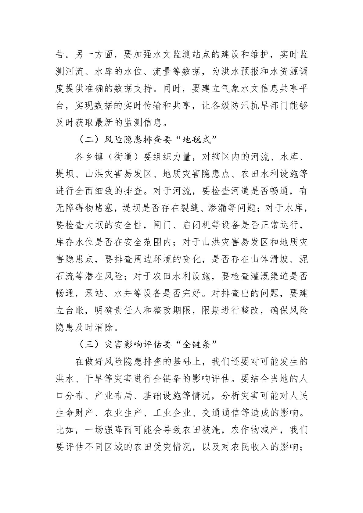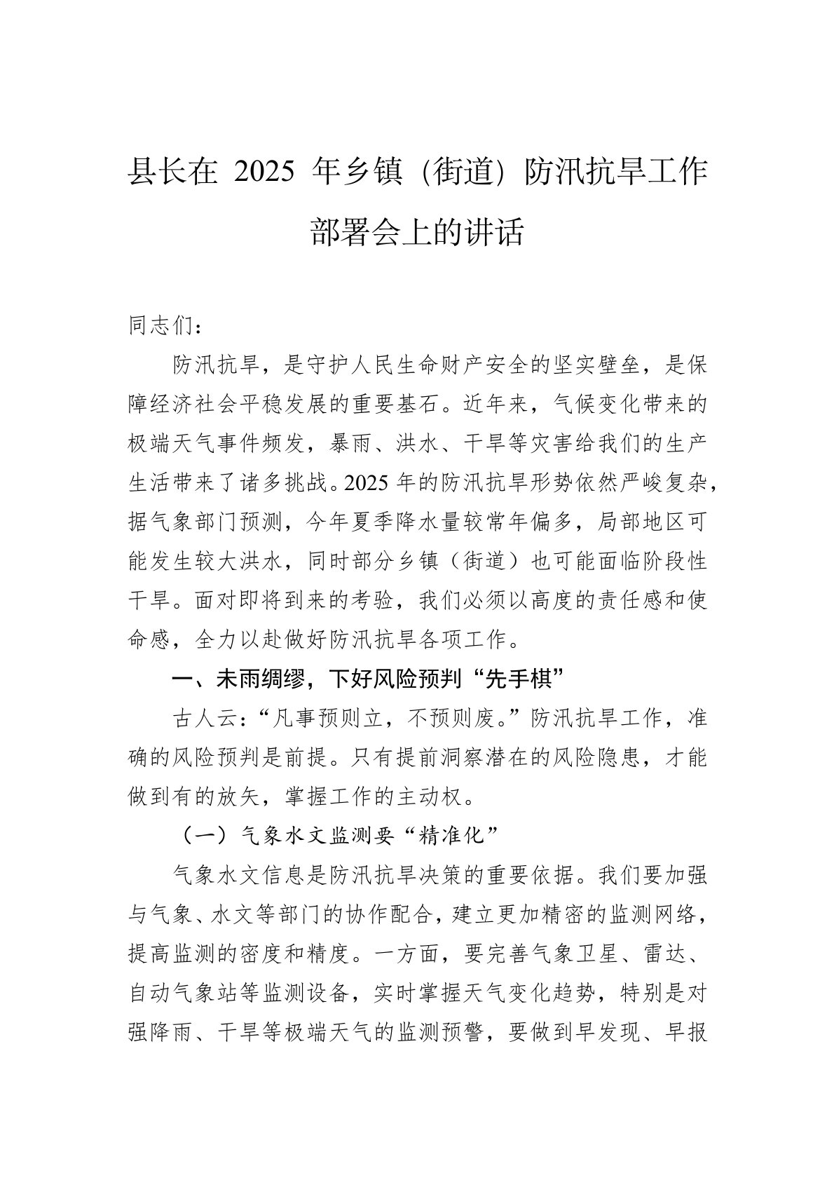 同志们:防汛抗旱,是守护人民生命财产安全的坚实壁垒,是保障经济社会平稳发展的重要基石。近年来,气候变化带来的极端天气事件频发,暴雨、洪水、干旱等灾害给我们的生产生活带来了诸多挑战。2025年的防汛抗旱形势依然严峻复杂,据气象部门预测,今年夏季降水量较常年偏多,局部地区可能发生较大洪水,同时部分乡镇(街道)也可能面临阶段性干旱。面对即将到来的考验,我们必须以高度的责任感和使命感,全力以赴做好防汛抗旱各项工作。一、未雨绸缪,下好风险预判“先手棋”古人云:“凡事预则立,不预则废。”防汛抗旱工作,准确的风险预判是前提。只有提前洞察潜在的风险隐患,才能做到有的放矢,掌握工作的主动权。(一)气象水文监测要...