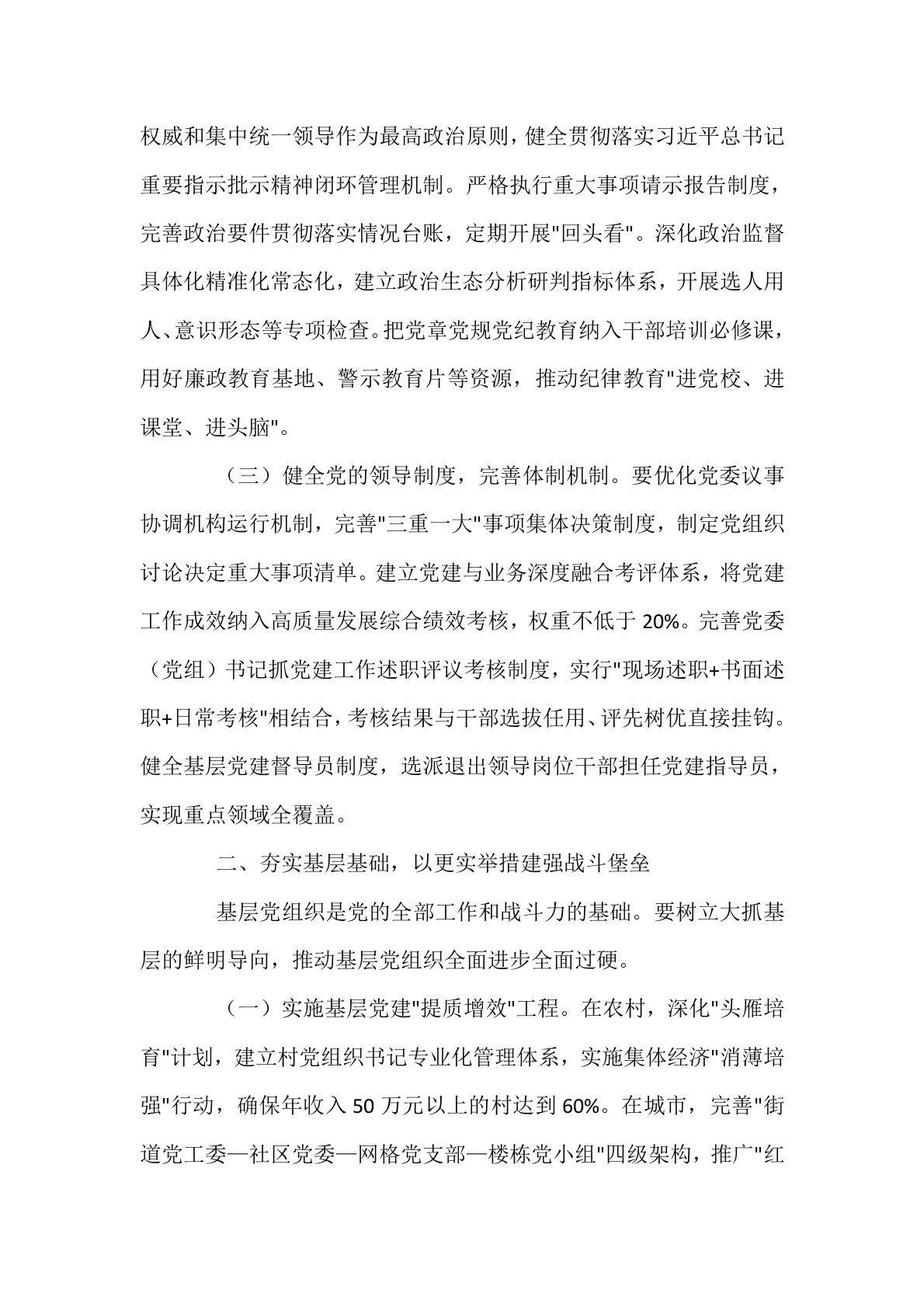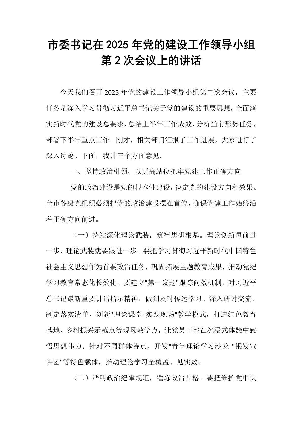 市委书记在2025年党的建设工作领导小组第2次会议上的讲话今天我们召开2025年党的建设工作领导小组第二次会议,主要任务是深入学习贯彻习近平总书记关于党的建设的重要思想,全面落实新时代党的建设总要求,总结上半年工作成效,分析当前形势任务,部署下半年重点工作。刚才,相关部门汇报了工作进展,大家进行了深入讨论。下面,我讲三个方面意见。一、坚持政治引领,以更高站位把牢党建工作正确方向党的政治建设是党的根本性建设,决定党的建设方向和效果。全市各级党组织必须把党的政治建设摆在首位,确保党建工作始终沿着正确方向前进。(一)持续深化理论武装,筑牢思想根基。理论创新每前进一步,理论武装就要跟进一步。要把学习贯...
