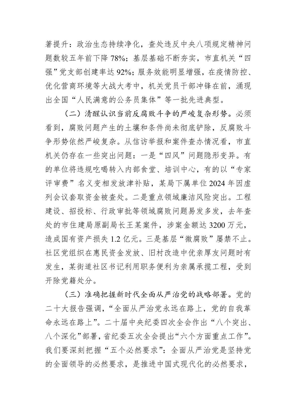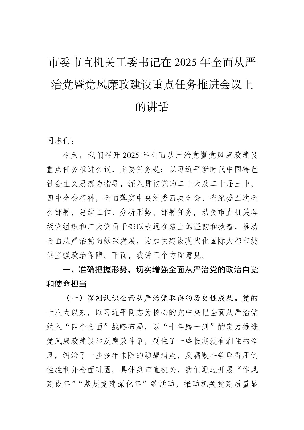 同志们:今天,我们召开2025年全面从严治党暨党风廉政建设重点任务推进会议,主要任务是:以习近平新时代中国特色社会主义思想为指导,深入贯彻党的二十大及二十届三中、四中全会精神,全面落实中央纪委四次全会、省纪委五次全会部署,总结工作、分析形势、部署任务,动员市直机关各级党组织和广大党员干部以永远在路上的坚韧和执着,推动全面从严治党向纵深发展,为加快建设现代化国际大都市提供坚强政治保障。下面,我讲三个方面意见。一、准确把握形势,切实增强全面从严治党的政治自觉和使命担当(一)深刻认识全面从严治党取得的历史性成就。党的十八大以来,以习近平同志为核心的党中央把全面从严治党纳入“四个全面”战略布局,以“十...
