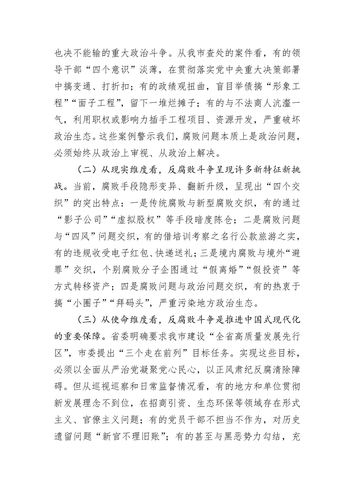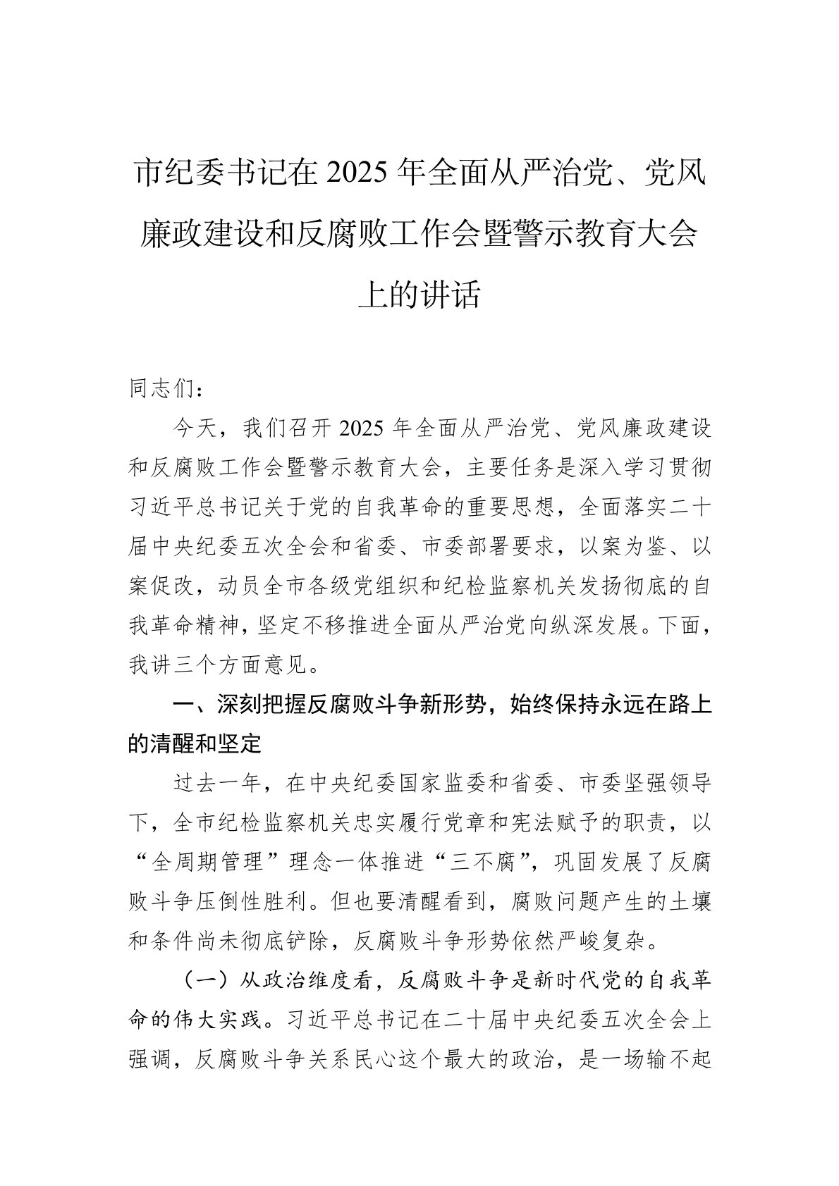 同志们:今天,我们召开2025年全面从严治党、党风廉政建设和反腐败工作会暨警示教育大会,主要任务是深入学习贯彻习近平总书记关于党的自我革命的重要思想,全面落实二十届中央纪委五次全会和省委、市委部署要求,以案为鉴、以案促改,动员全市各级党组织和纪检监察机关发扬彻底的自我革命精神,坚定不移推进全面从严治党向纵深发展。下面,我讲三个方面意见。一、深刻把握反腐败斗争新形势,始终保持永远在路上的清醒和坚定过去一年,在中央纪委国家监委和省委、市委坚强领导下,全市纪检监察机关忠实履行党章和宪法赋予的职责,以“全周期管理”理念一体推进“三不腐”,巩固发展了反腐败斗争压倒性胜利。但也要清醒看到,腐败问题产生的土...