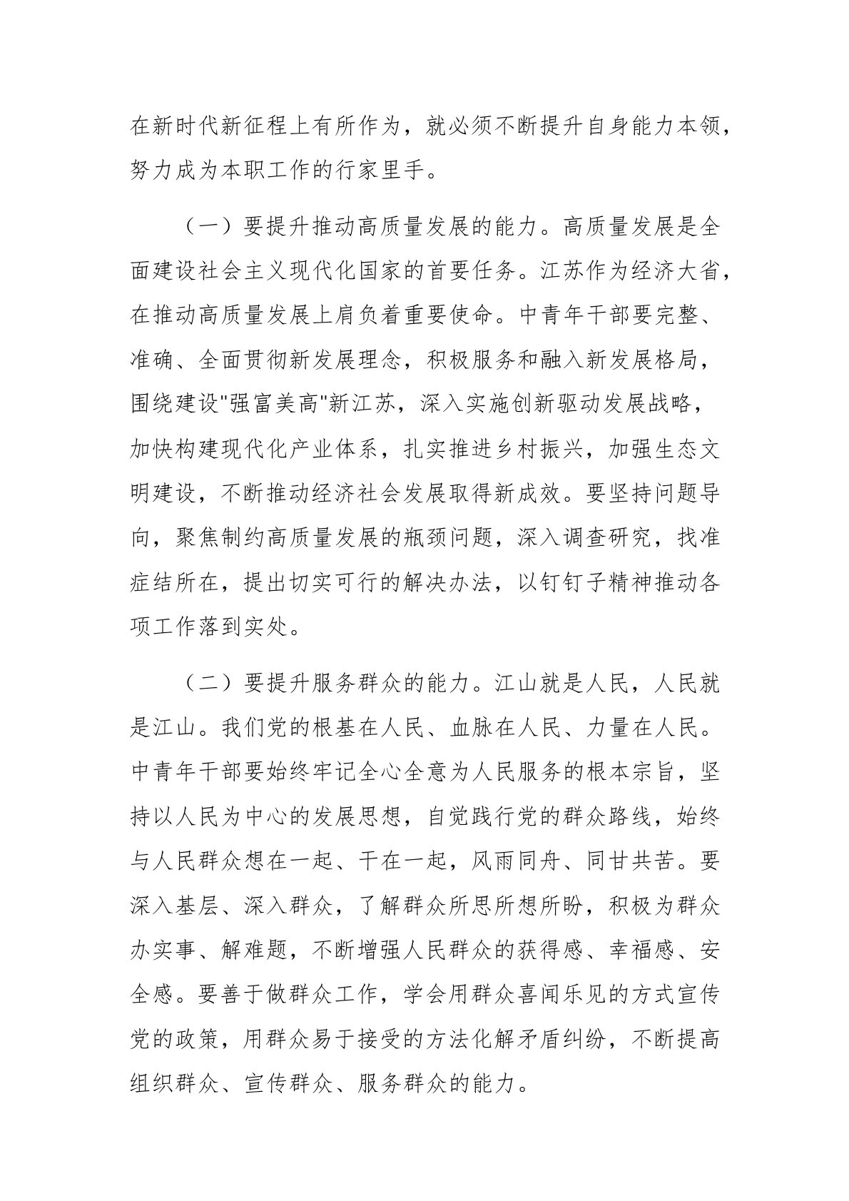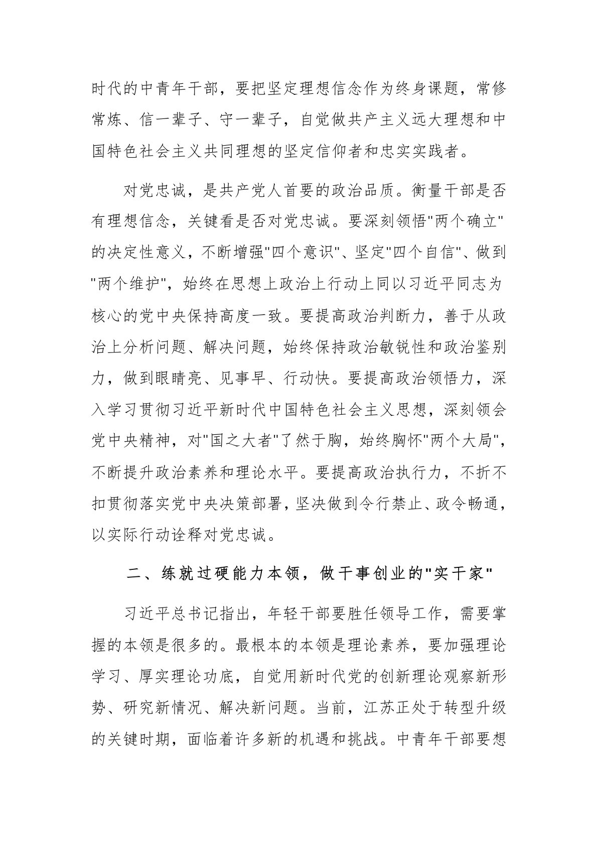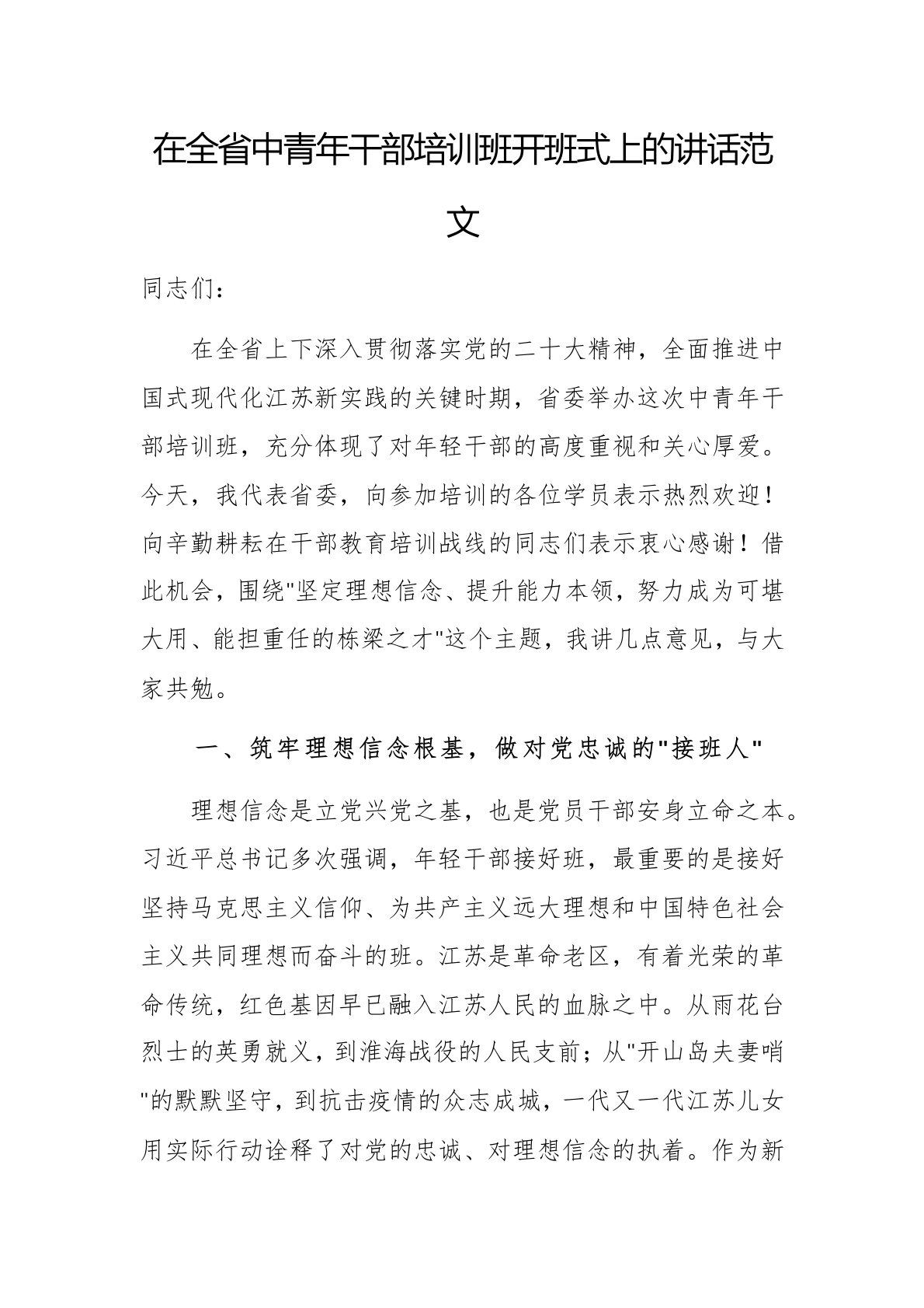 在全省中青年干部培训班开班式上的讲话范文同志们:在全省上下深入贯彻落实党的二十大精神,全面推进中国式现代化江苏新实践的关键时期,省委举办这次中青年干部培训班,充分体现了对年轻干部的高度重视和关心厚爱。今天,我代表省委,向参加培训的各位学员表示热烈欢迎!向辛勤耕耘在干部教育培训战线的同志们表示衷心感谢!借此机会,围绕"坚定理想信念、提升能力本领,努力成为可堪大用、能担重任的栋梁之才"这个主题,我讲几点意见,与大家共勉。一、筑牢理想信念根基,做对党忠诚的"接班人"理想信念是立党兴党之基,也是党员干部安身立命之本。习近平总书记多次强调,年轻干部接好班,最重要的是接好坚持马克思主义信仰、为共产主义远大...