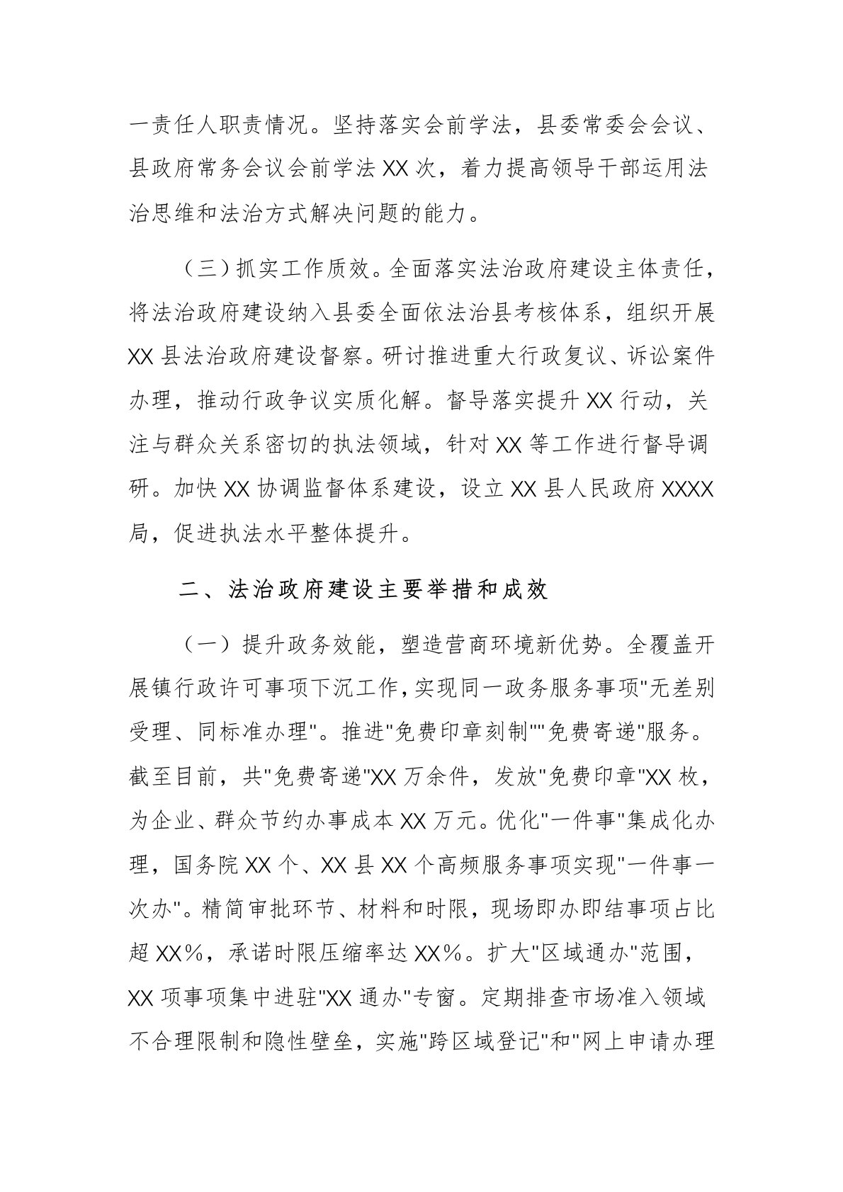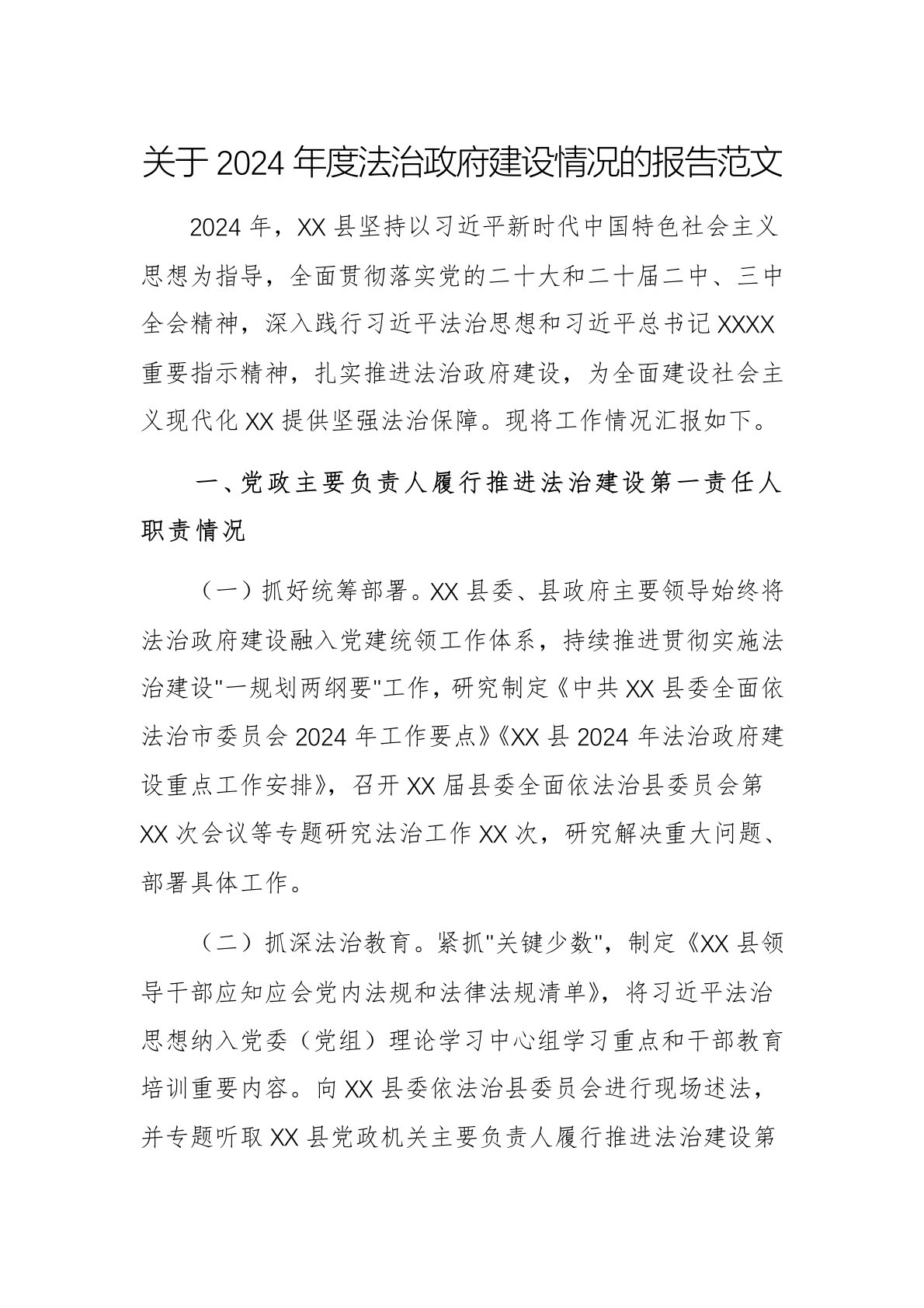 关于2024年度法治政府建设情况的报告范文2024年,XX县坚持以习近平新时代中国特色社会主义思想为指导,全面贯彻落实党的二十大和二十届二中、三中全会精神,深入践行习近平法治思想和习近平总书记习近平X重要指示精神,扎实推进法治政府建设,为全面建设社会主义现代化XX提供坚强法治保障。现将工作情况汇报如下。一、党政主要负责人履行推进法治建设第一责任人职责情况(一)抓好统筹部署。XX县委、县政府主要领导始终将法治政府建设融入党建统领工作体系,持续推进贯彻实施法治建设"一规划两纲要"工作,研究制定《中共XX县委全面依法治市委员会2024年工作要点》《XX县2024年法治政府建设重点工作安排》,召开XX...
