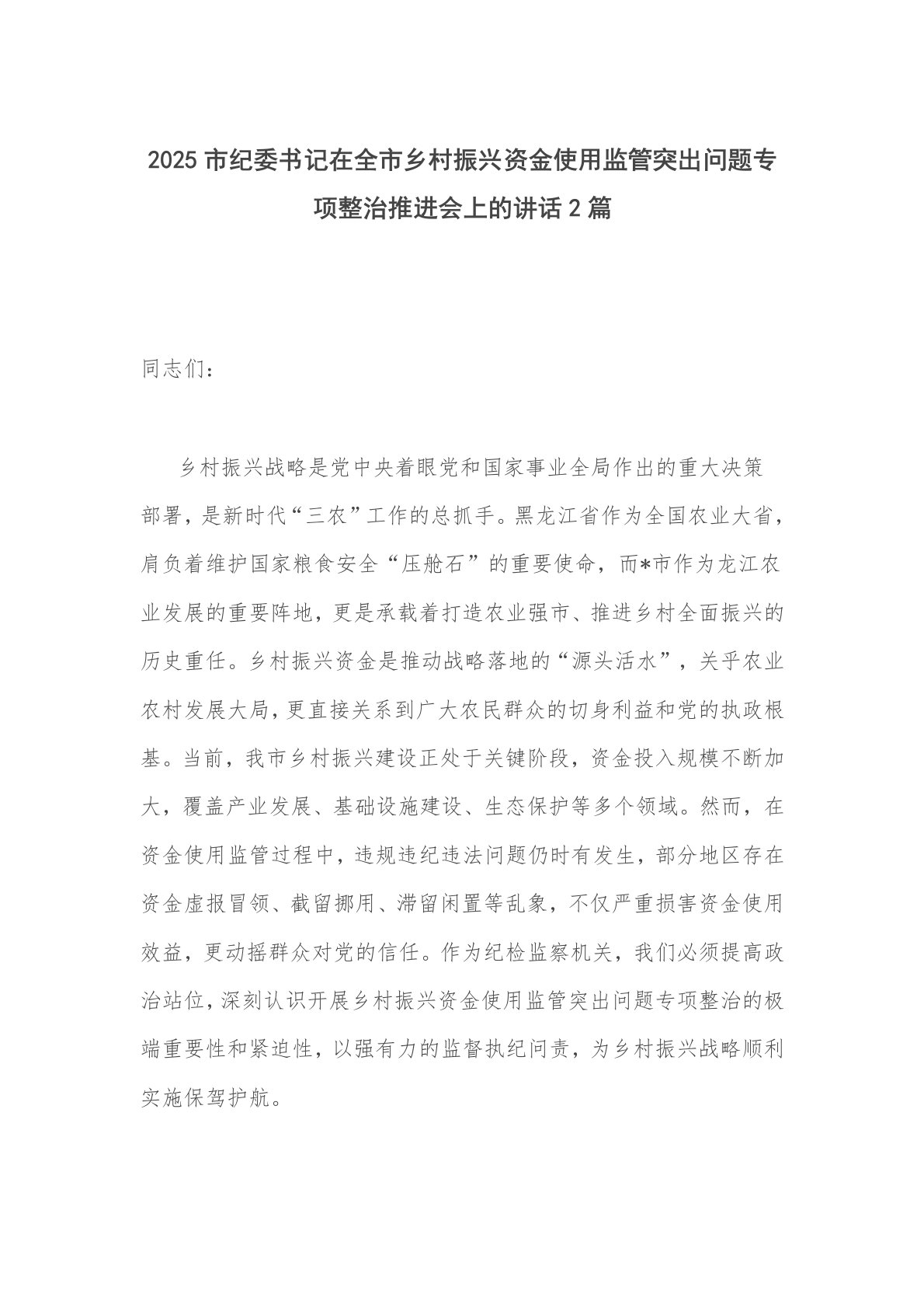 2025市纪委书记在全市乡村振兴资金使用监管突出问题专项整治推进会上的讲话2篇同志们:乡村振兴战略是党中央着眼党和国家事业全局作出的重大决策部署,是新时代“三农”工作的总抓手。黑龙江省作为全国农业大省,肩负着维护国家粮食安全“压舱石”的重要使命,而*市作为龙江农业发展的重要阵地,更是承载着打造农业强市、推进乡村全面振兴的历史重任。乡村振兴资金是推动战略落地的“源头活水”,关乎农业农村发展大局,更直接关系到广大农民群众的切身利益和党的执政根基。当前,我市乡村振兴建设正处于关键阶段,资金投入规模不断加大,覆盖产业发展、基础设施建设、生态保护等多个领域。然而,在资金使用监管过程中,违规违纪违法问题仍...