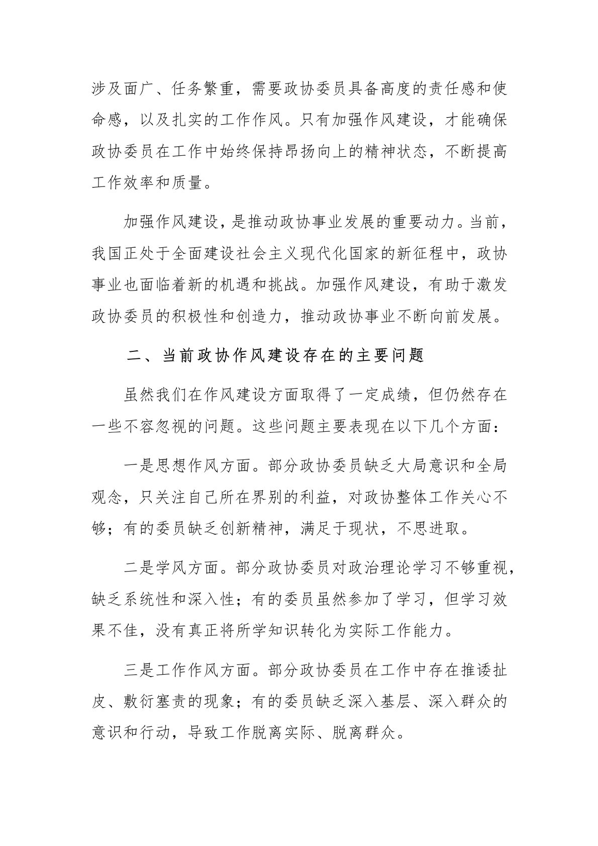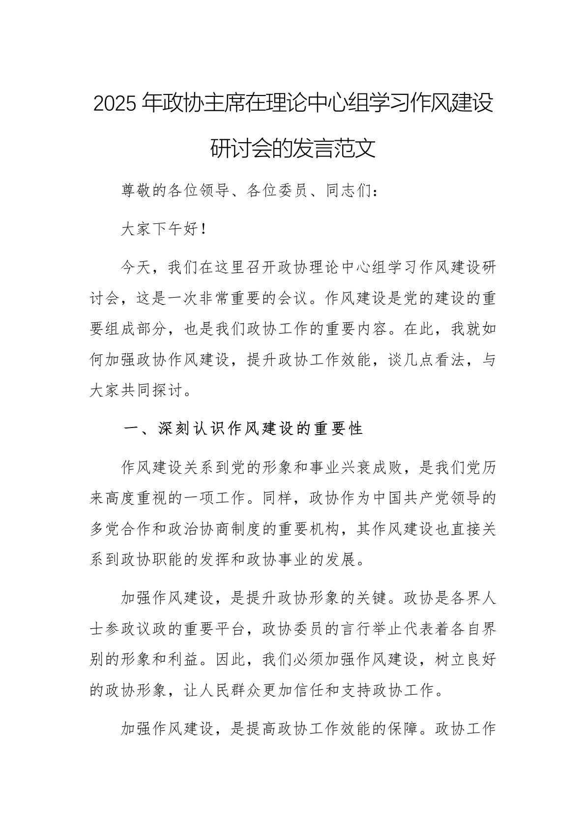 2025年政协主席在理论中心组学习作风建设研讨会的发言范文尊敬的各位领导、各位委员、同志们:大家下午好!今天,我们在这里召开政协理论中心组学习作风建设研讨会,这是一次非常重要的会议。作风建设是党的建设的重要组成部分,也是我们政协工作的重要内容。在此,我就如何加强政协作风建设,提升政协工作效能,谈几点看法,与大家共同探讨。一、深刻认识作风建设的重要性作风建设关系到党的形象和事业兴衰成败,是我们党历来高度重视的一项工作。同样,政协作为中国共产党领导的多党合作和政治协商制度的重要机构,其作风建设也直接关系到政协职能的发挥和政协事业的发展。加强作风建设,是提升政协形象的关键。政协是各界人士参政议政的重...