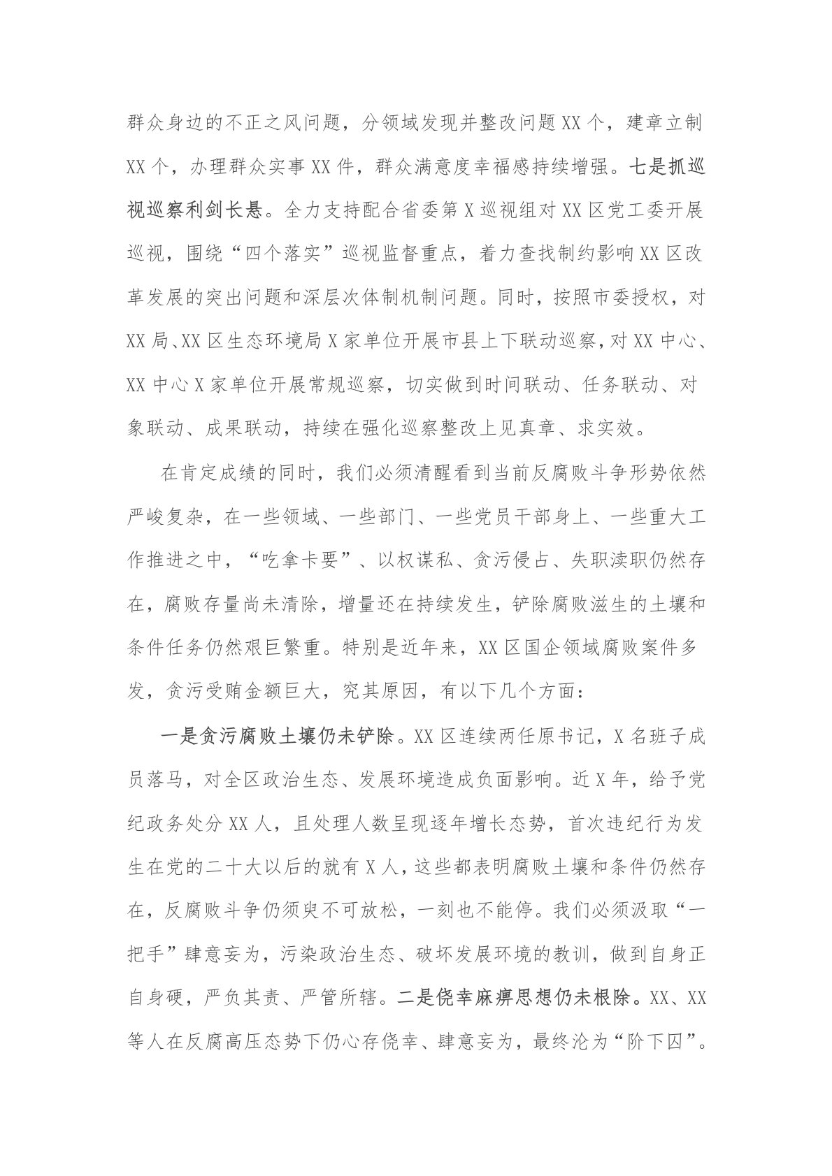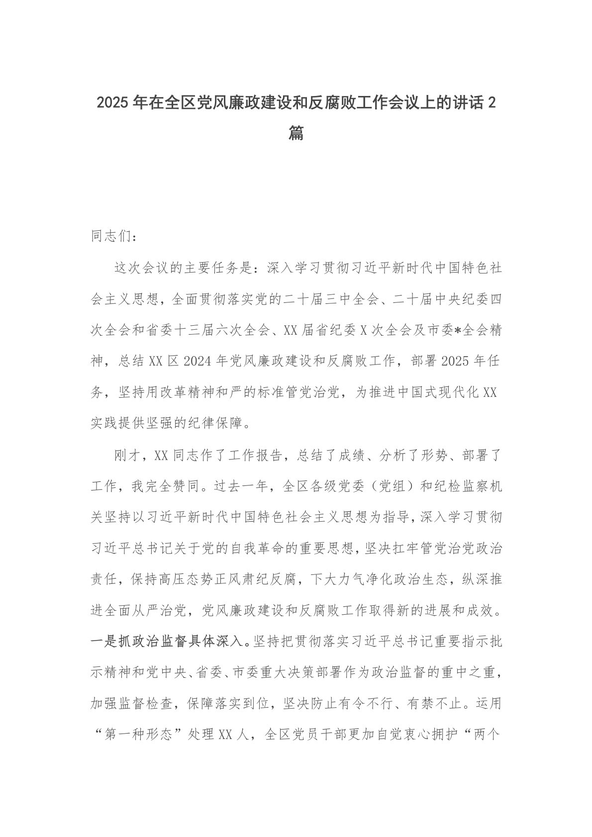 2025年在全区党风廉政建设和反腐败工作会议上的讲话2篇同志们:这次会议的主要任务是:深入学习贯彻习近平新时代中国特色社会主义思想,全面贯彻落实党的二十届三中全会、二十届中央纪委四次全会和省委十三届六次全会、XX届省纪委X次全会及市委*全会精神,总结XX区2024年党风廉政建设和反腐败工作,部署2025年任务,坚持用改革精神和严的标准管党治党,为推进中国式现代化XX实践提供坚强的纪律保障。刚才,XX同志作了工作报告,总结了成绩、分析了形势、部署了工作,我完全赞同。过去一年,全区各级党委(党组)和纪检监察机关坚持以习近平新时代中国特色社会主义思想为指导,深入学习贯彻习近平总书记关于党的自我革命的...