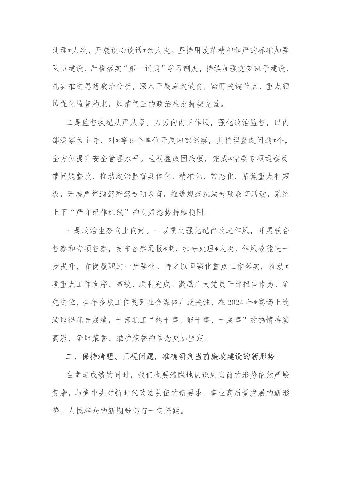 2025年在某机关党风廉政建设与反腐败工作会议上的讲话2篇同志们:今天会议主要任务是:学习贯彻习近平总书记关于党的自我革命的重要思想,以习近平新时代中国特色社会主义思想为指导,全面贯彻二十届中央纪委四次全会、省纪委十一届五次全会、全国*系统党风廉政建设会议精神,认真贯彻落实厅局党风廉政建设工作部署要求,纵深推进我单位党风廉政建设与反腐败工作。刚才,*书记对做好今年党风廉政建设和反腐败工作提出了具体要求,我完全同意。下面,我再讲三方面意见。一、从严从实、奋发进取,2024年*党风廉政建设取得新成效2024年,*各级党组织和纪检部门坚持以习近平新时代中国特色社会主义思想为指导,全面贯彻落实党风廉政...