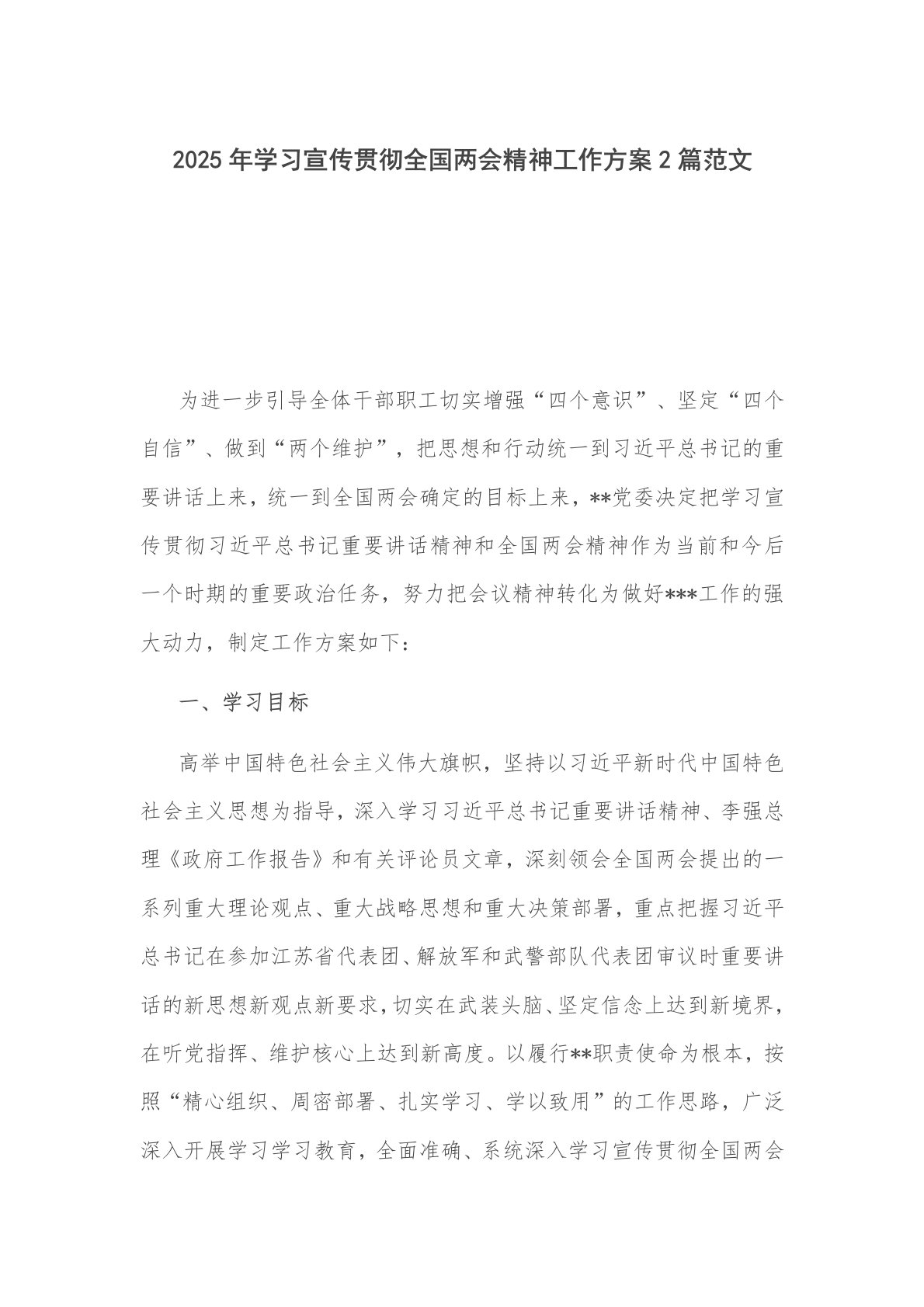 2025年学习宣传贯彻全国两会精神工作方案2篇范文