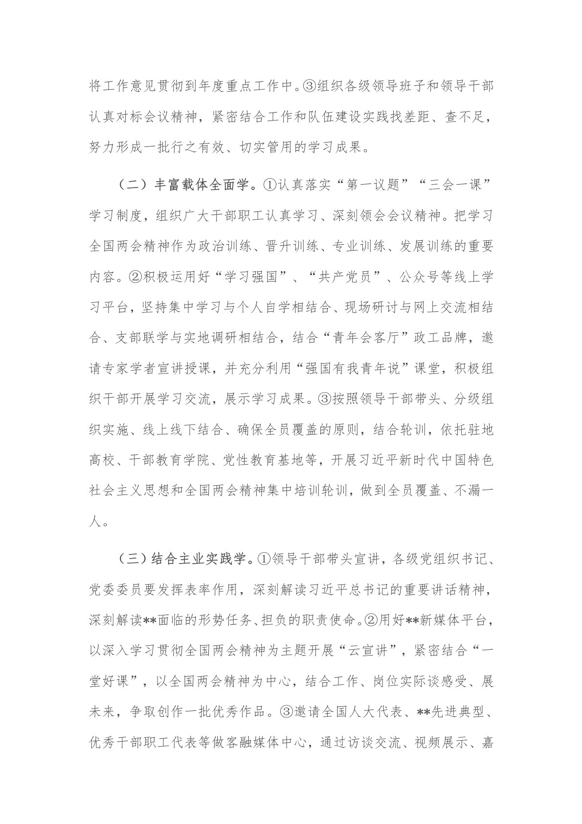 2025年学习宣传贯彻全国两会精神工作方案2篇范文为进一步引导全体干部职工切实增强“四个意识”、坚定“四个自信”、做到“两个维护”,把思想和行动统一到习近平总书记的重要讲话上来,统一到全国两会确定的目标上来,**党委决定把学习宣传贯彻习近平总书记重要讲话精神和全国两会精神作为当前和今后一个时期的重要政治任务,努力把会议精神转化为做好***工作的强大动力,制定工作方案如下:一、学习目标高举中国特色社会主义伟大旗帜,坚持以习近平新时代中国特色社会主义思想为指导,深入学习习近平总书记重要讲话精神、李强总理《政府工作报告》和有关评论员文章,深刻领会全国两会提出的一系列重大理论观点、重大战略思想和重大决...