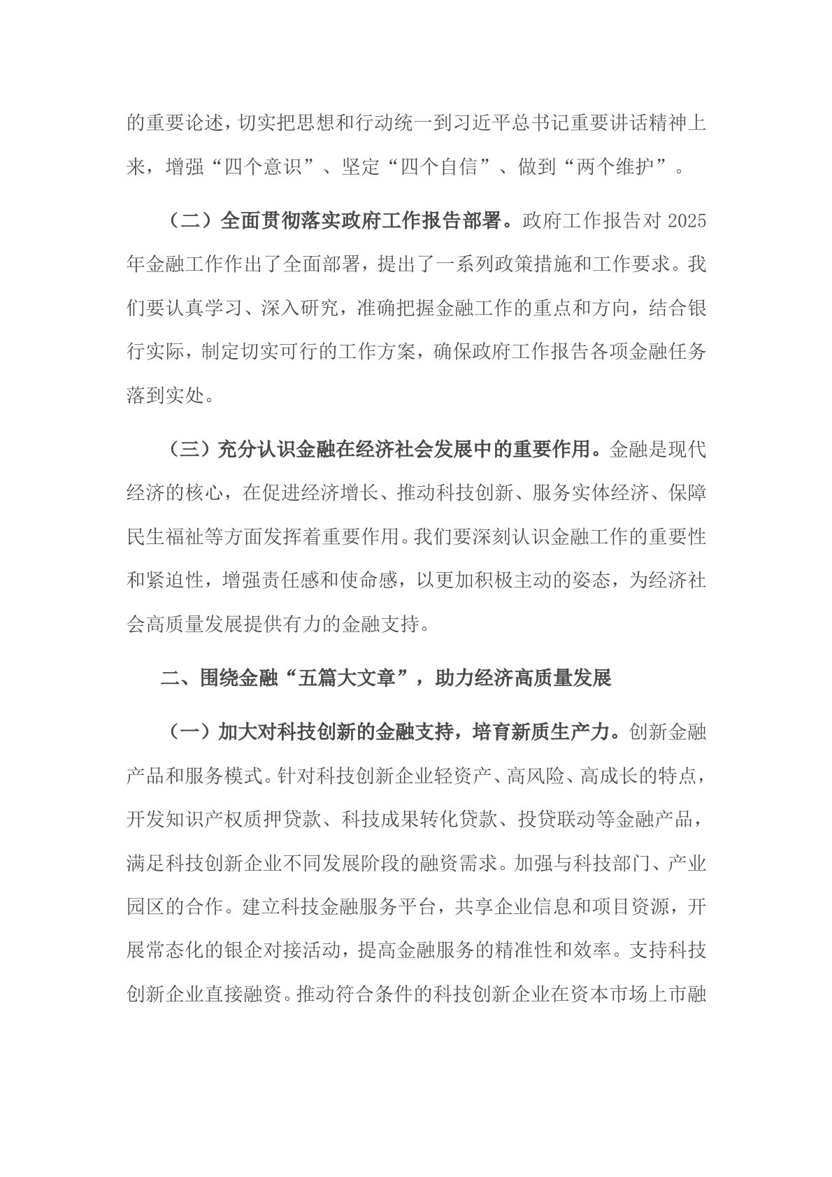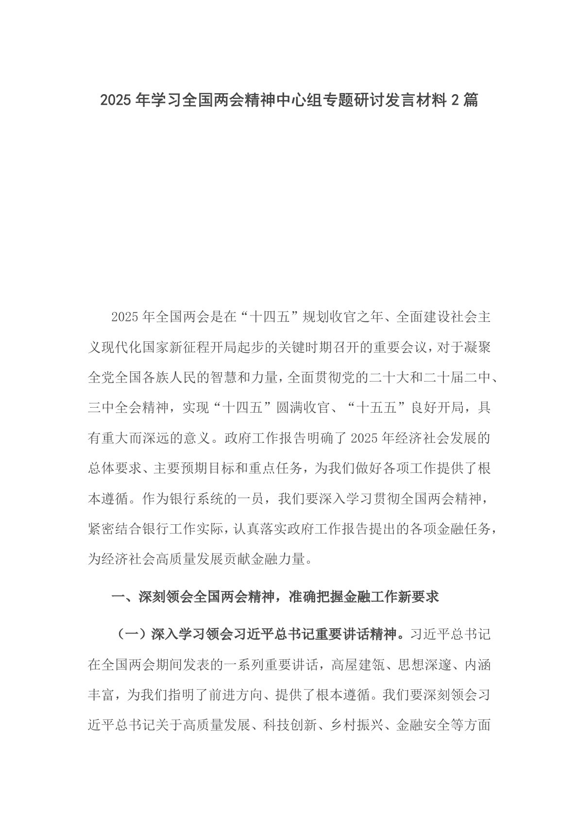 2025年学习全国两会精神中心组专题研讨发言材料2篇2025年全国两会是在“十四五”规划收官之年、全面建设社会主义现代化国家新征程开局起步的关键时期召开的重要会议,对于凝聚全党全国各族人民的智慧和力量,全面贯彻党的二十大和二十届二中、三中全会精神,实现“十四五”圆满收官、“十五五”良好开局,具有重大而深远的意义。政府工作报告明确了2025年经济社会发展的总体要求、主要预期目标和重点任务,为我们做好各项工作提供了根本遵循。作为银行系统的一员,我们要深入学习贯彻全国两会精神,紧密结合银行工作实际,认真落实政府工作报告提出的各项金融任务,为经济社会高质量发展贡献金融力量。一、深刻领会全国两会精神,准...