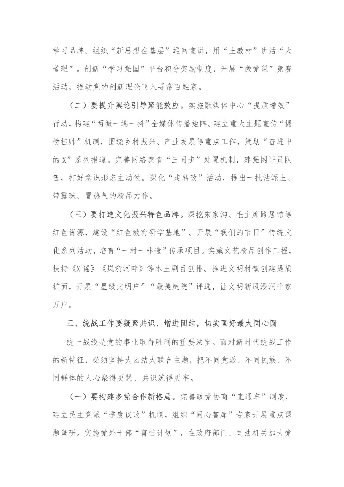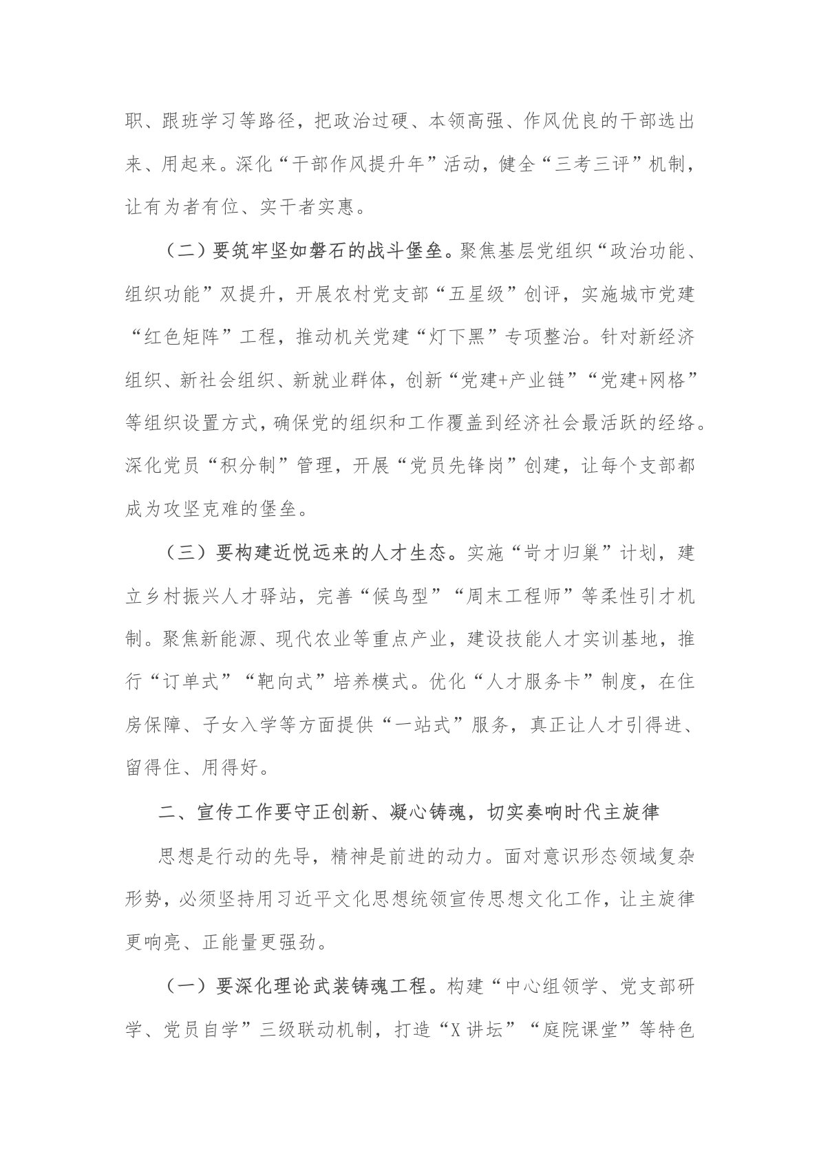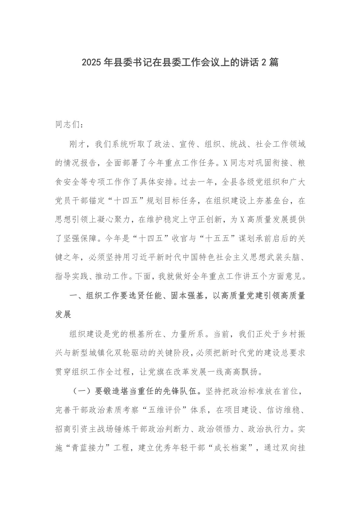 2025年县委书记在县委工作会议上的讲话2篇同志们:刚才,我们系统听取了政法、宣传、组织、统战、社会工作领域的情况报告,全面部署了今年重点工作任务。X同志对巩固衔接、粮食安全等专项工作作了具体安排。过去一年,全县各级党组织和广大党员干部锚定“十四五”规划目标任务,在组织建设上夯基垒台,在思想引领上凝心聚力,在维护稳定上守正创新,为X高质量发展提供了坚强保障。今年是“十四五”收官与“十五五”谋划承前启后的关键之年,必须坚持用习近平新时代中国特色社会主义思想武装头脑、指导实践、推动工作。下面,我就做好全年重点工作讲五个方面意见。一、组织工作要选贤任能、固本强基,以高质量党建引领高质量发展组织建设是...
